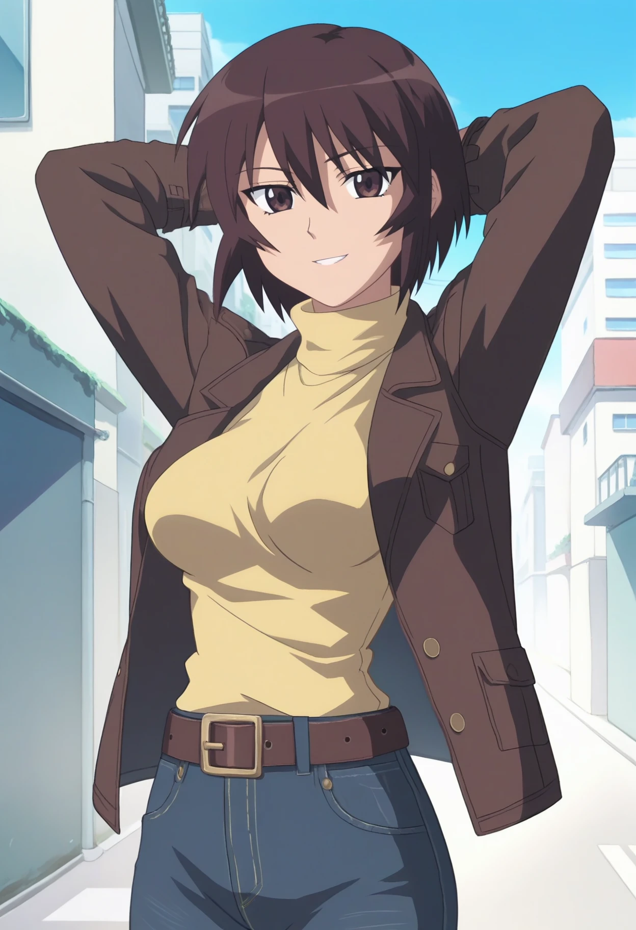 brown jacket, open jacket, turtleneck sweater, yellow sweater, belt, jeans,