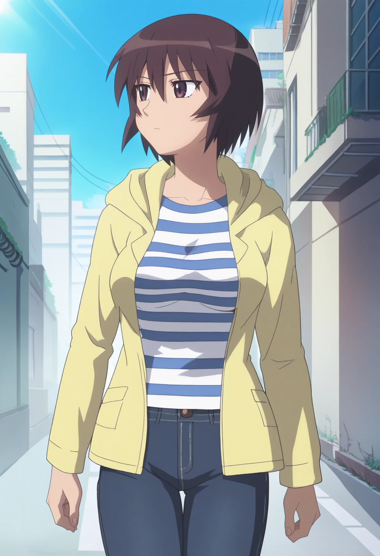 yellow hoodie, striped shirt, jeans,