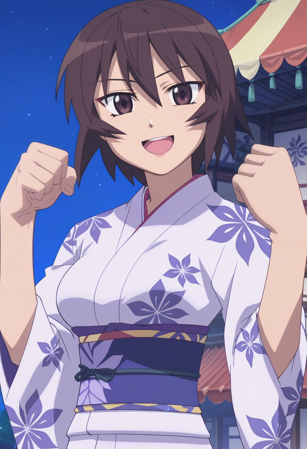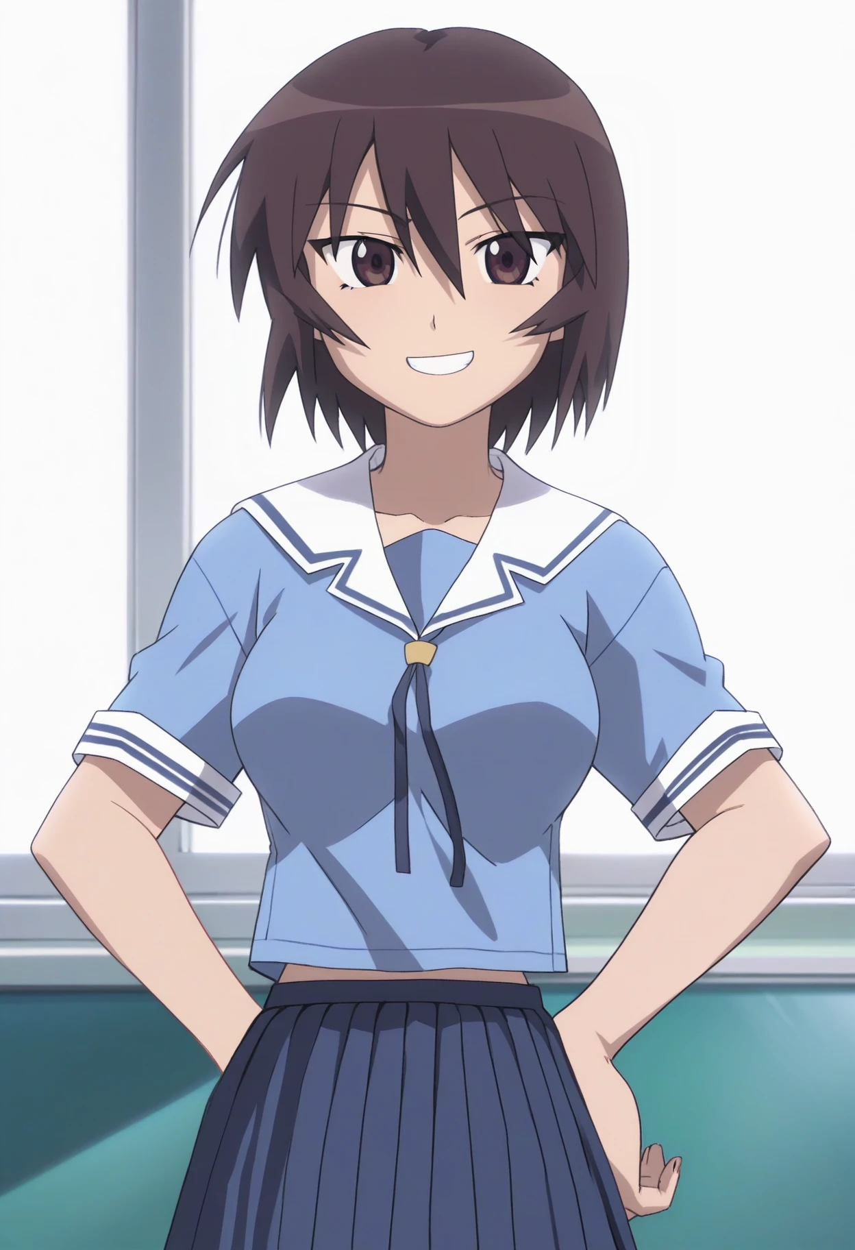 AMKagura, 1girl, short hair, brown hair, hair between eyes, brown eyes, breasts,
