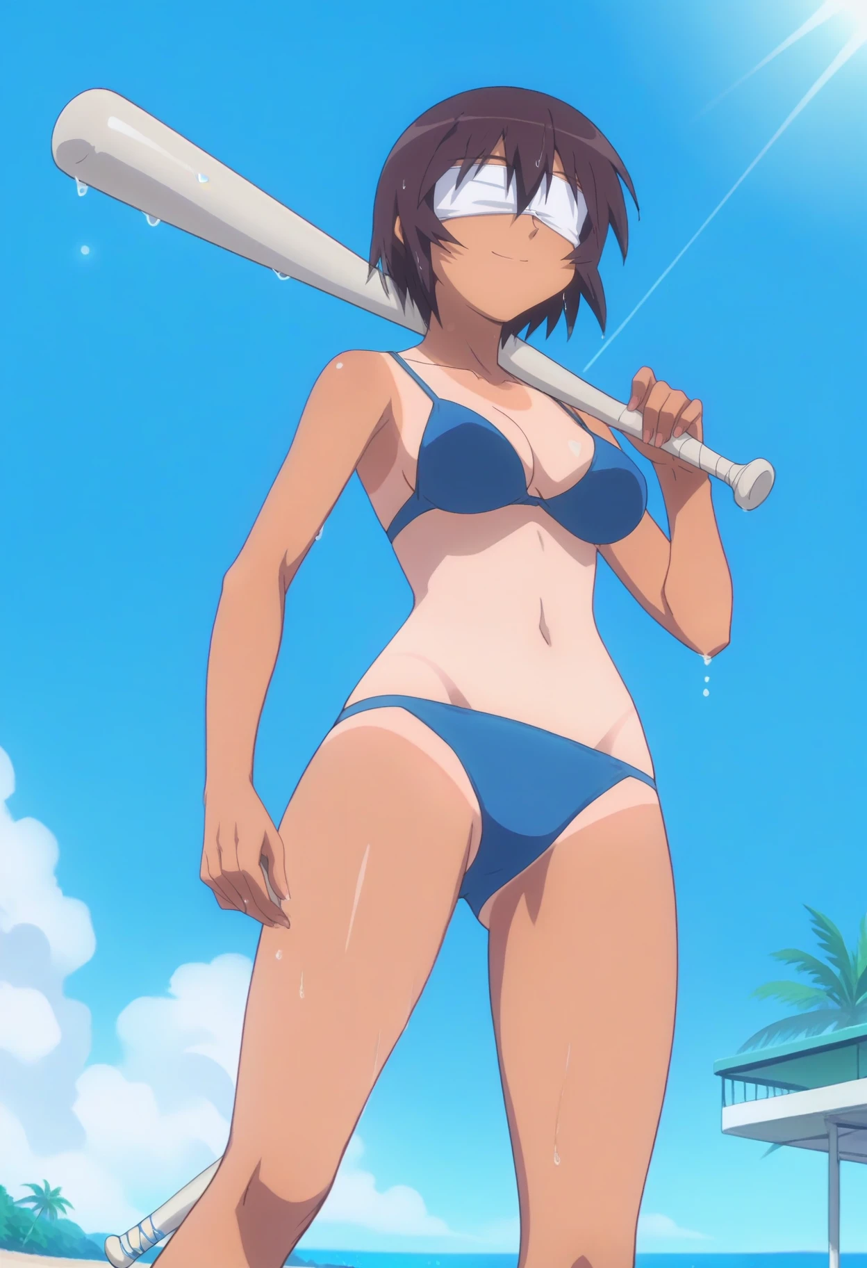 one-piece tan, tanlines, blue bikini,