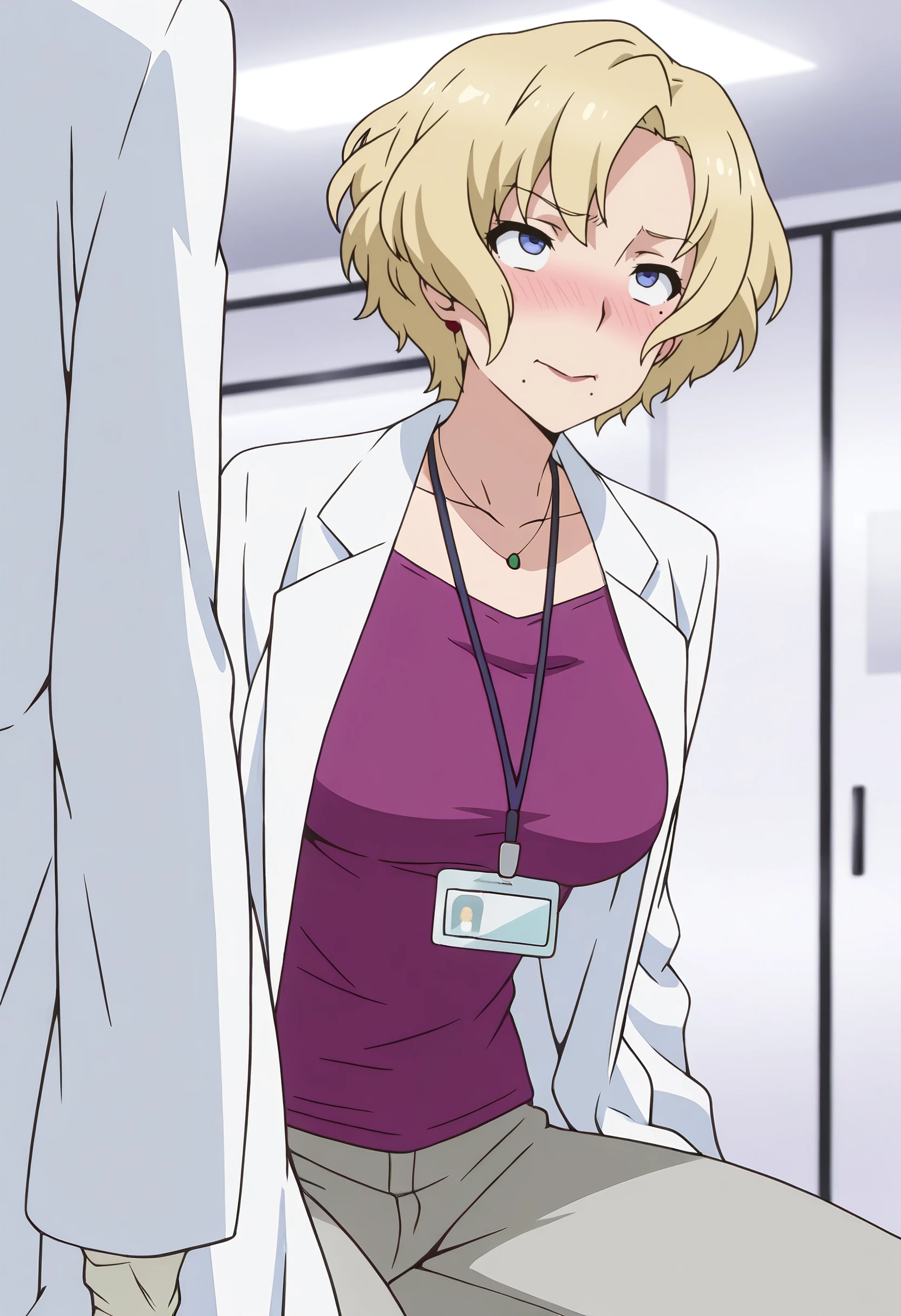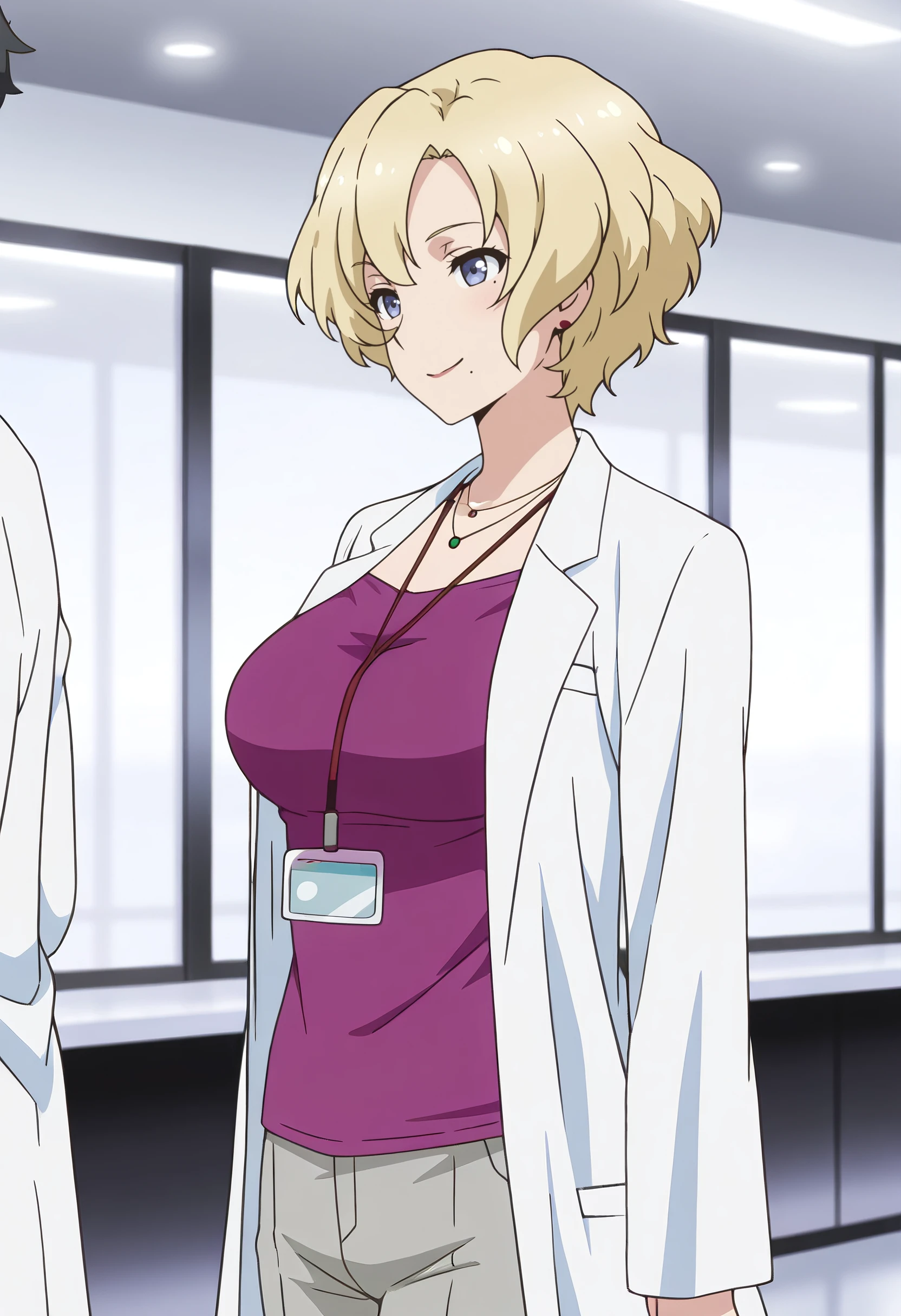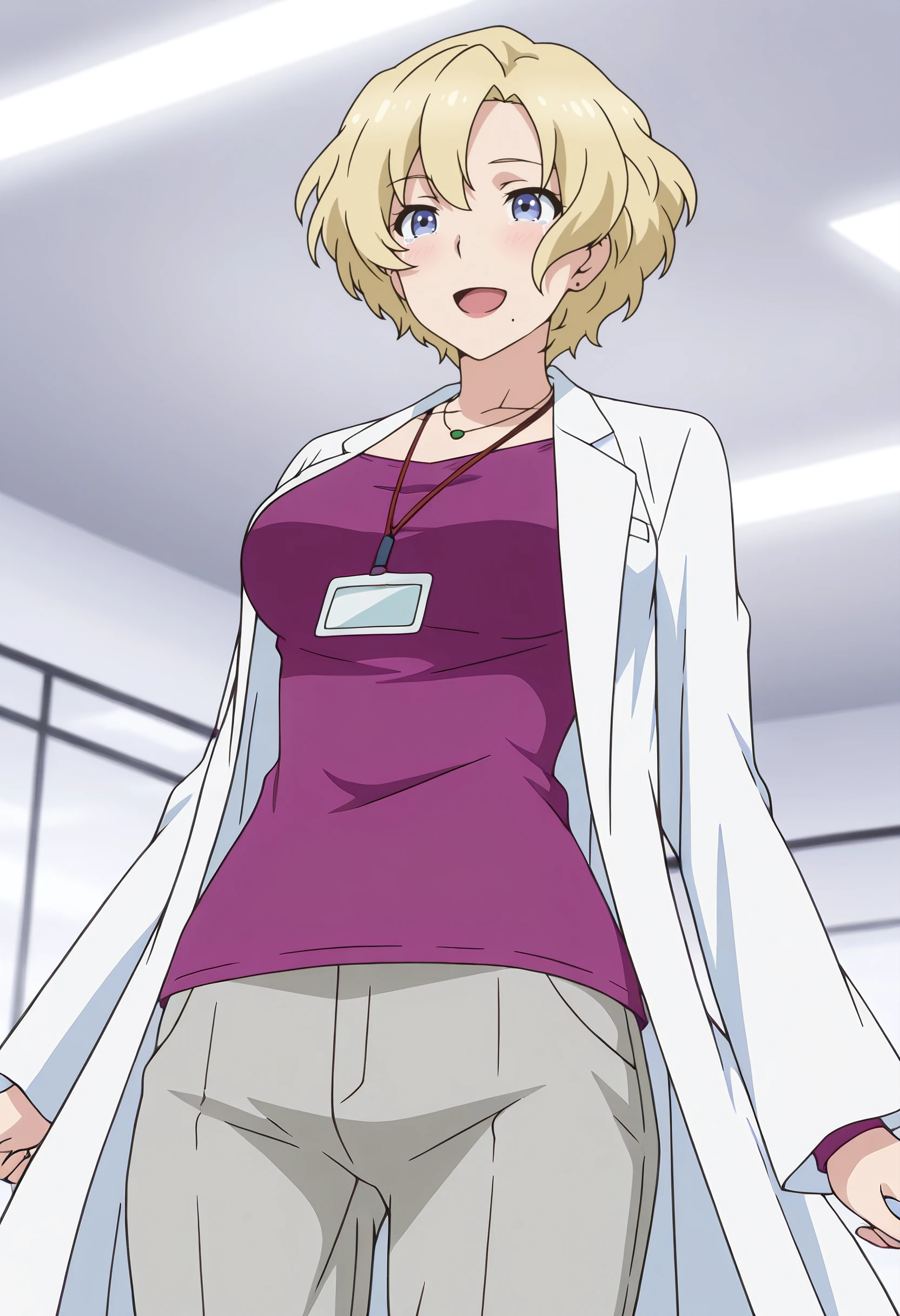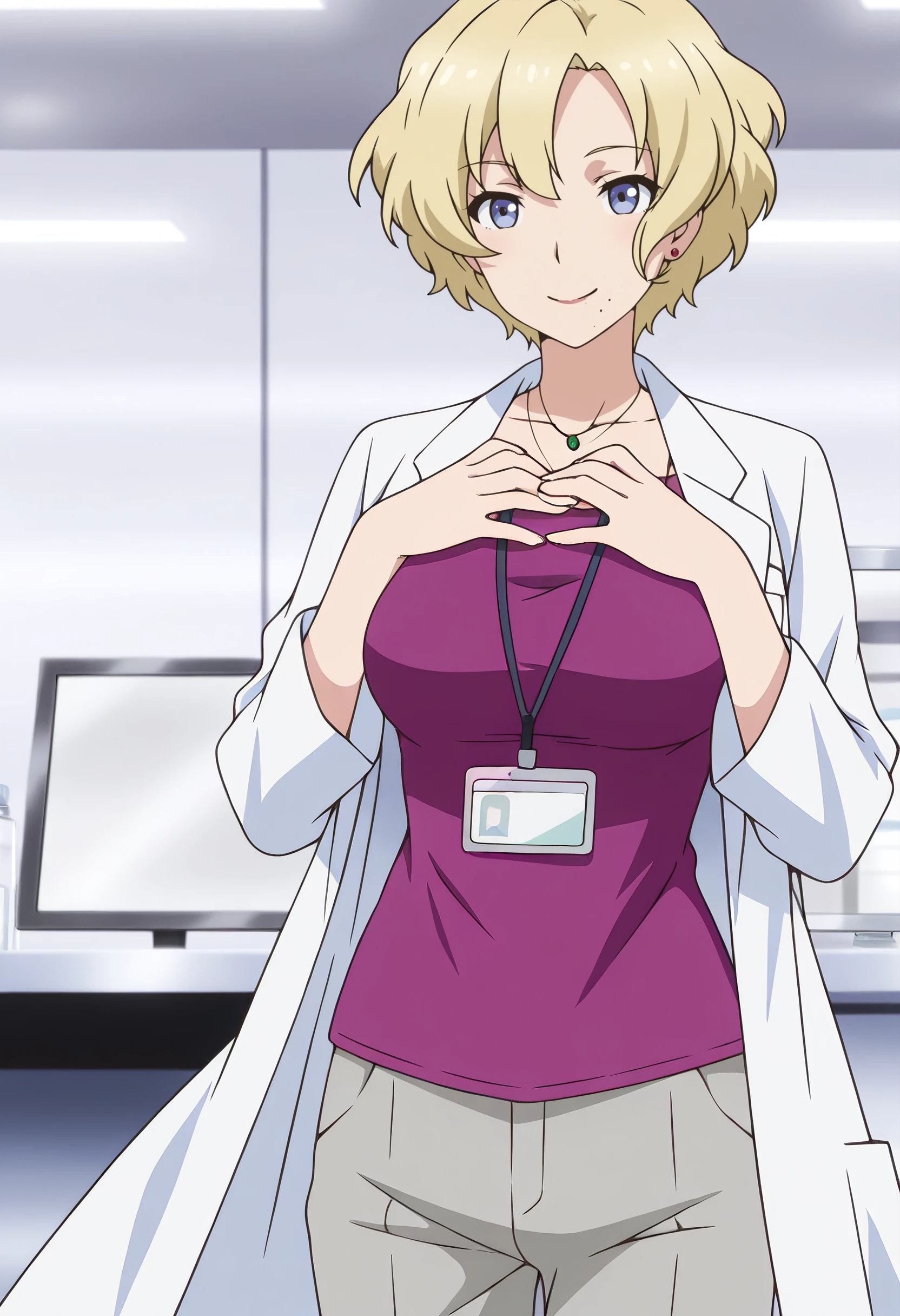 JacquelineOutfit, lab coat, jewelry, earrings, necklace, white coat, coat, shirt, id card, pants, open coat, grey pants, name tag, lipstick, purple shirt,
