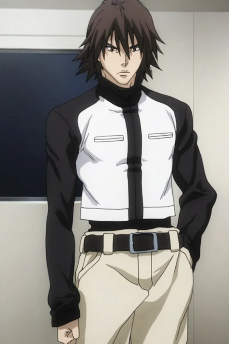 Jin Kanzaki, dark brown hair, dark brown eyes, turtleneck cropped jacket, long sleeves, raglan sleeves, black undershirt, belt, light brown pants