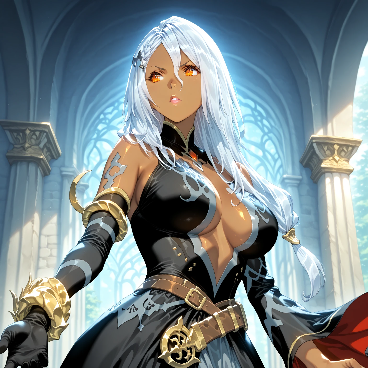 Trigger words: Bellina, dark skin, dark skinned female, long hair, white hair, hair ornament, bangs, sidelocks, braid, orange eyes, breasts, cleavage, dress, black dress, golden bracelet, 1black glove, belt,