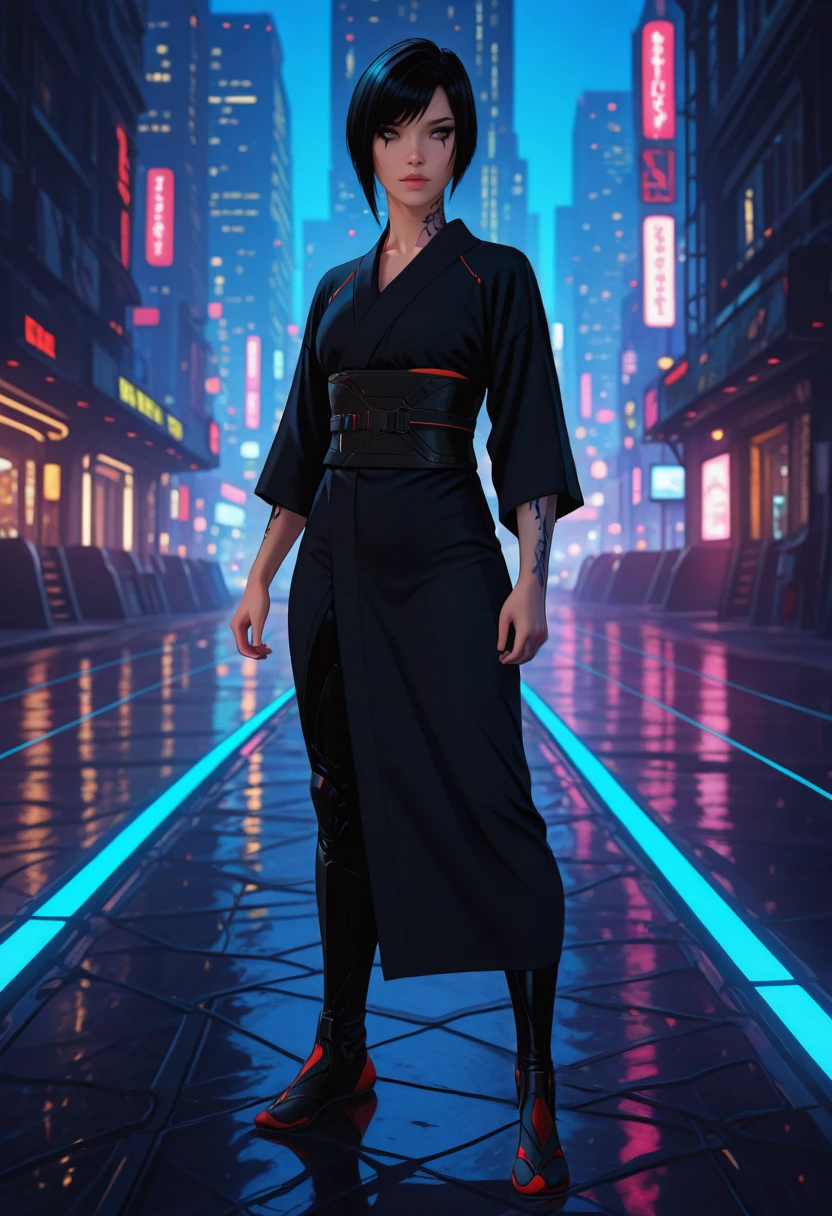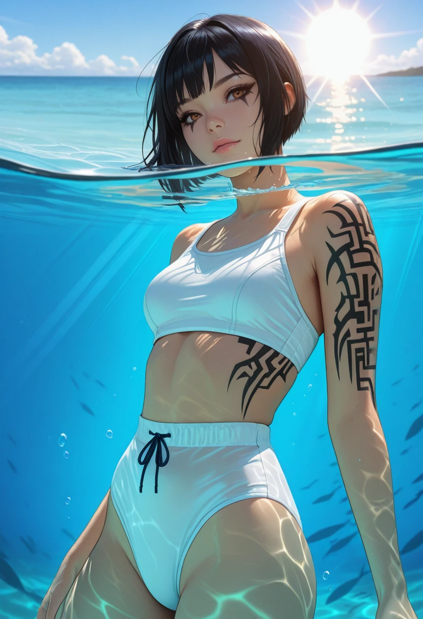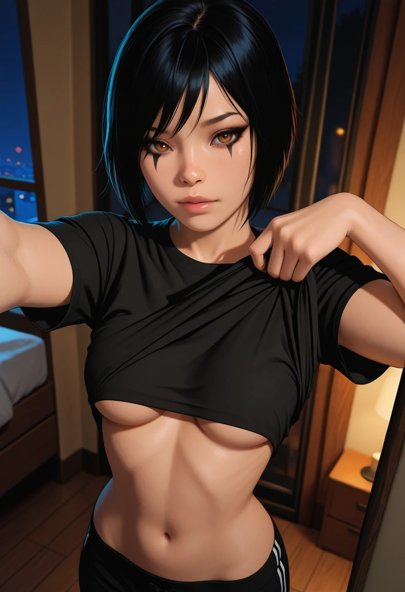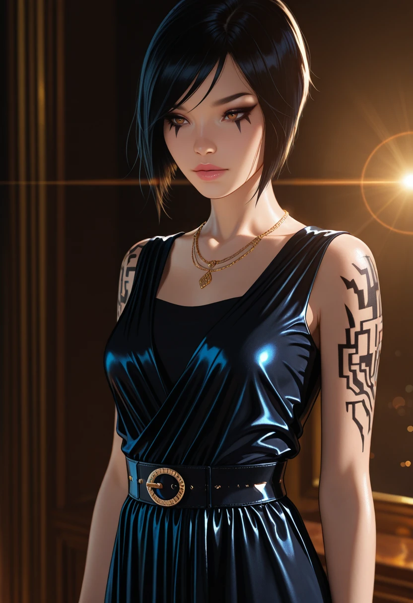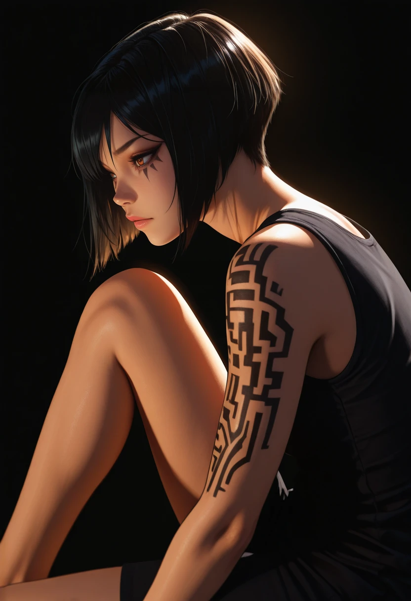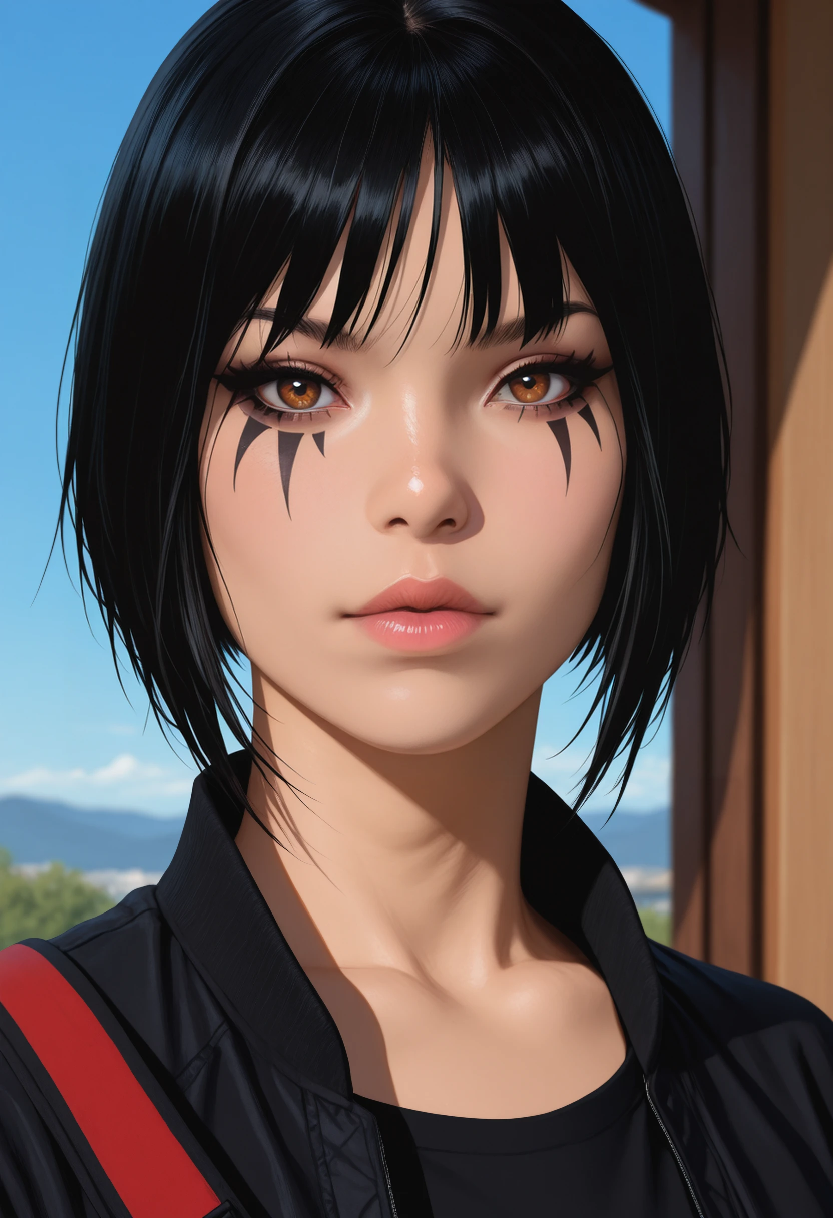 MEFaith, 1girl, solo, black hair, short hair, brown eyes, face tattoo