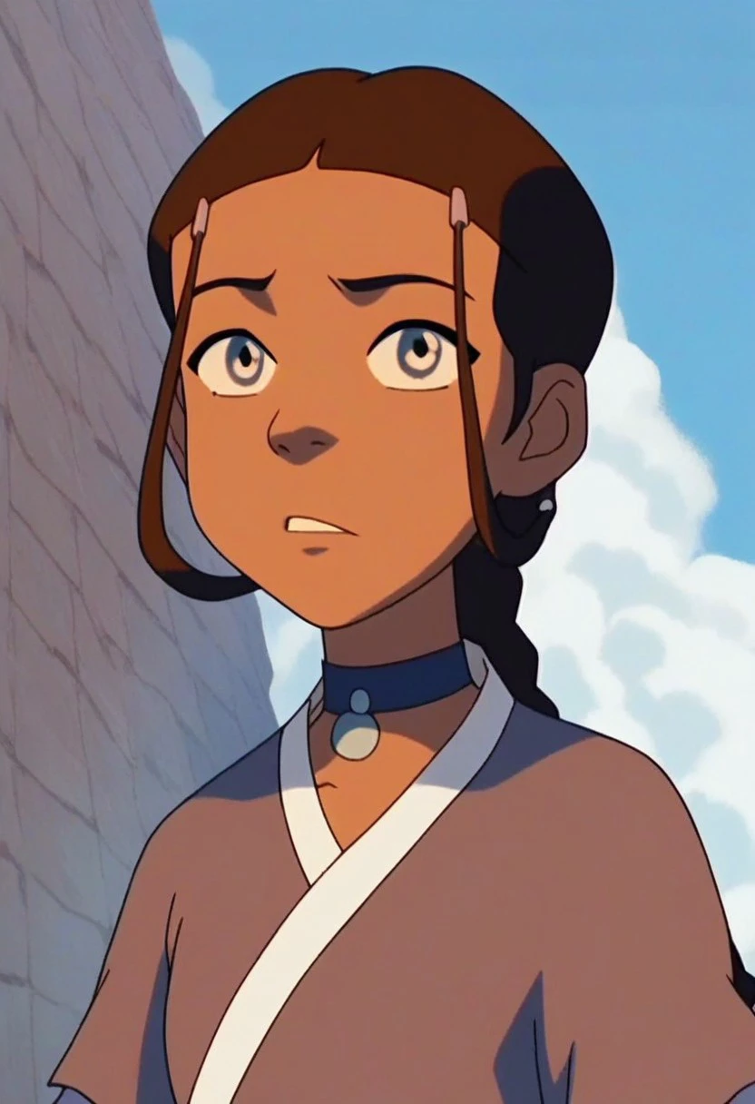1girl, katara, brown hair, blue eyes, braid, side locks, blue choker, blue necklace