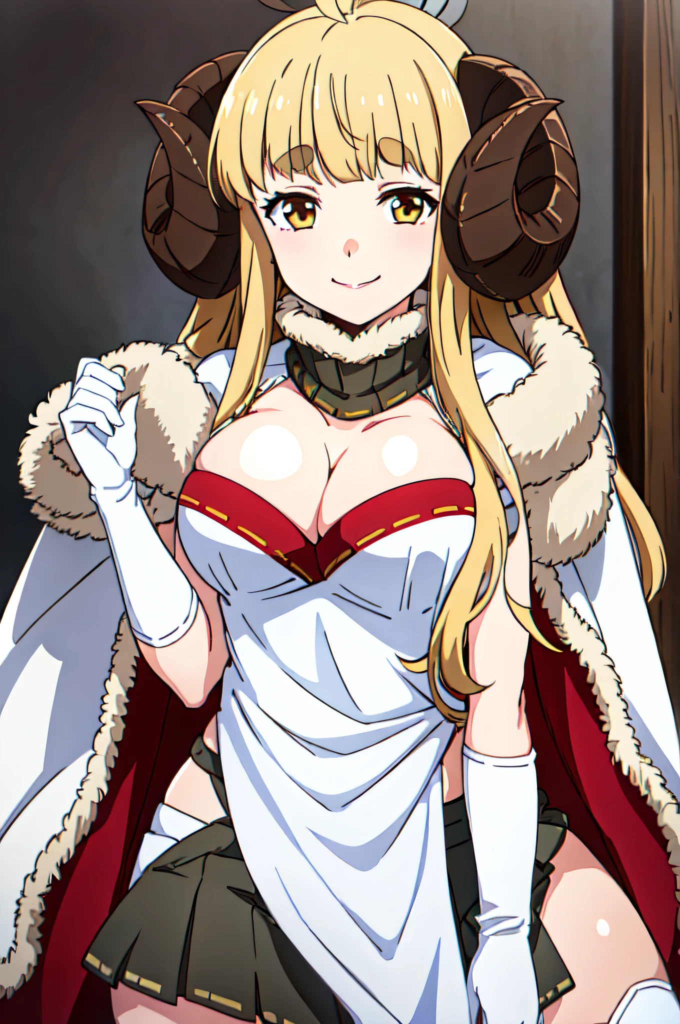 ANILADEF, CLEAVAGE, CAPE, WHITE GLOVES, WHITE THIGHHIGHS, PLEATED SKIRT, FUR TRIM, PELVIC CURTAIN, WHITE TABARD
