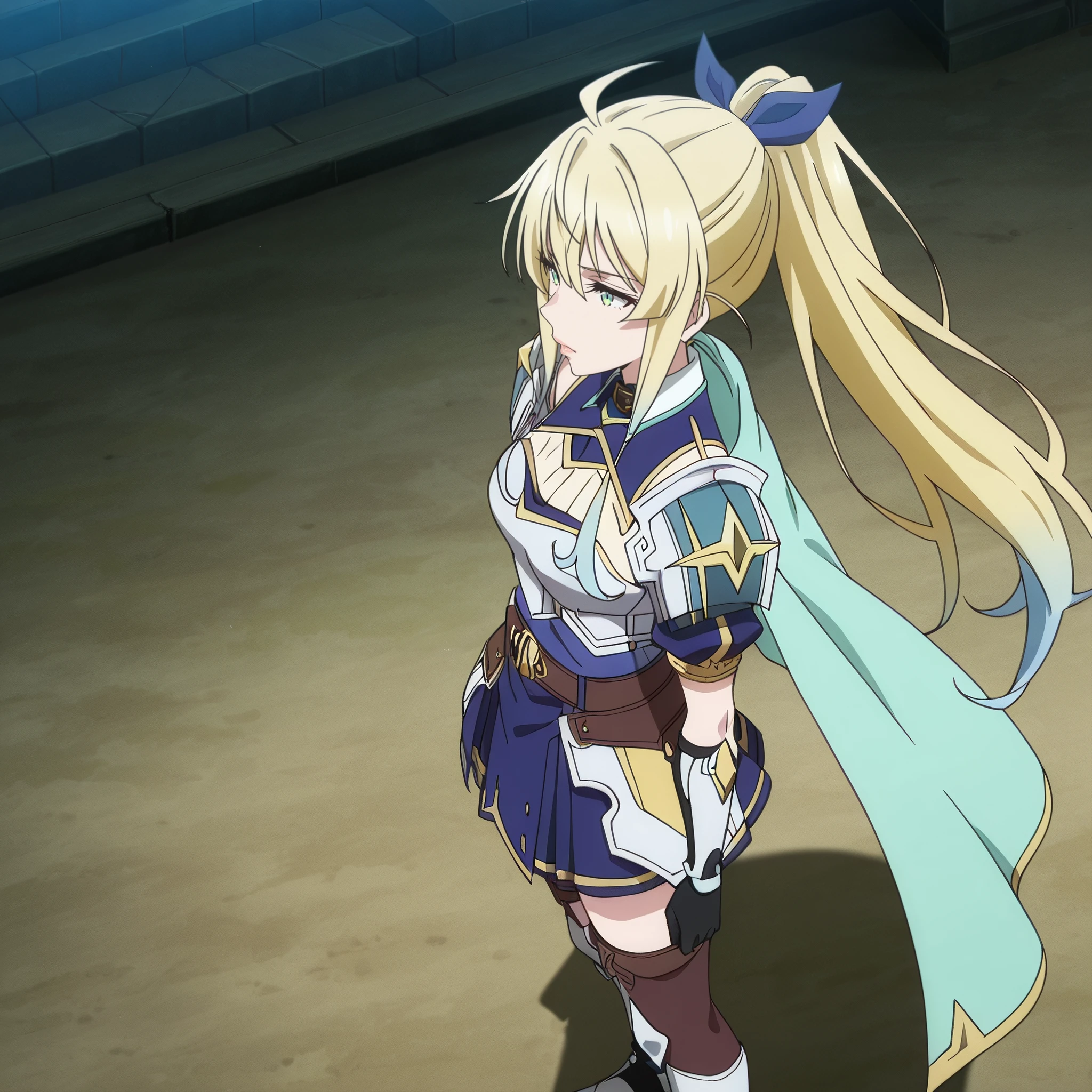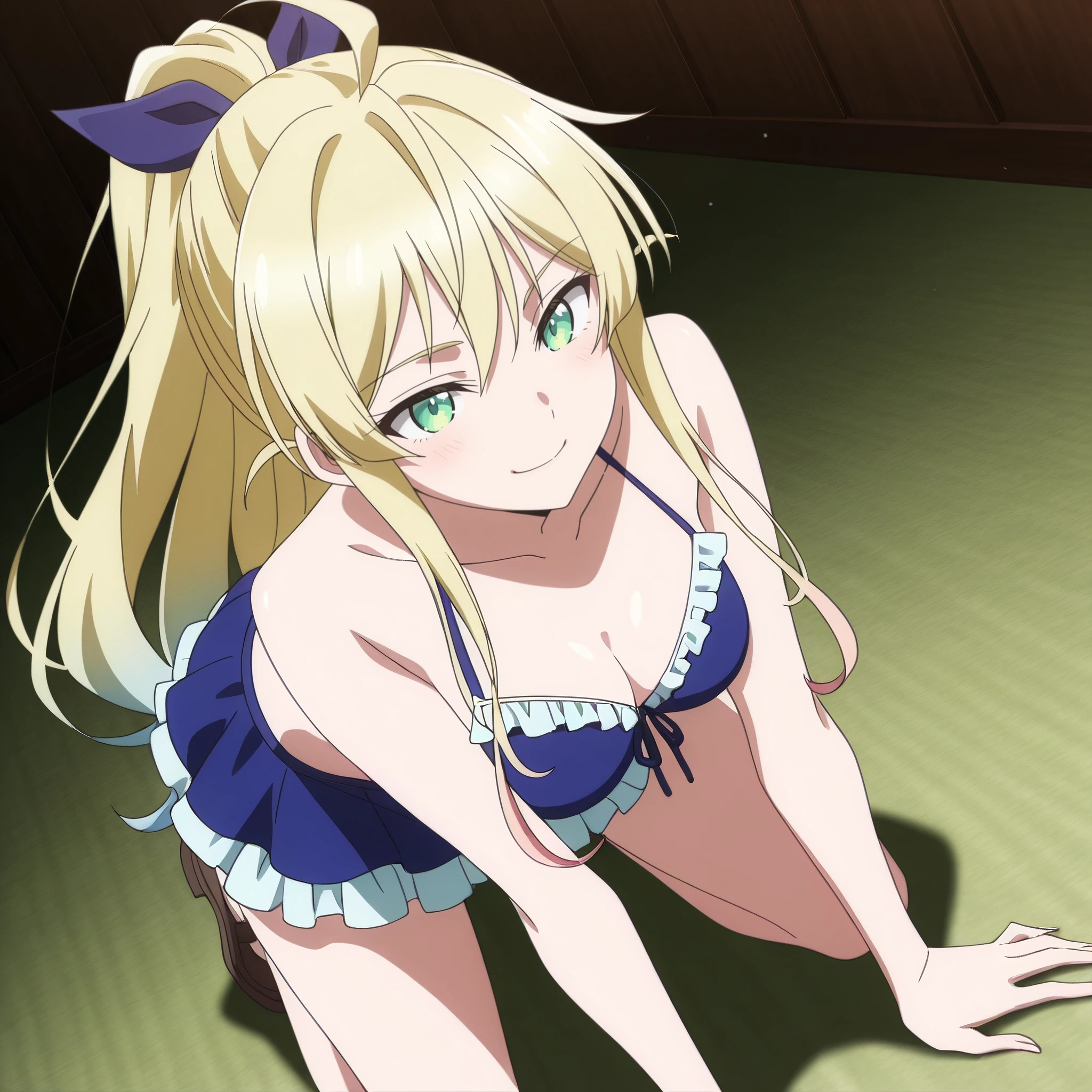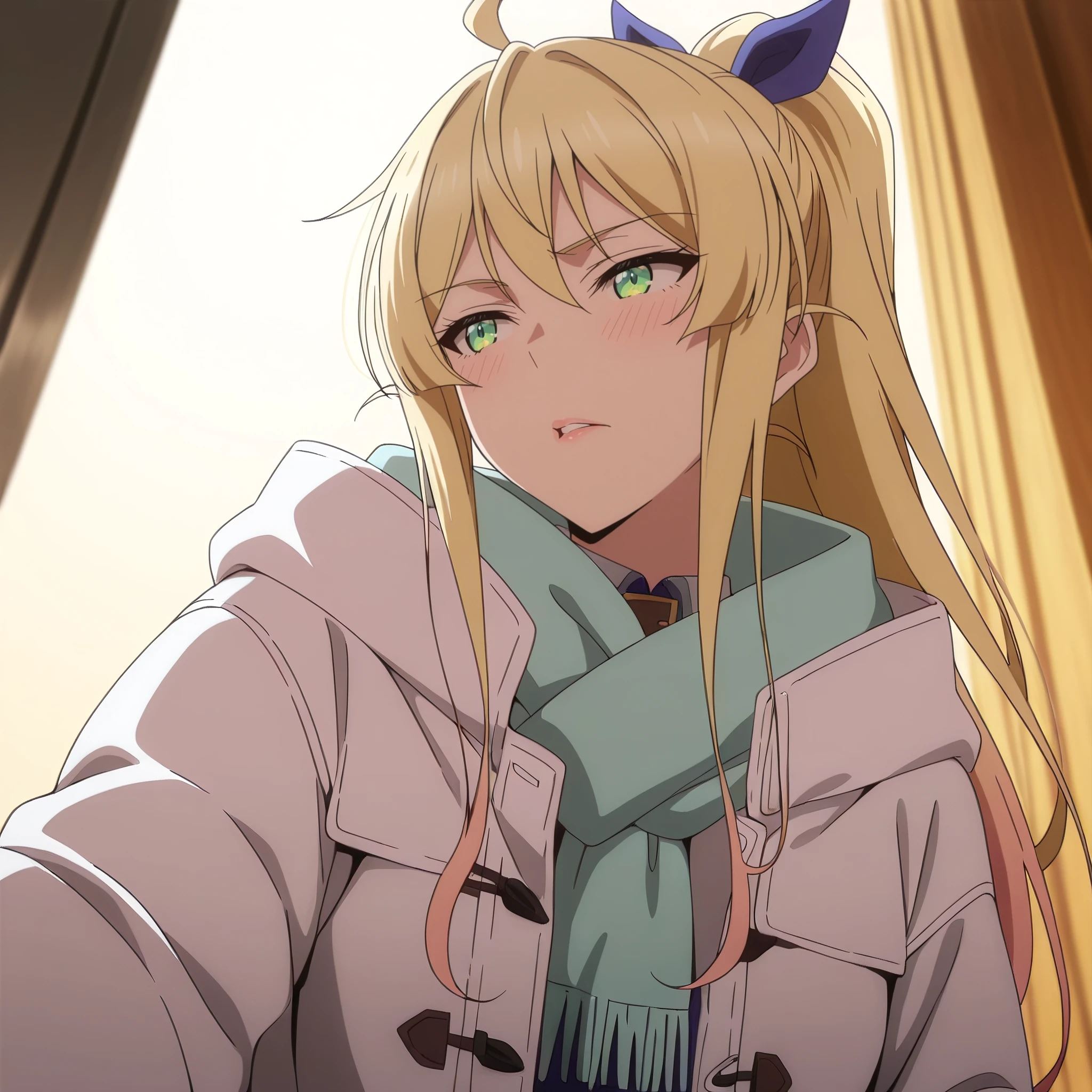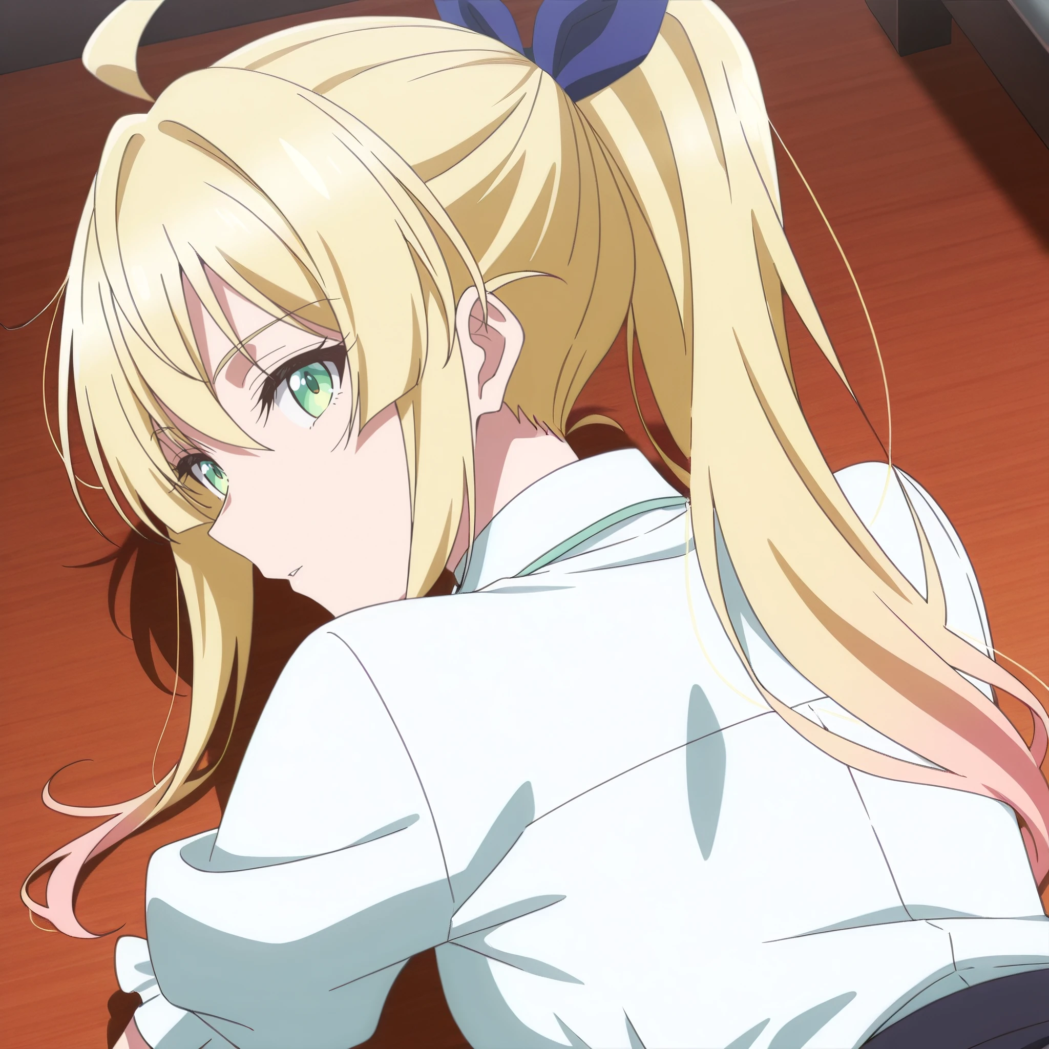 SRALina, blonde hair, long hair, green eyes, ponytail, ahoge, hair between eyes, blue hair bow, sidelocks,
