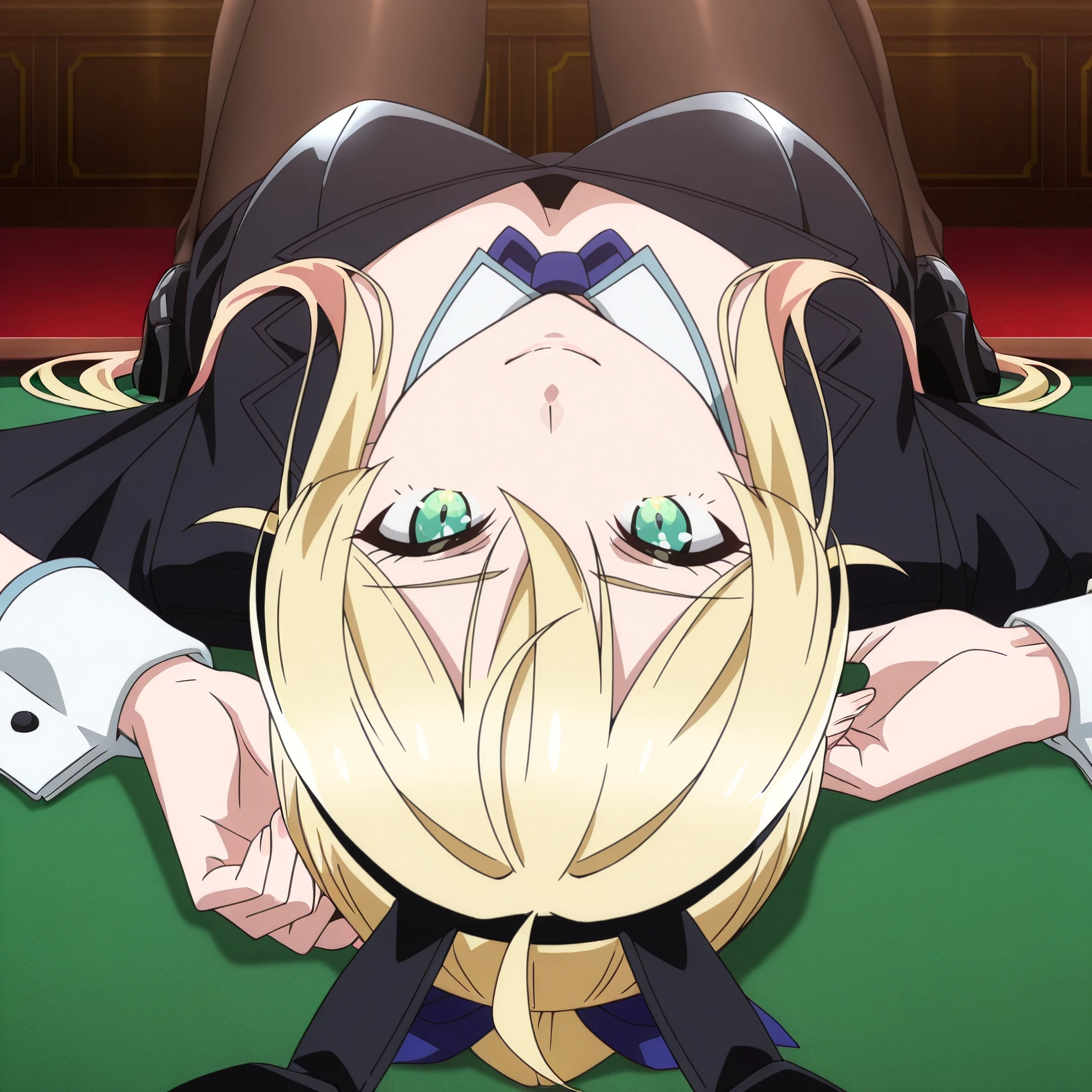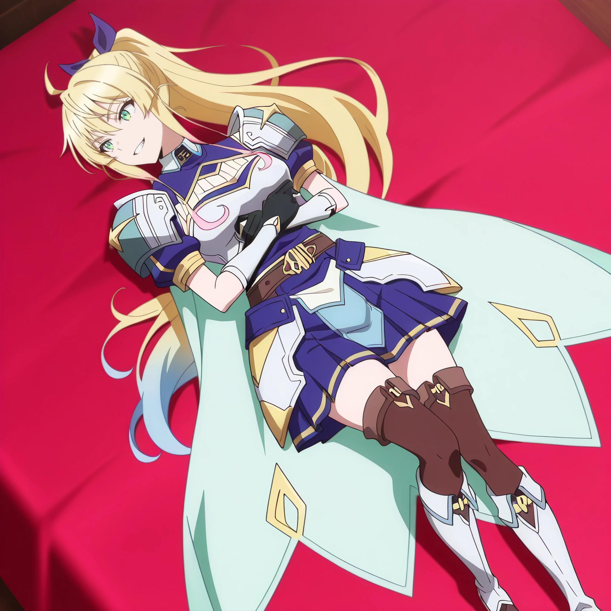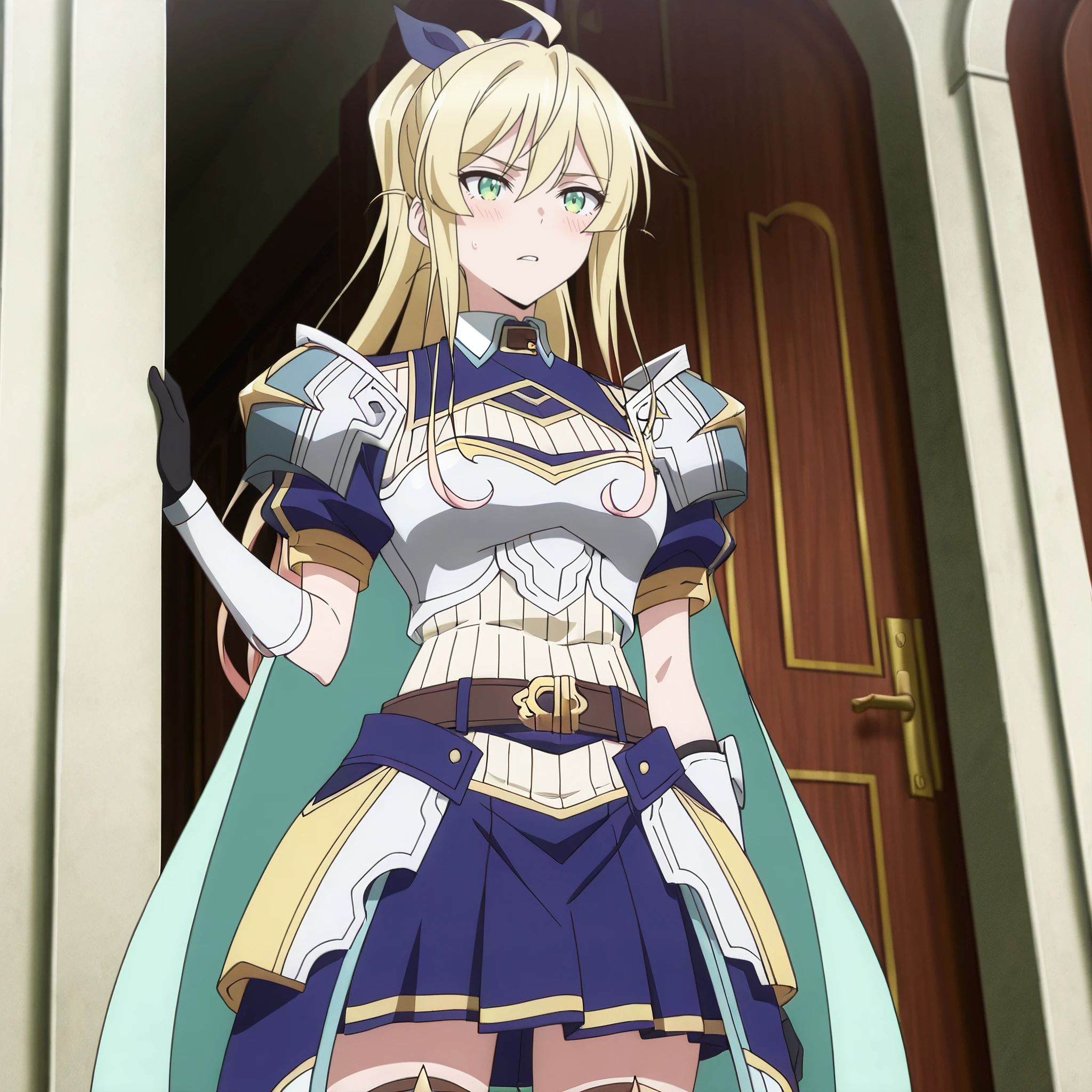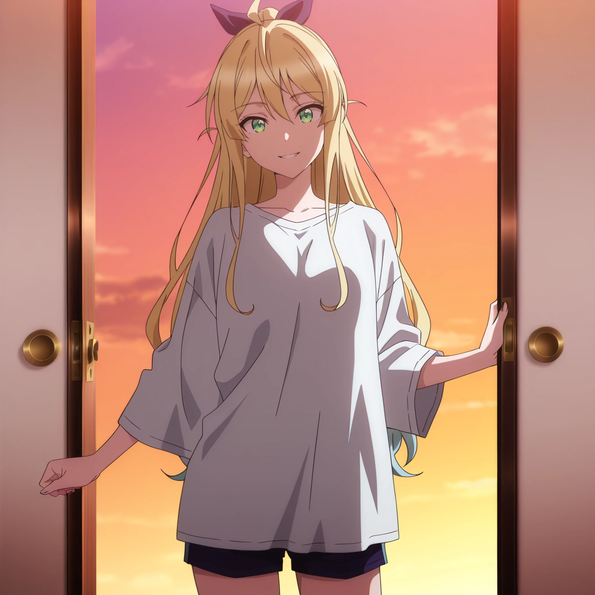 SRALina, blonde hair, long hair, green eyes, ponytail, ahoge, hair between eyes, blue hair bow, sidelocks,