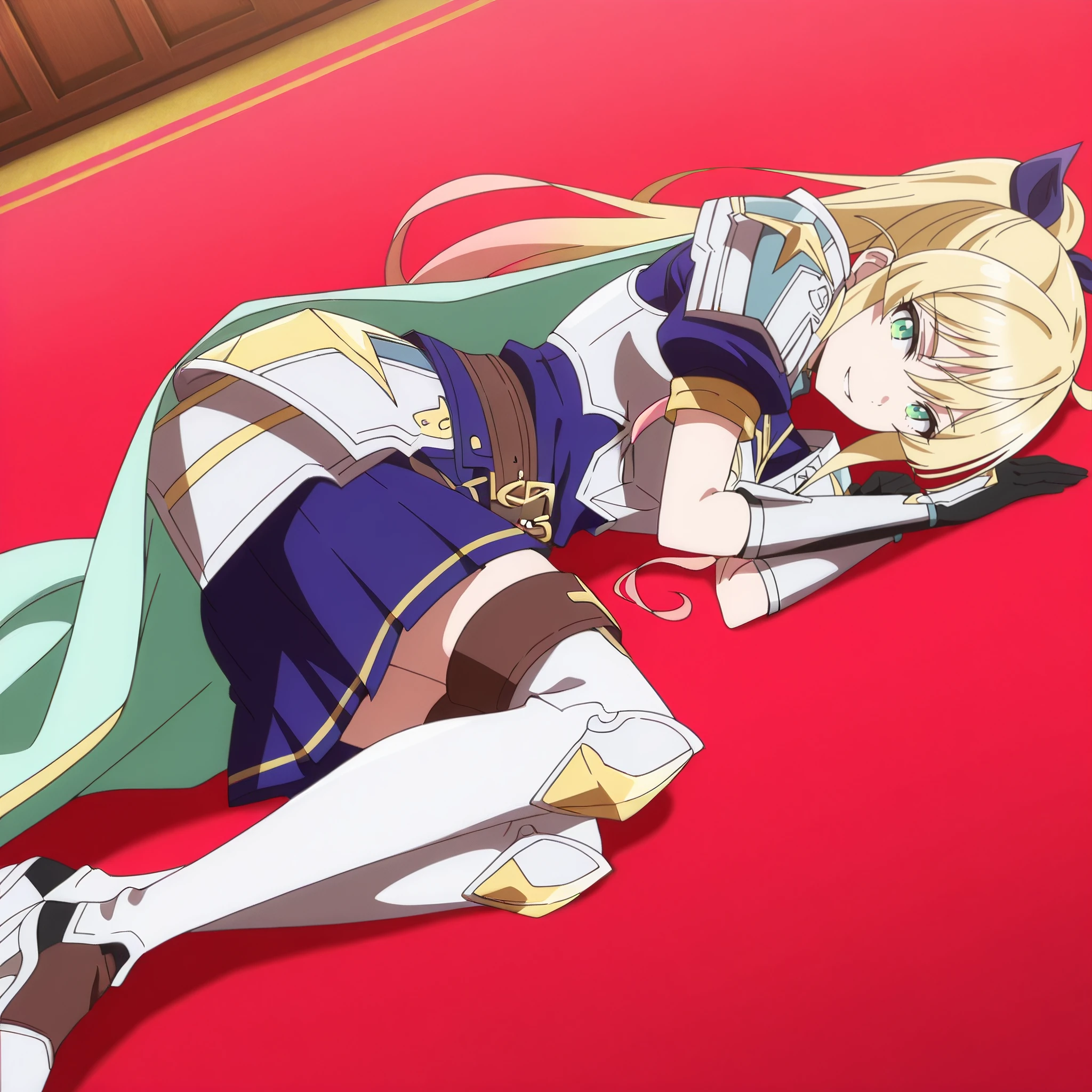 armor, shoulder armor, elbow gloves, black gloves, belt, breastplate, short sleeves, cape, skirt, pauldrons, thighhighs, armored dress,