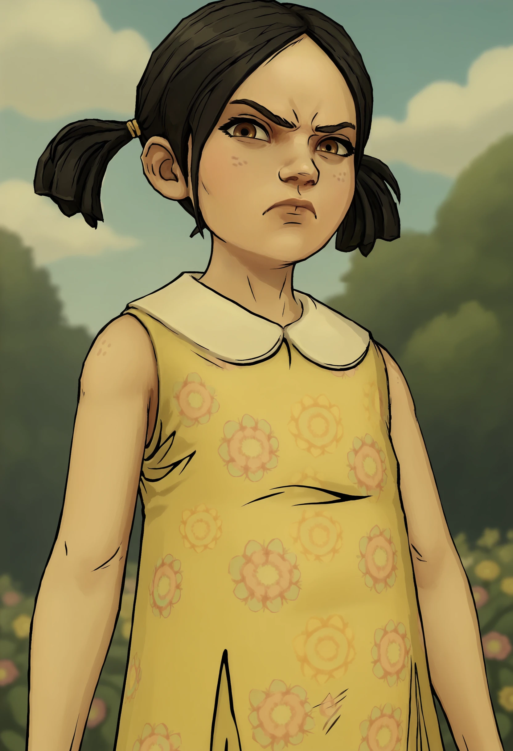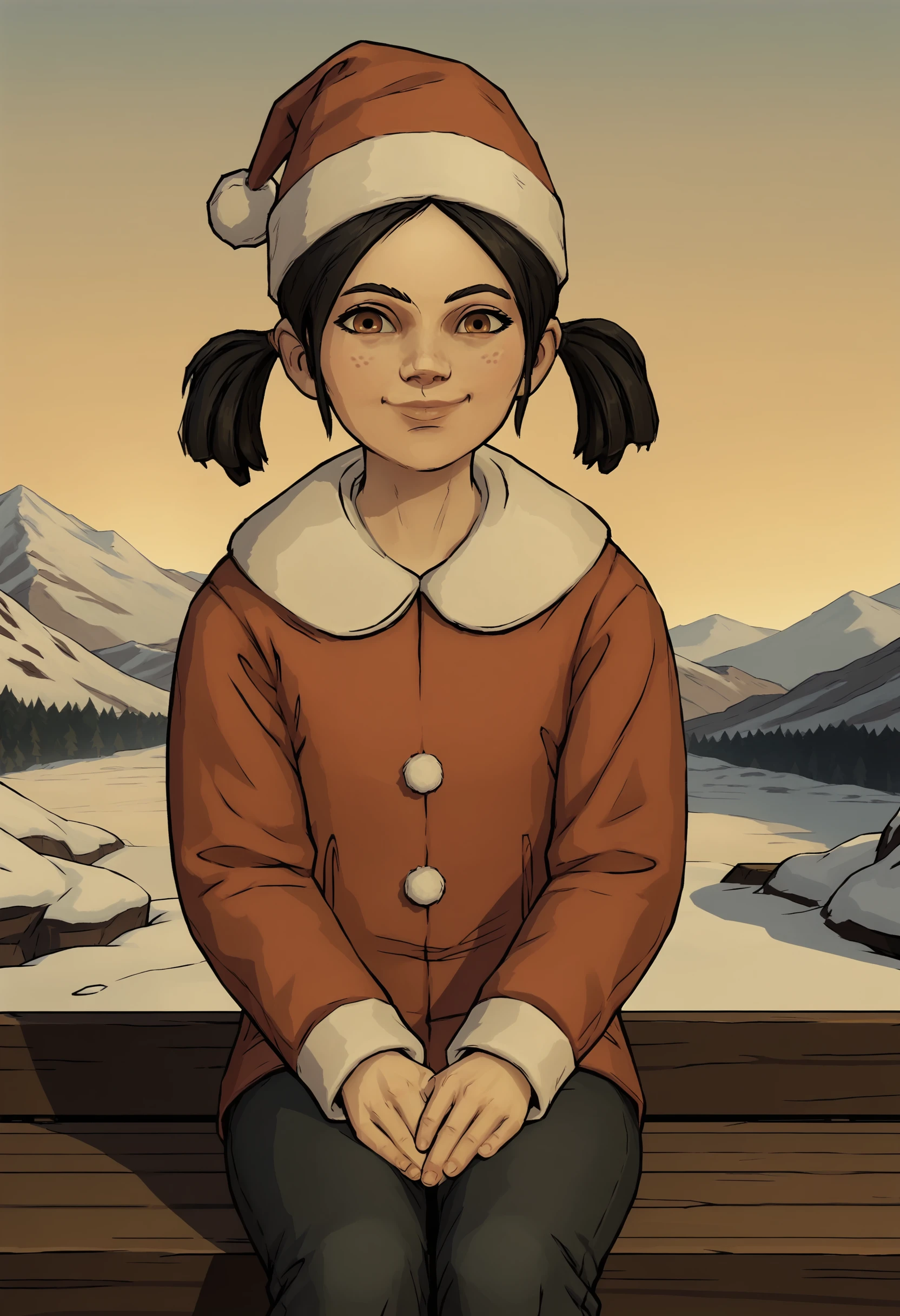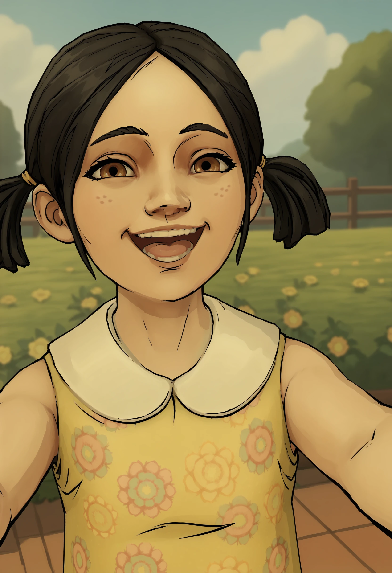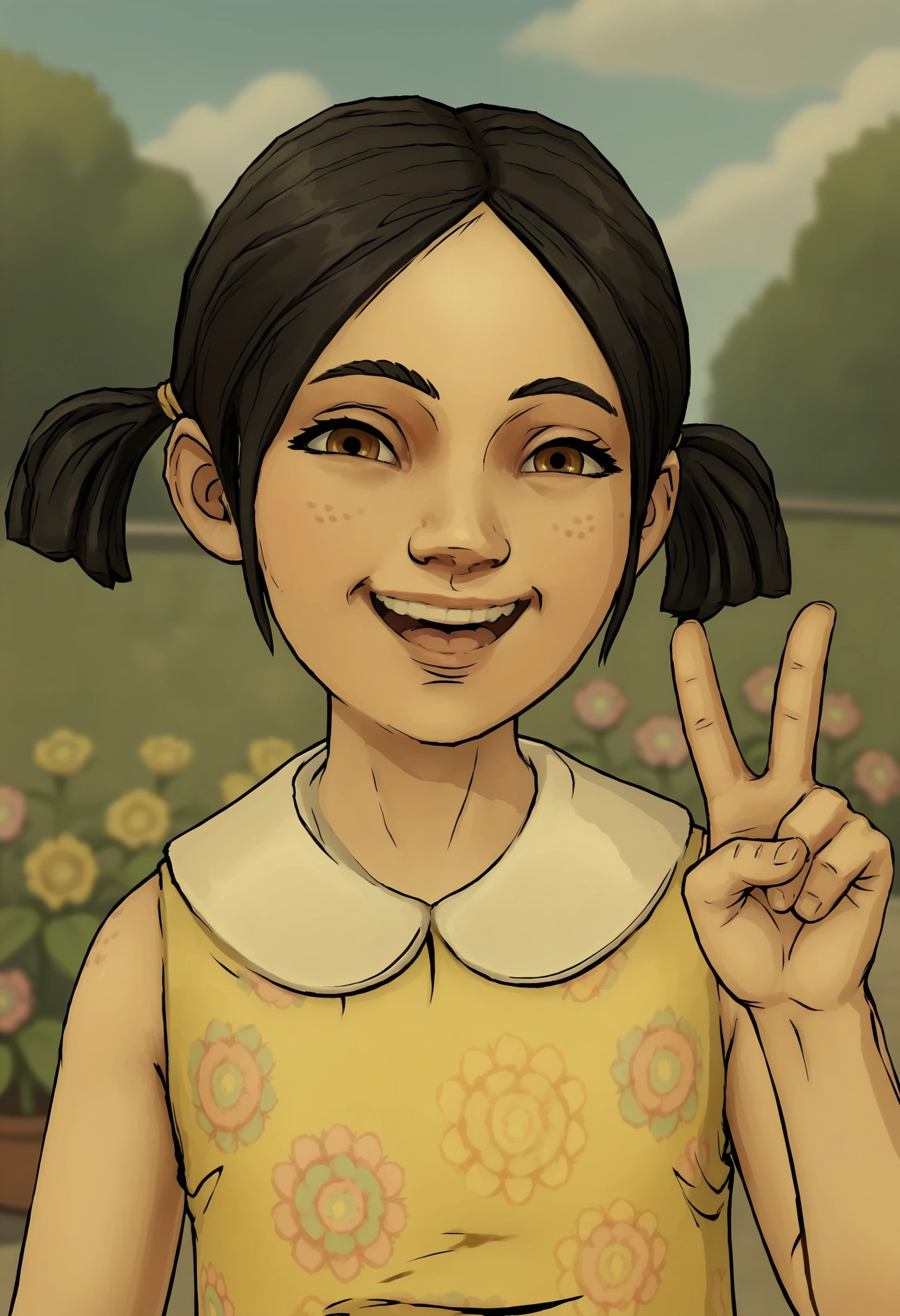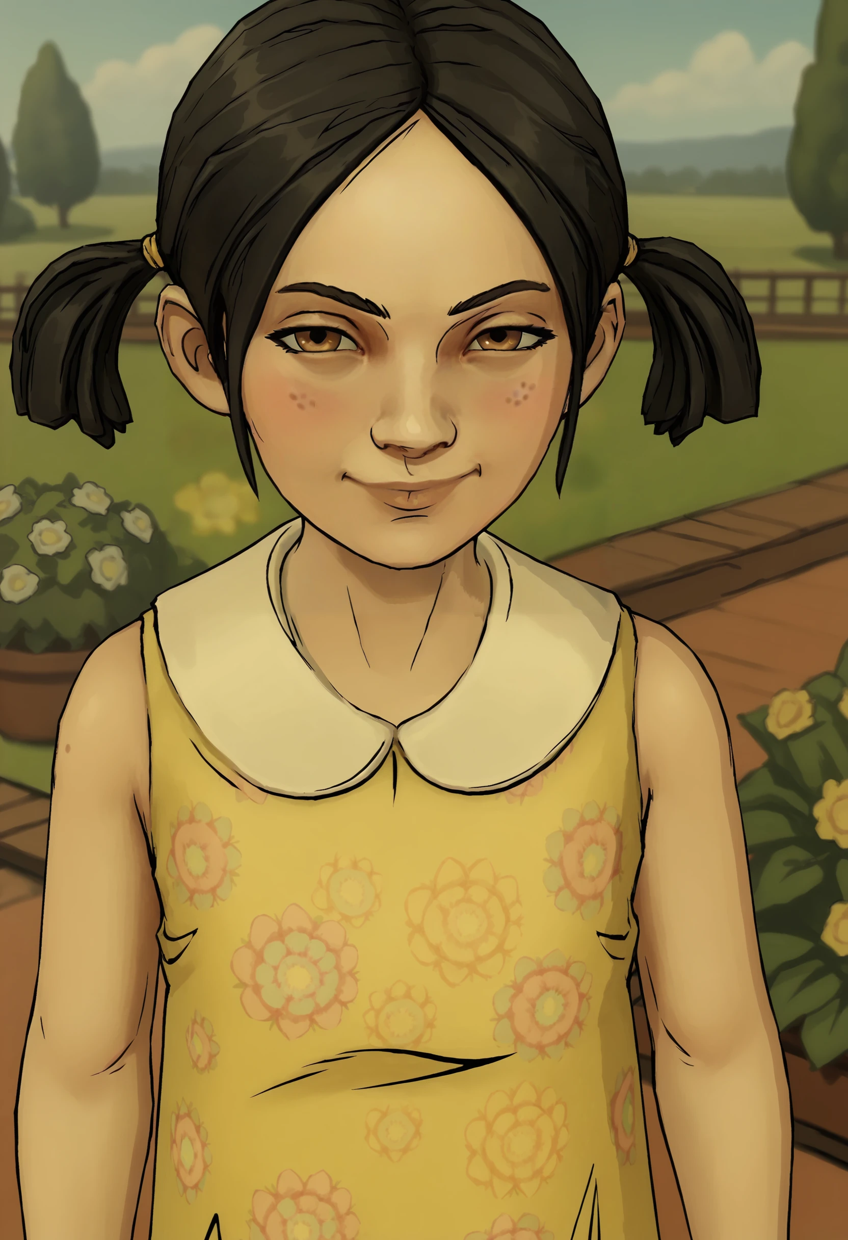 1girl, brown eyes, black hair, twintails, short twintails, freckles, lips