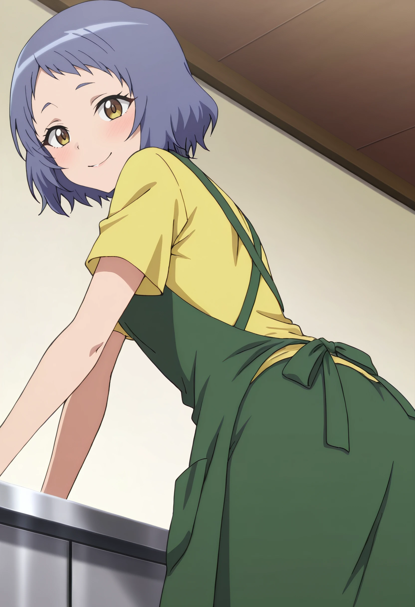 FSDaughterOutfit, shirt, yellow shirt, dress, green dress, green apron, apron, short sleeves, t-shirt,