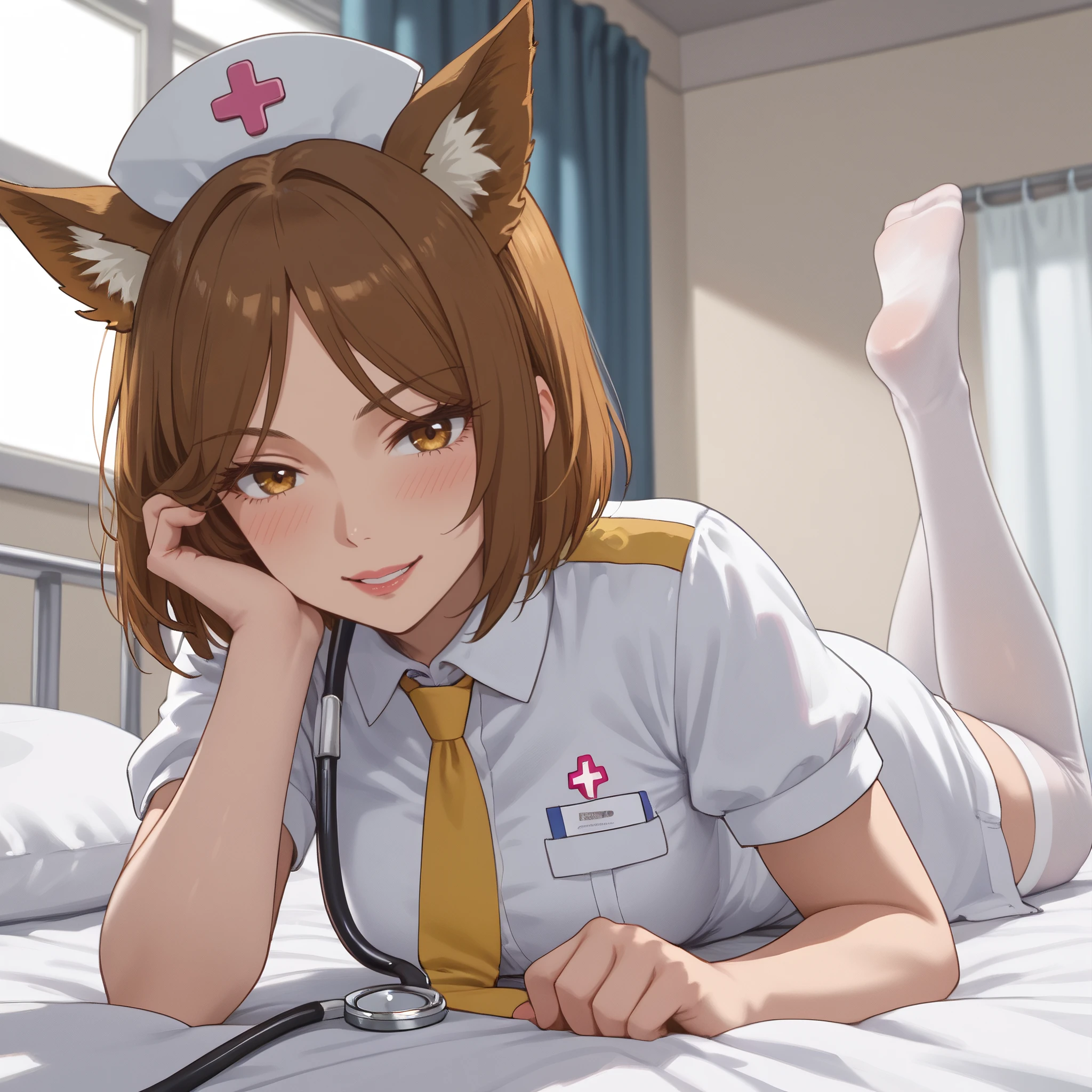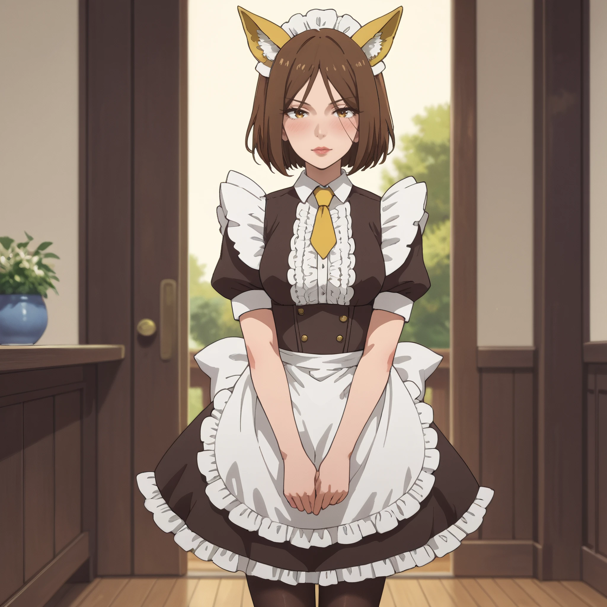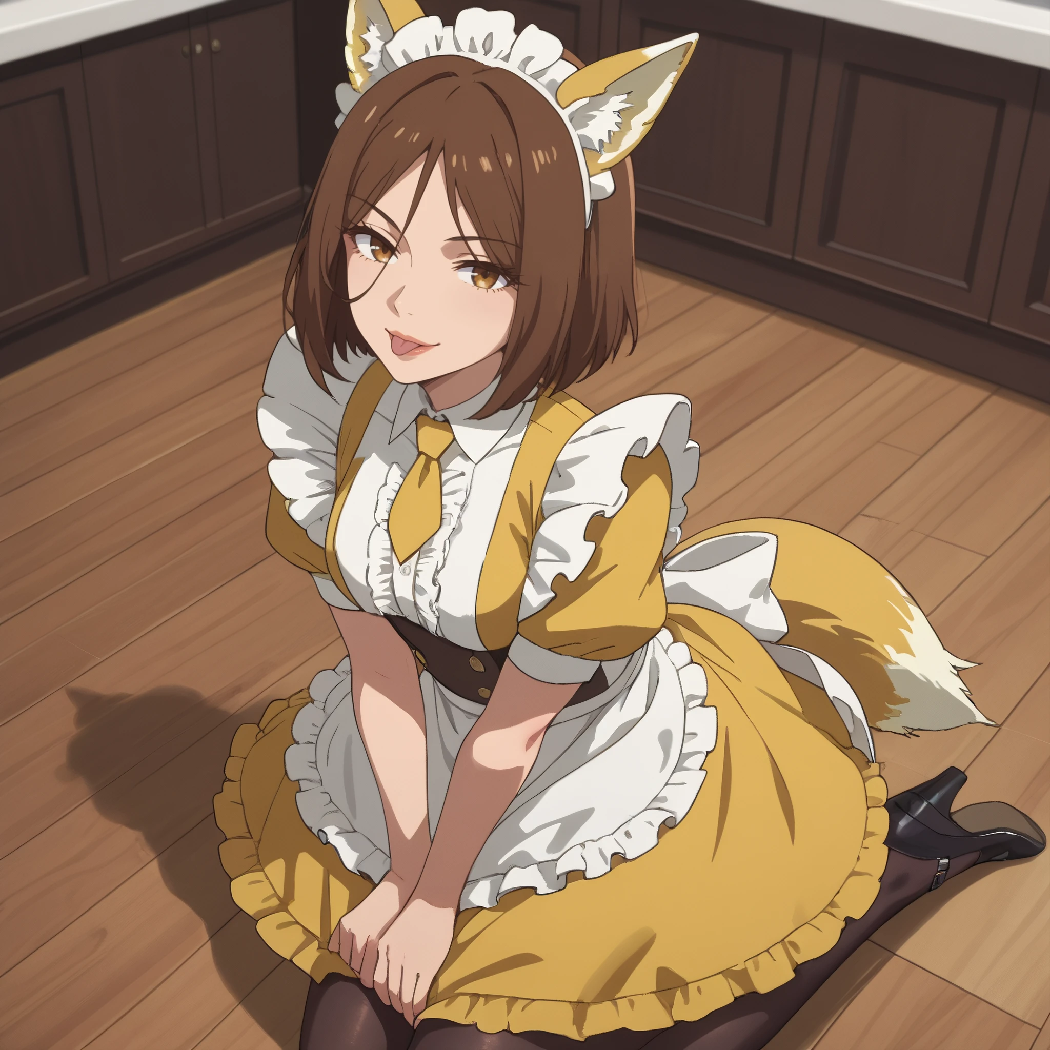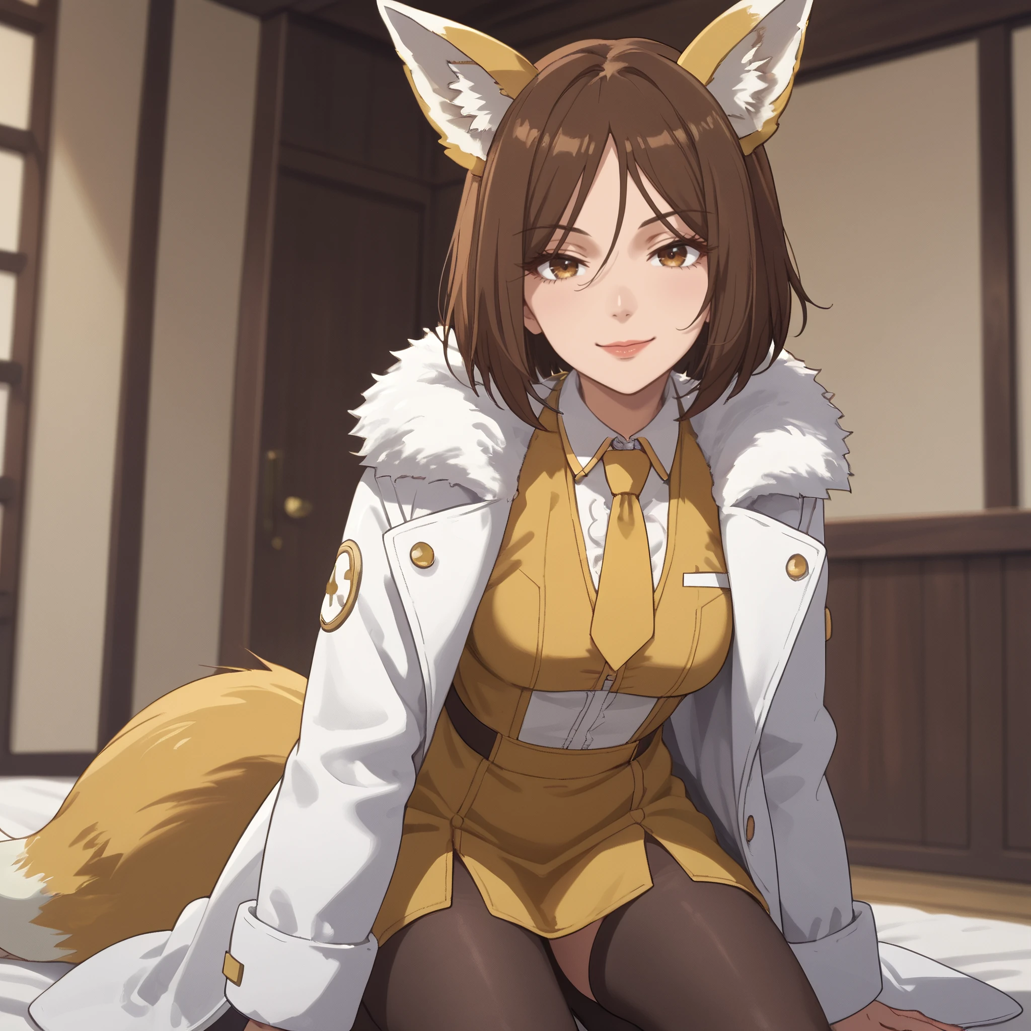 AMWKonKonManager, brown hair, short hair, brown eyes, animal ears, necktie, yellow bow, bangs, bob cut, eyebrows visible through hair, fox ears, yellow necktie,
