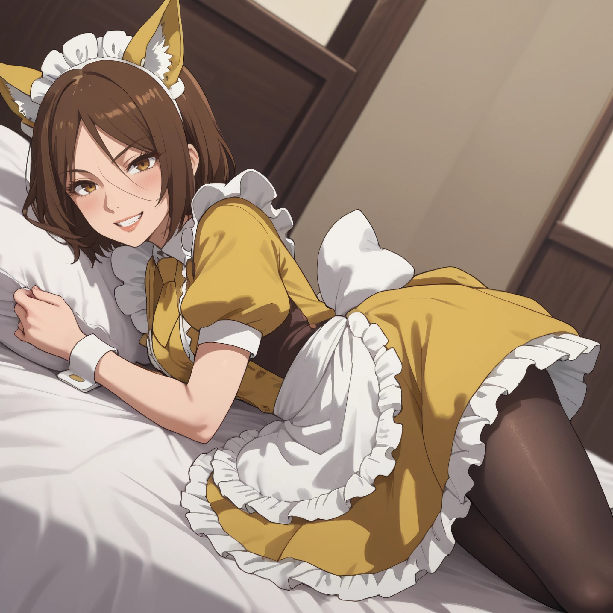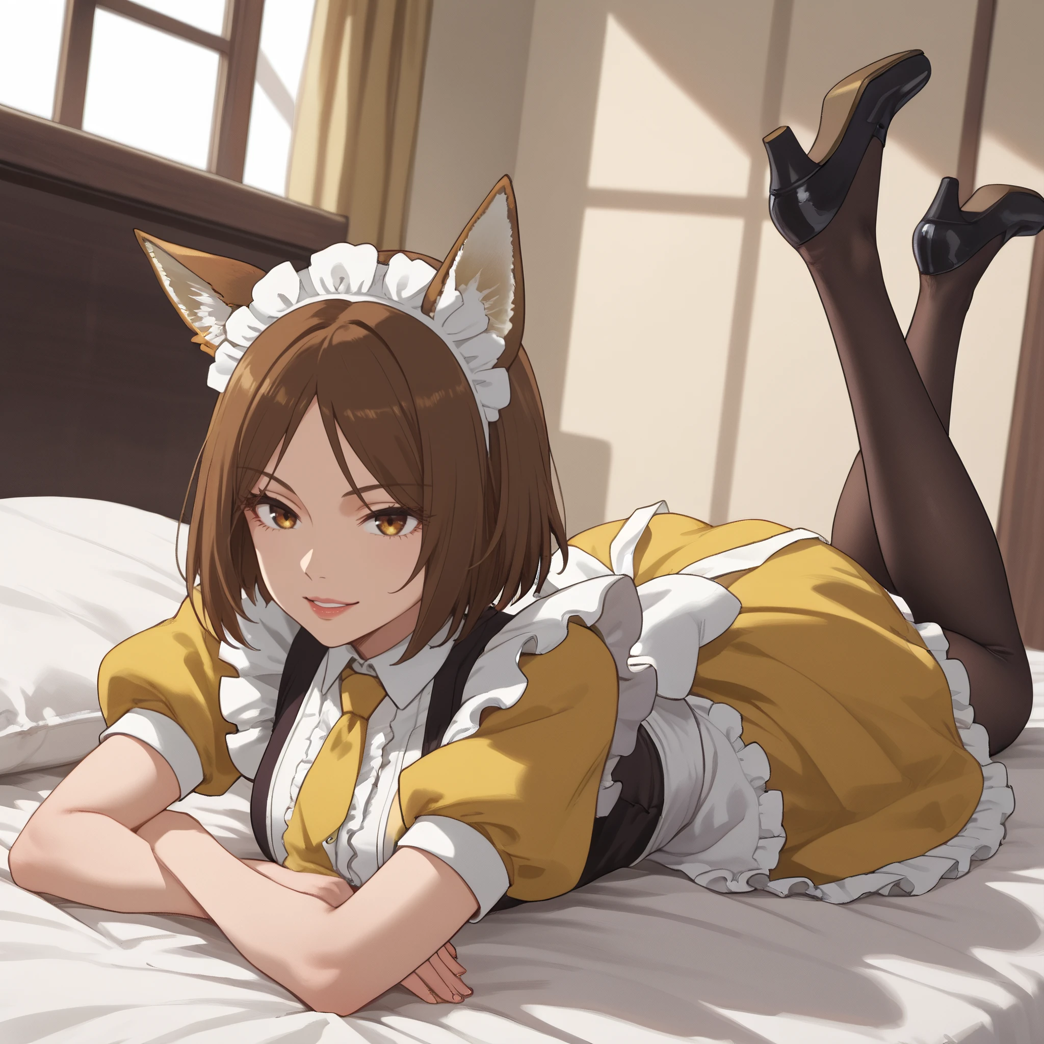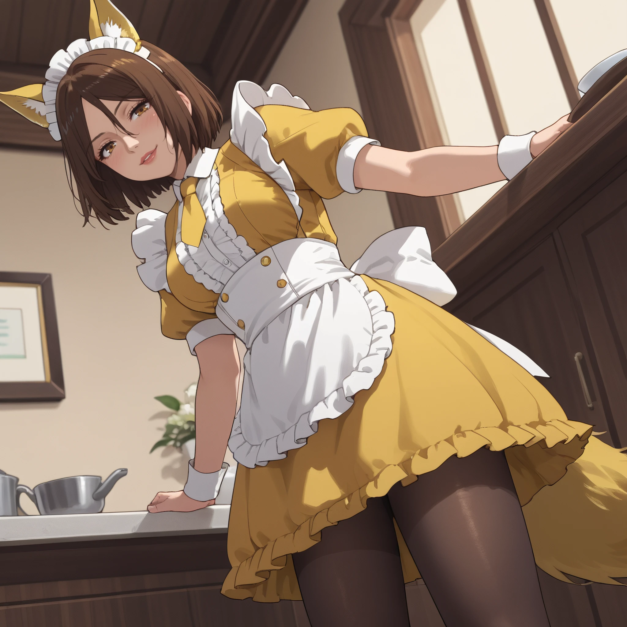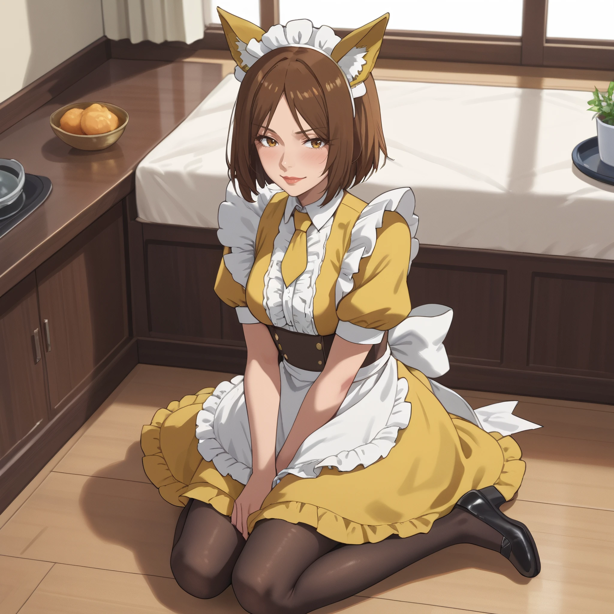 apron, maid, maid apron, dress, maid headdress, enmaided, frills, puffy sleeves, short sleeves, frilled apron, white apron, yellow dress, pantyhose,