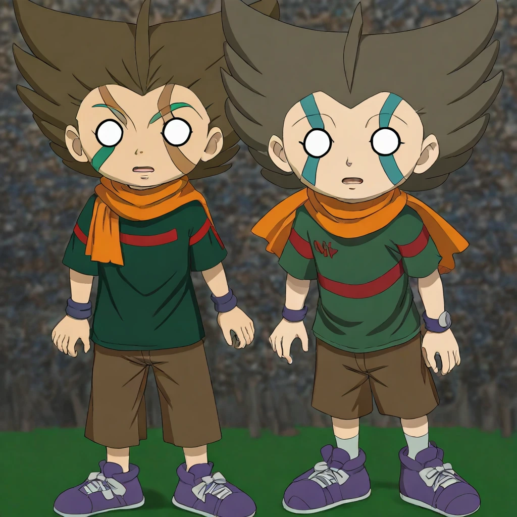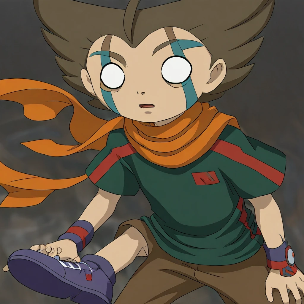 Derek Swing, Empty eyes, White eyes, Brown hair, Orange scarf, Green shirt, Brown pants, Purple shoes, Facial markings, 1boy