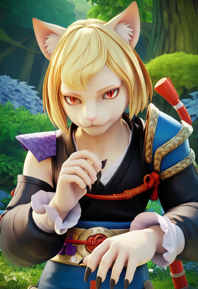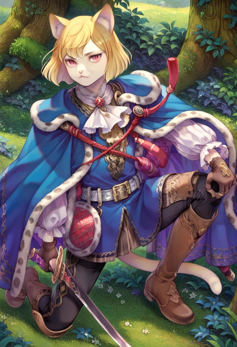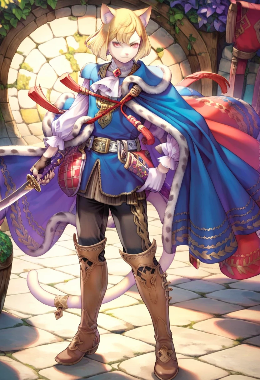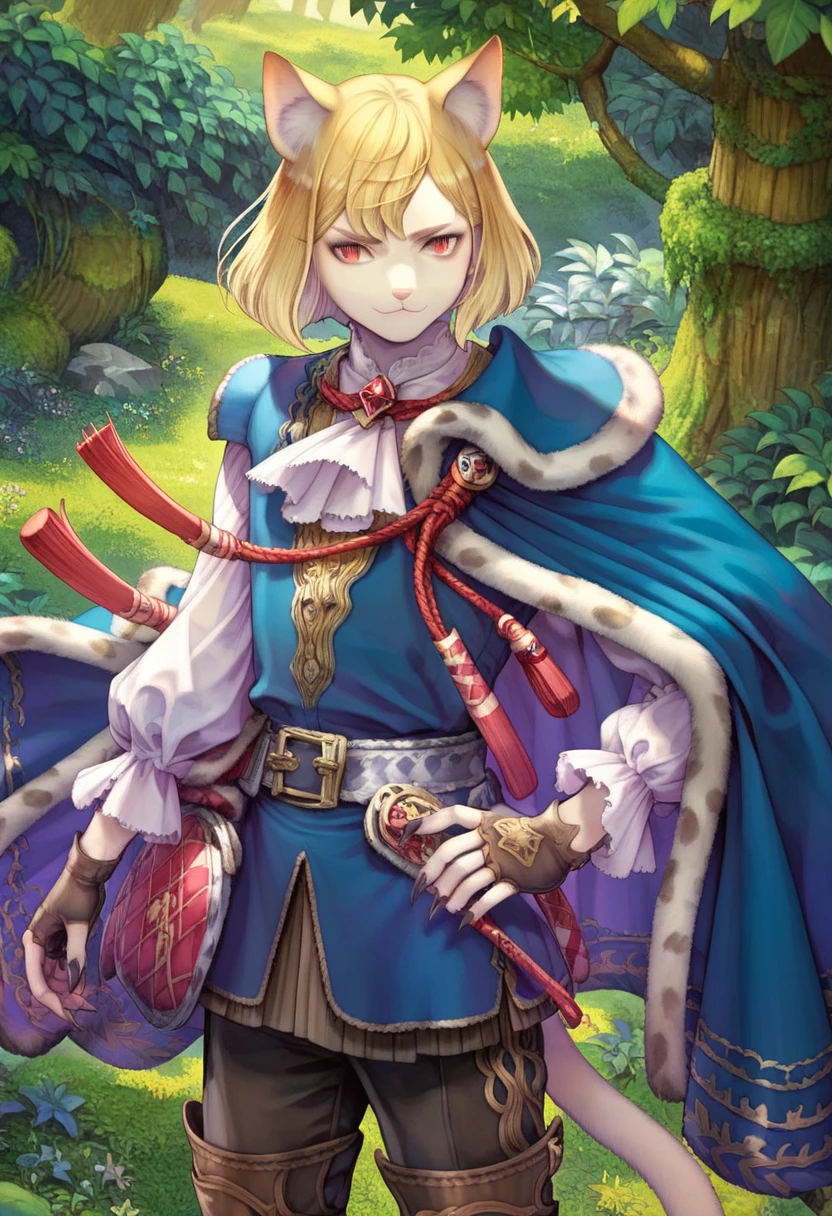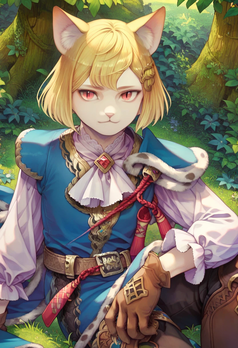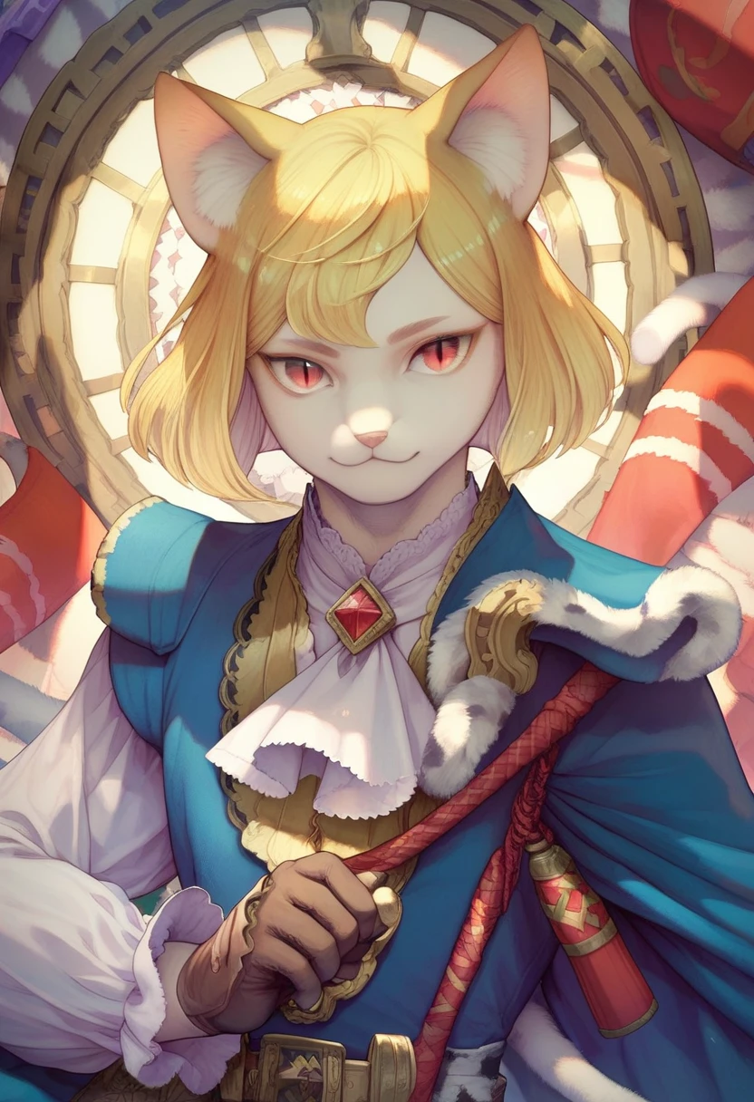 vom morley, blonde hair, red eyes, black pupils, slit pupils, gloves, furry, furry male, cat tail, animal ear fluff, cat boy, cat ears, tail ornament,