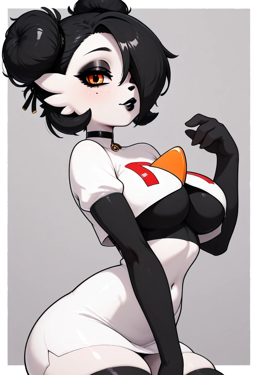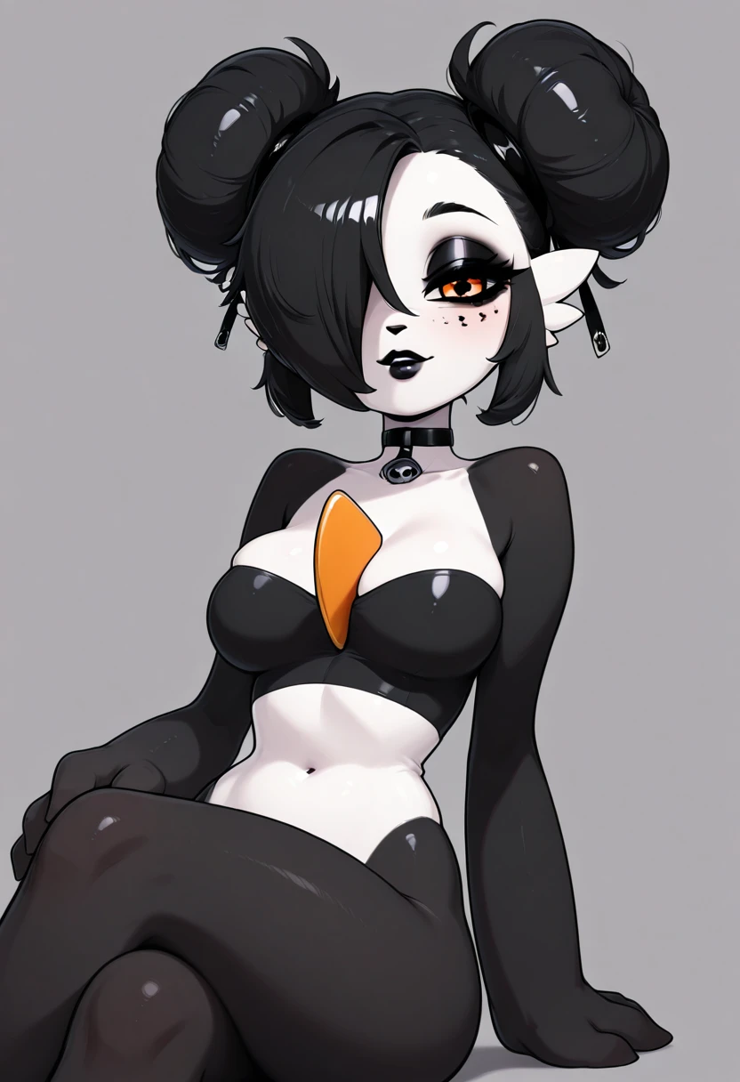 PandevoirC1tr0n, orange eyes, black hair, short hair, hair over one eye, double bun, black lips, eyeshadow, gothm black skin, white skin, multicolored skin, two-tone skin, pantyhose,