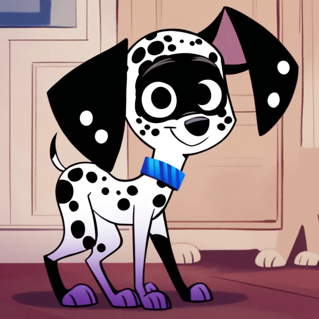 Dog, dalmatian, white and black fur, black spots, thin tail, large ears, black eyes, blue collar,