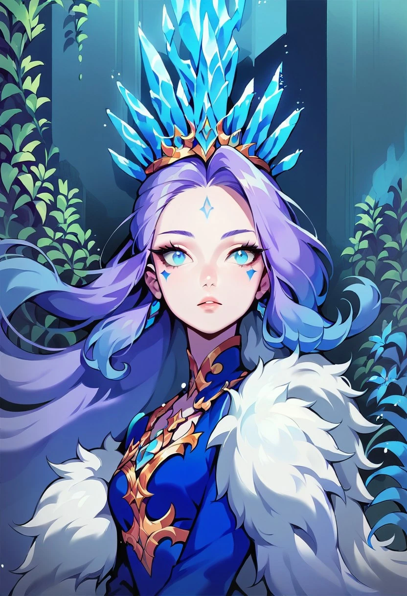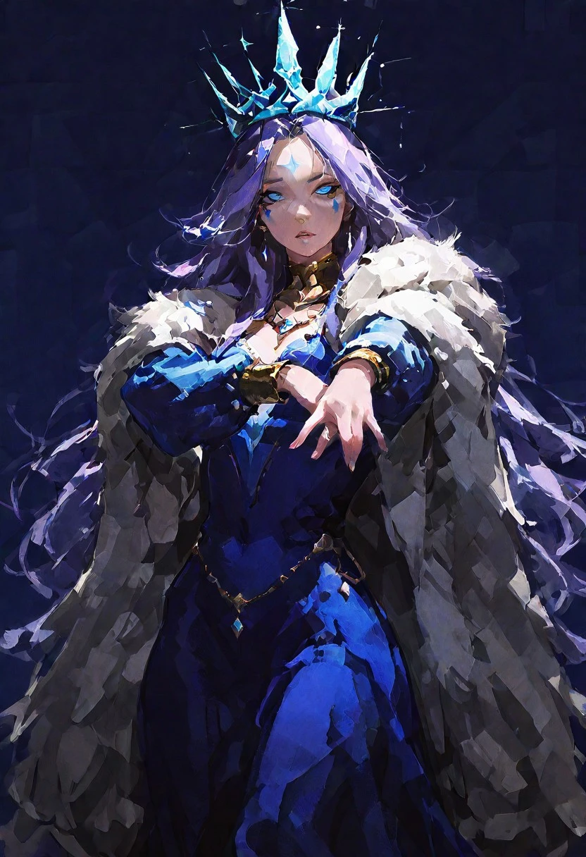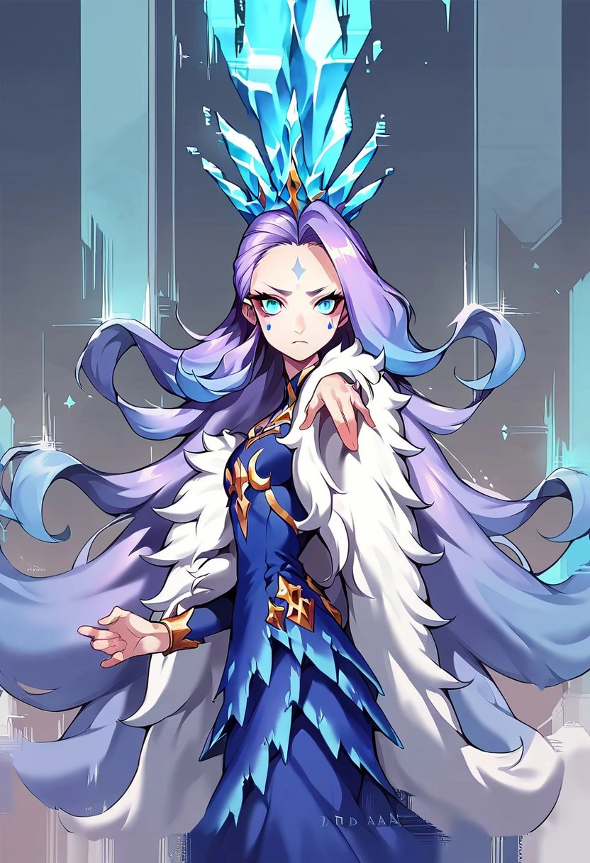 Idinia, jewelry, purple hair, long hair, wavy hair, blue hair, blue eyes, facial mark, blue dress, fur coat, ice crown, long sleeves