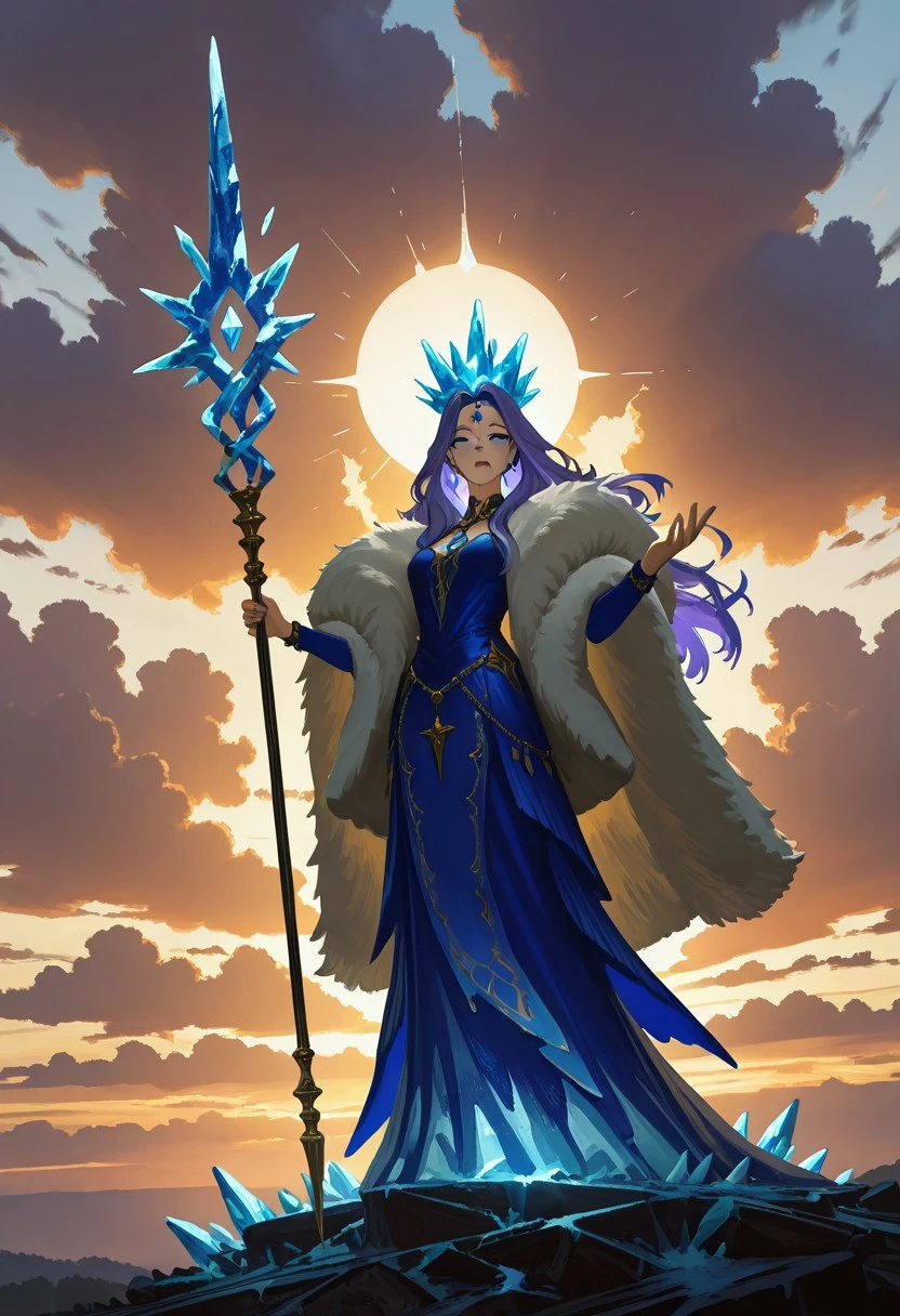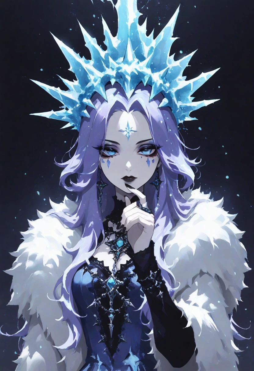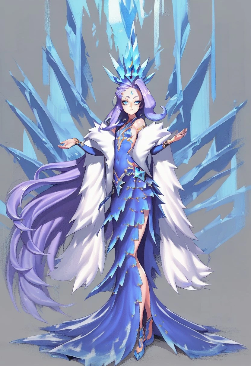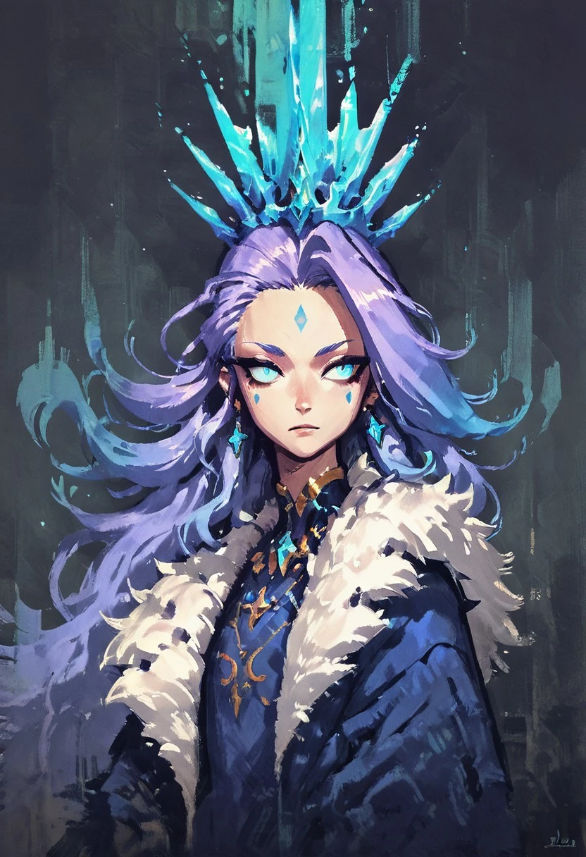 Idinia, jewelry, purple hair, long hair, wavy hair, blue hair, blue eyes, facial mark, blue dress, fur coat, ice crown, long sleeves