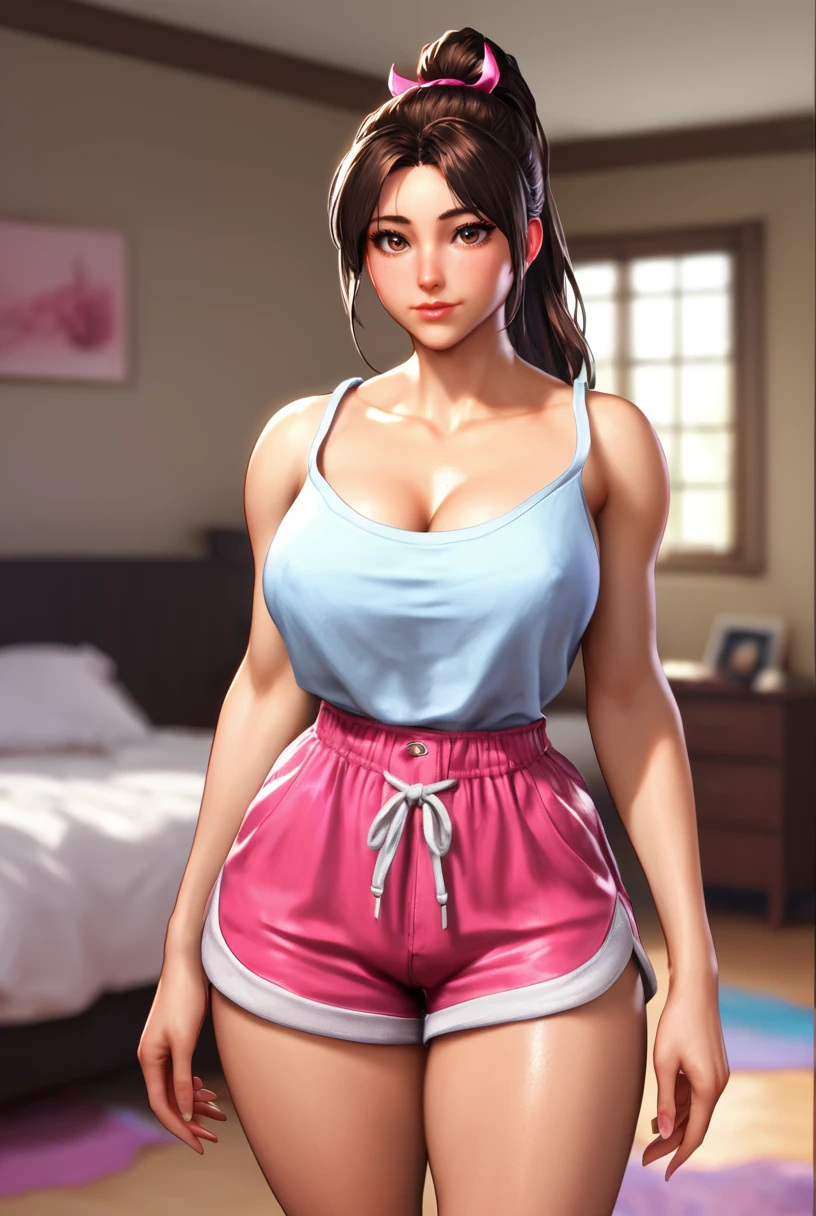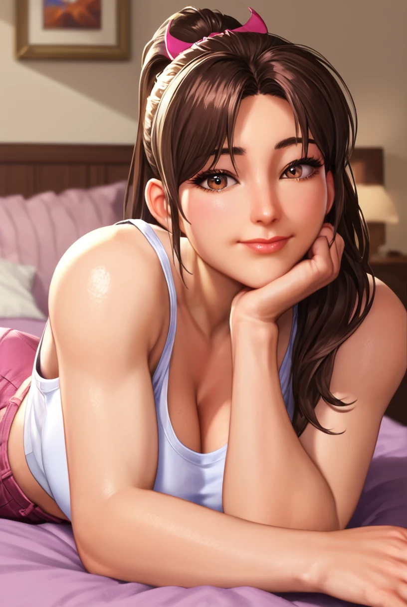 Use mashrni, 1girl, brown hair, ponytail, long hair, brown eyes, large breasts, for her base features,