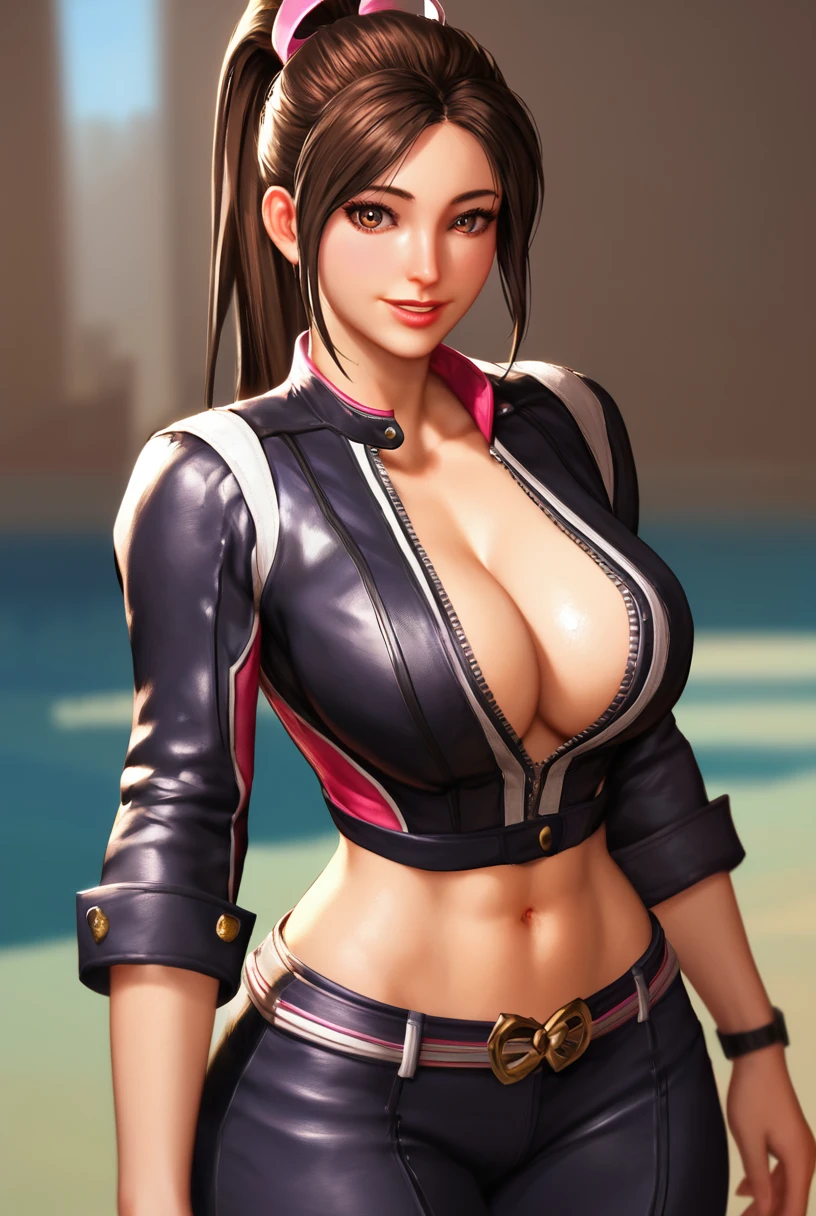 m_oft02, leather jacket, cleavage, midriff, pants,