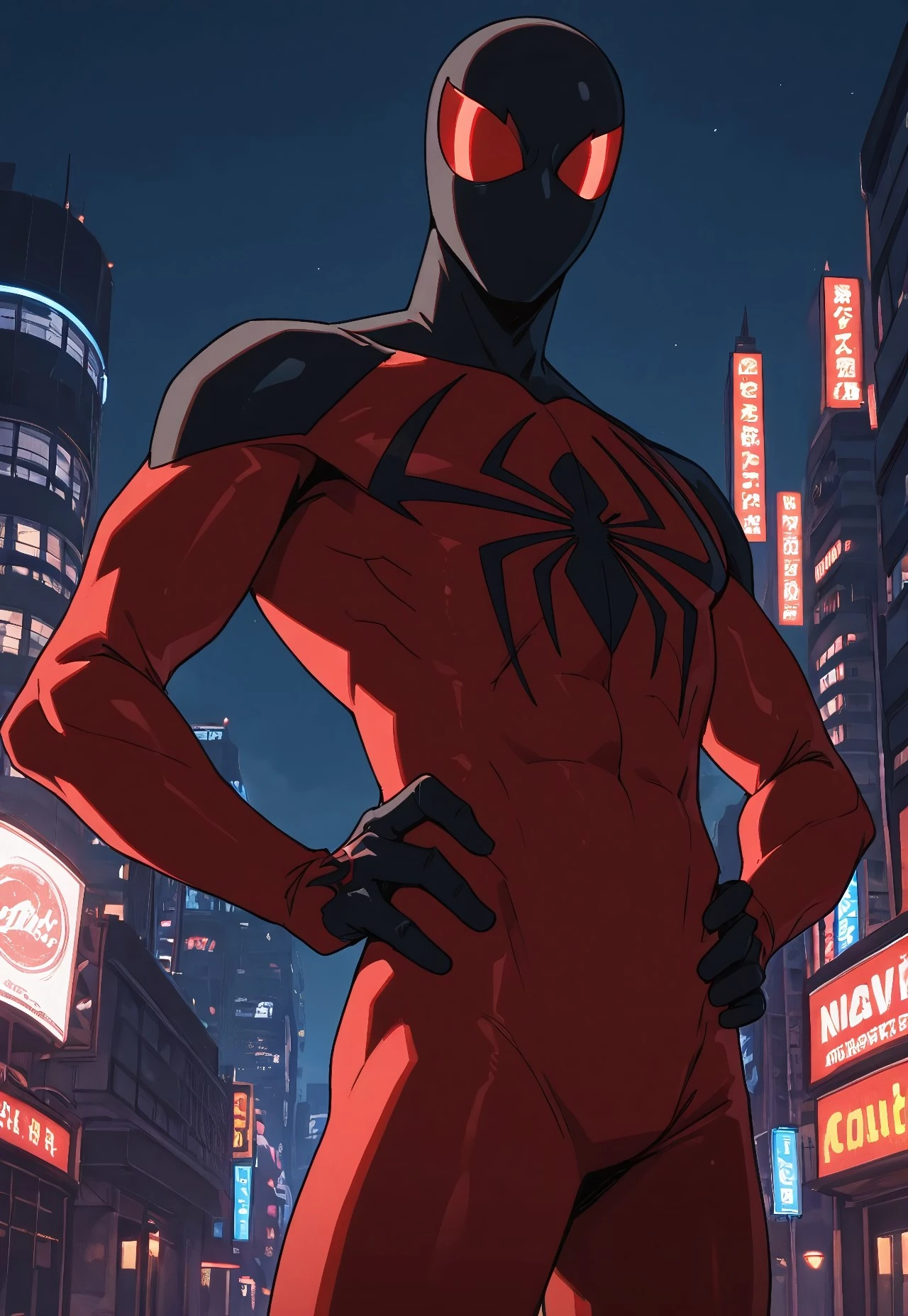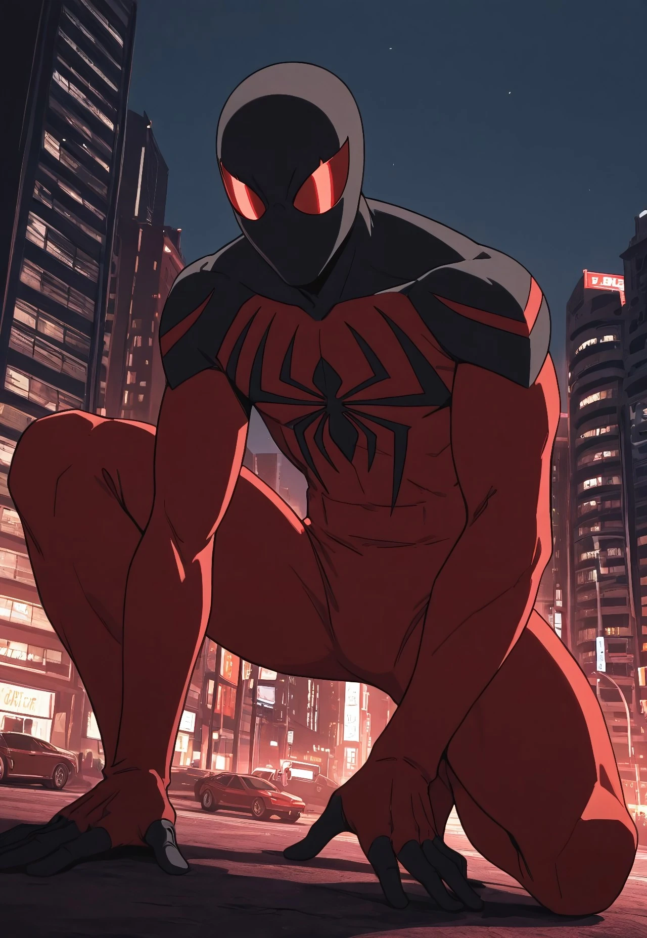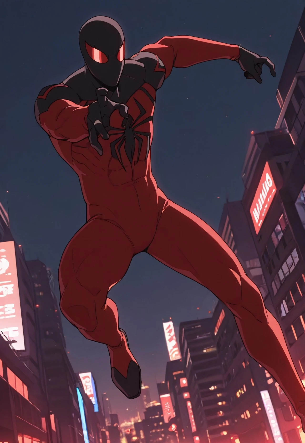 ultimate_scarletspoder(cartoon)IL, red_, , spider print, black print, 1boy, solo, muscular, red_lenses, black_fingers, mask,