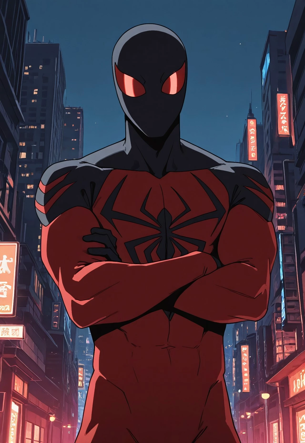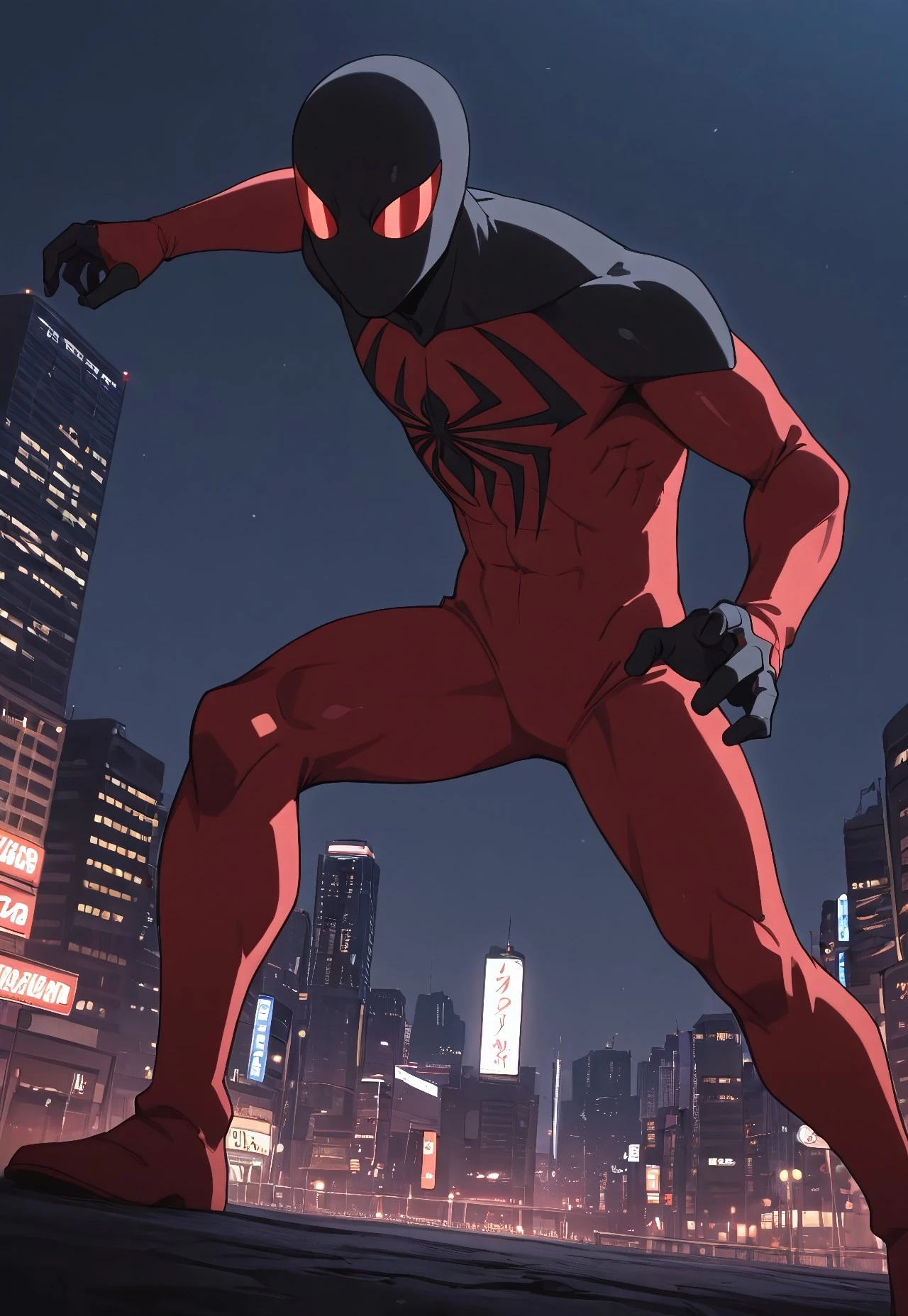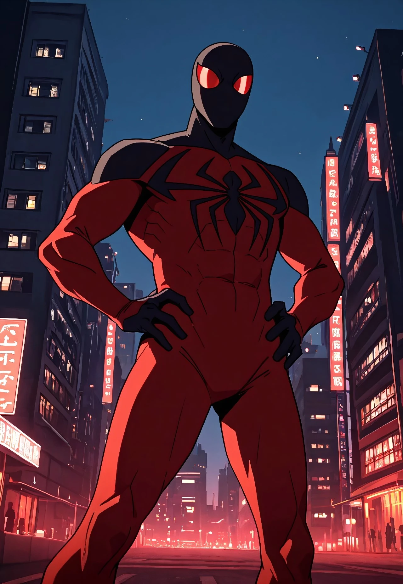 ultimate_scarletspoder(cartoon)IL, red_, , spider print, black print, 1boy, solo, muscular, red_lenses, black_fingers, mask,