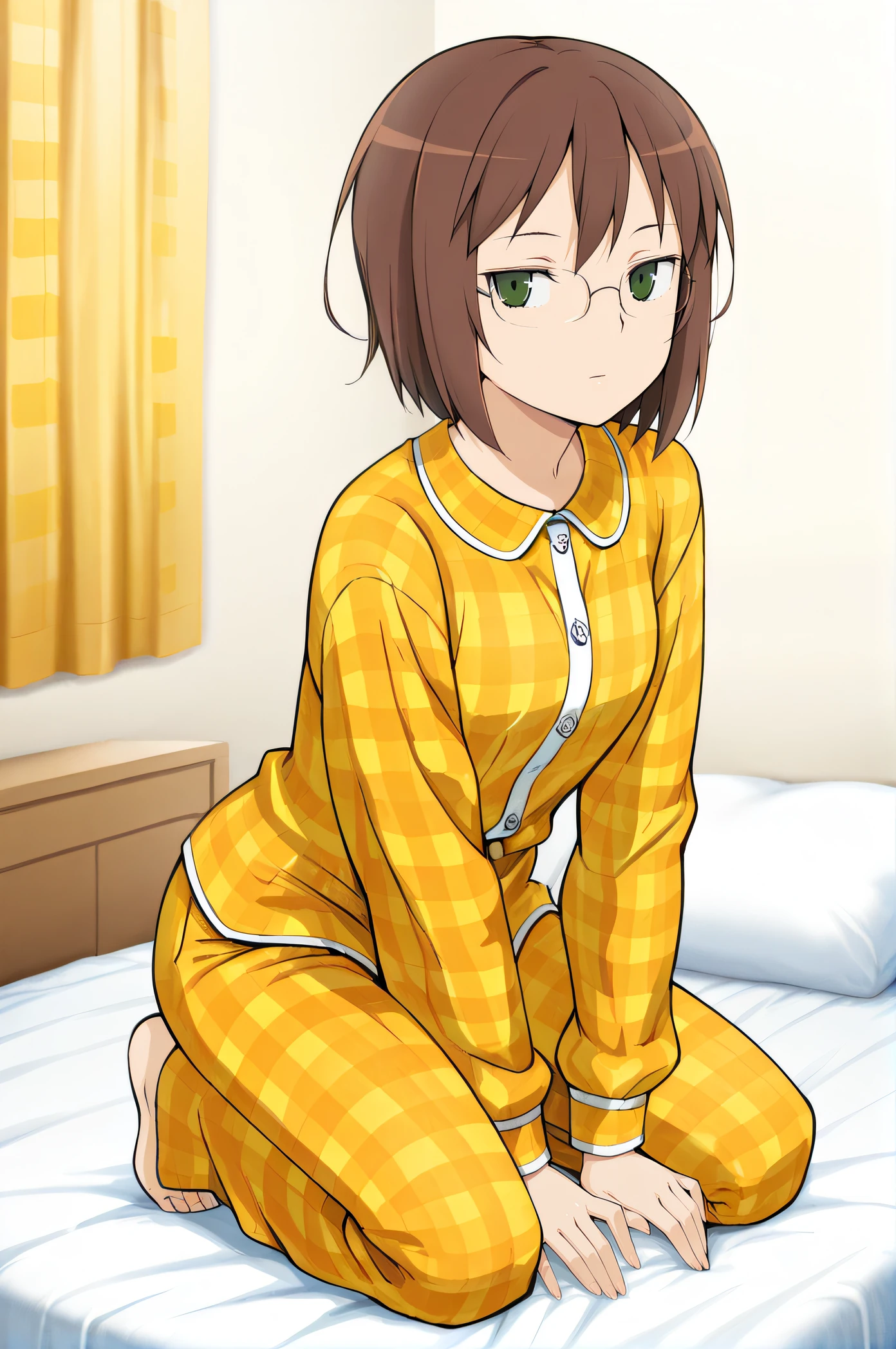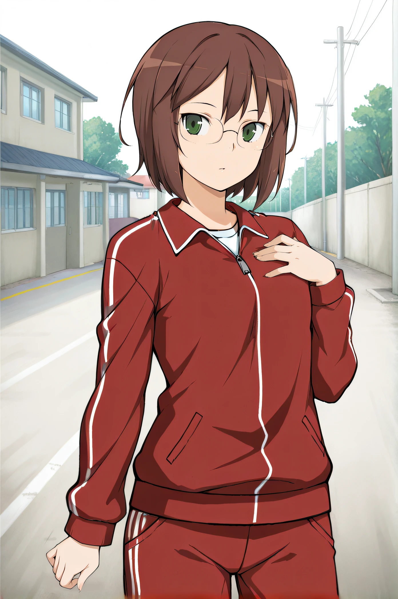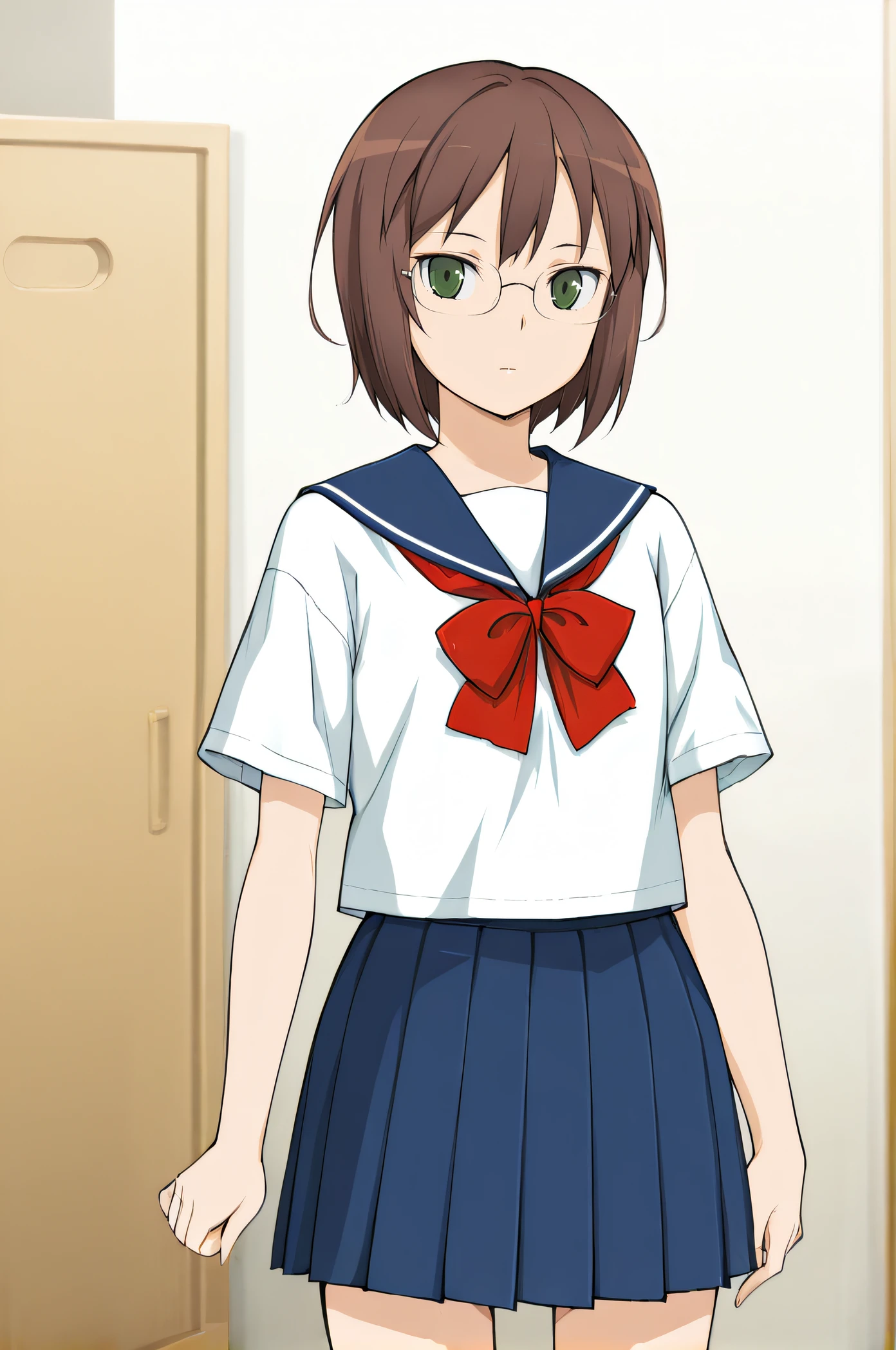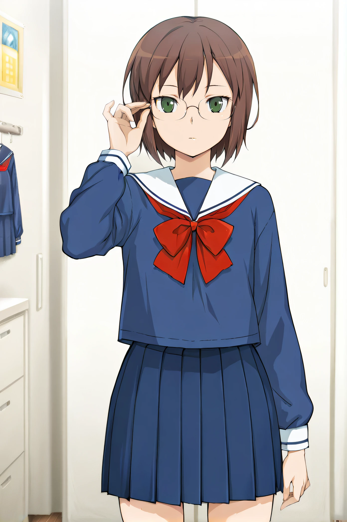 nayuta, green eyes, short hair, brown hair, glasses