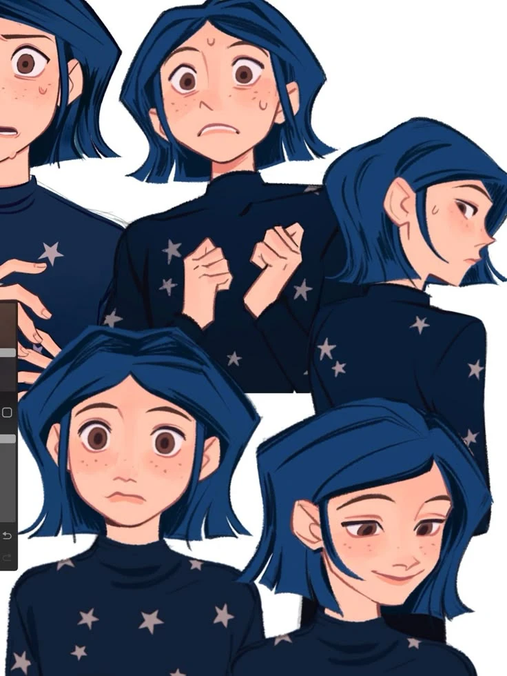 petite body:1.8,short blue hair, brown eyes,little freckles,