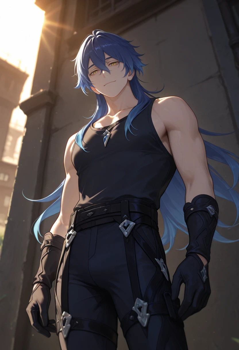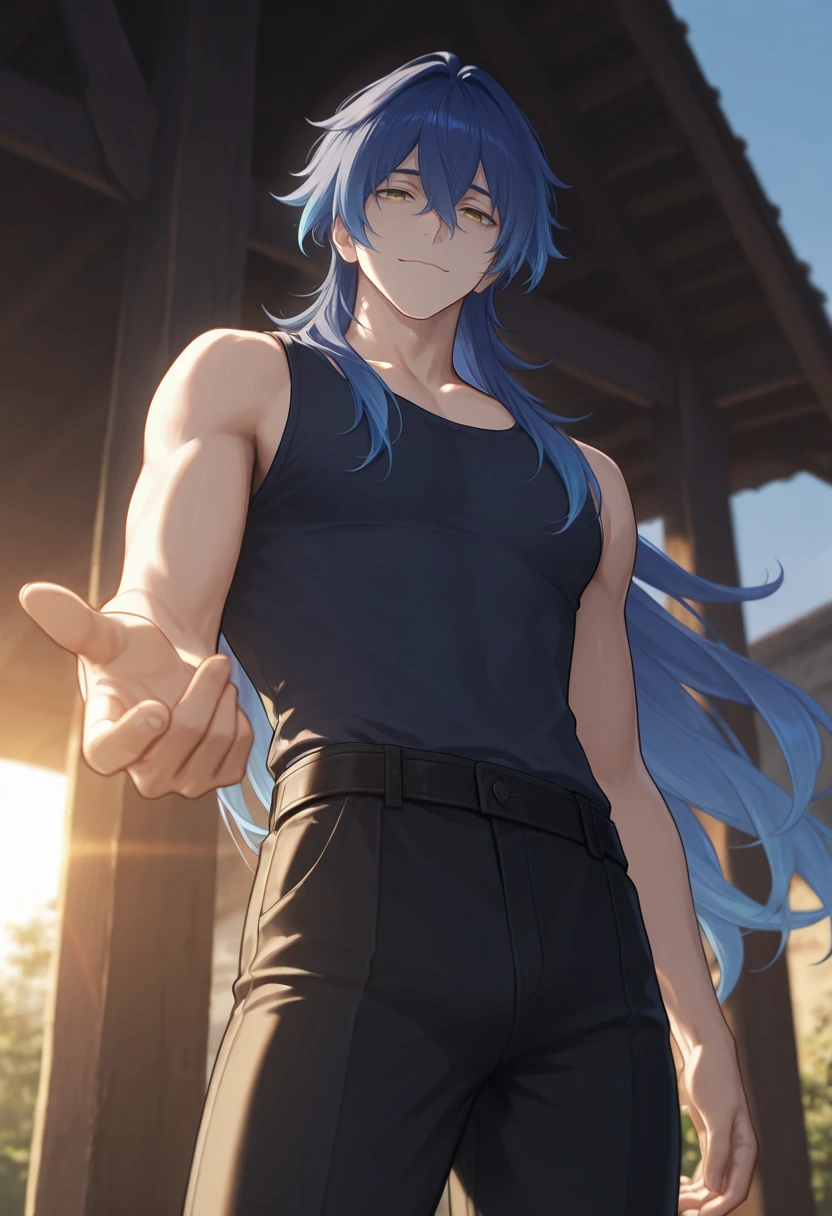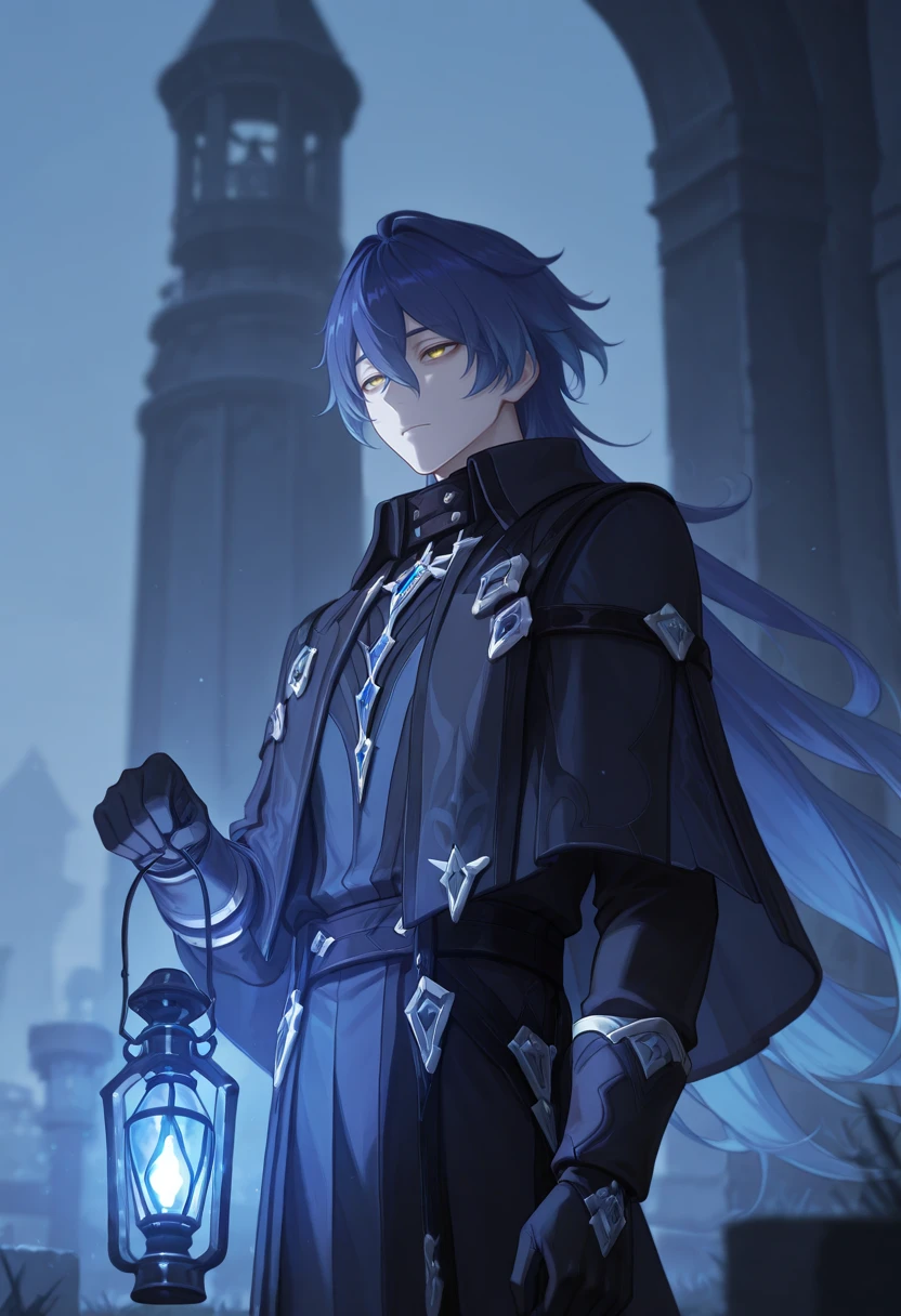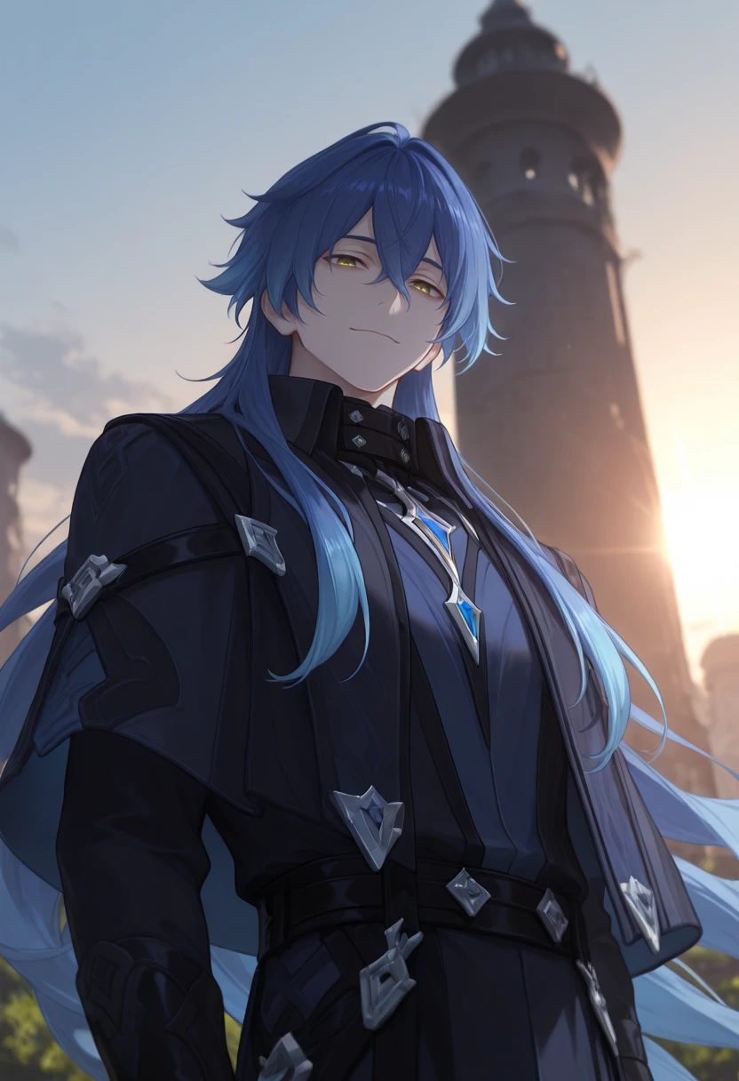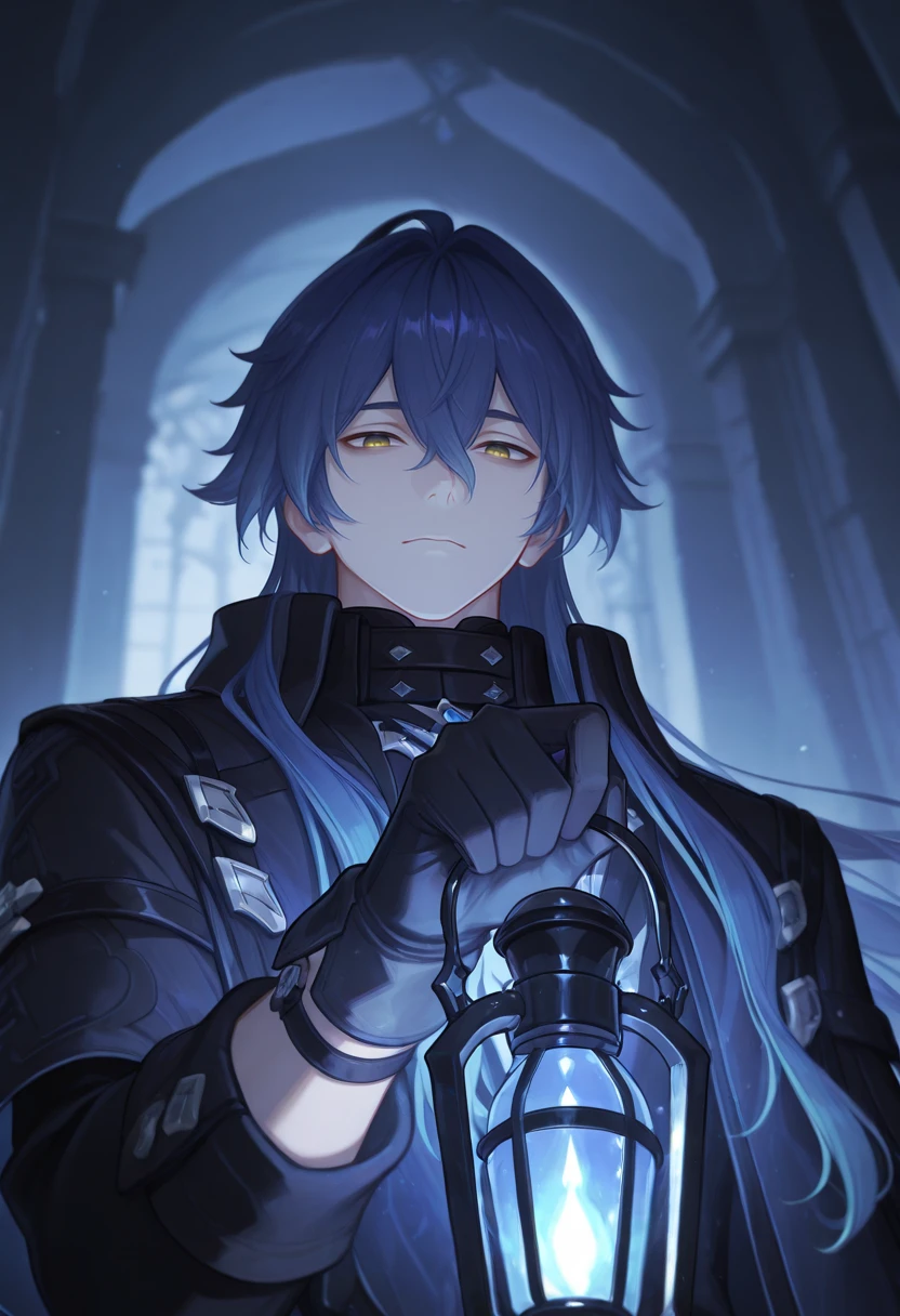flins,yellow eyes,long hair,blue hair,hair between eyes