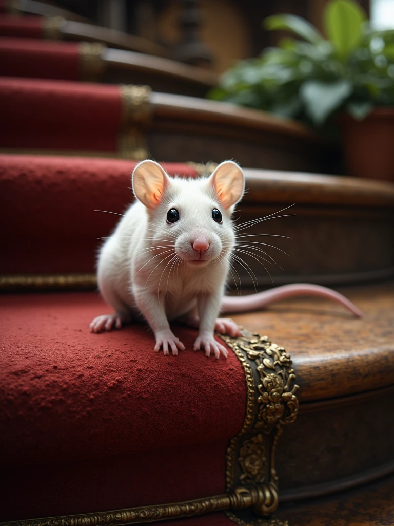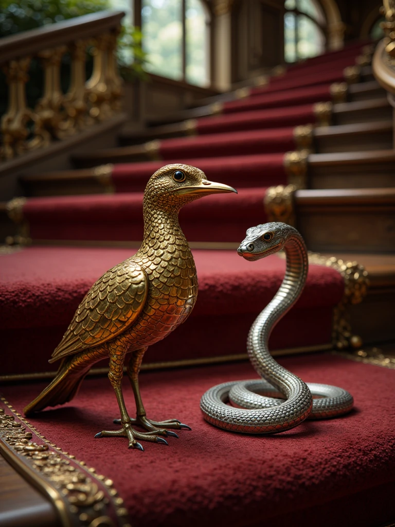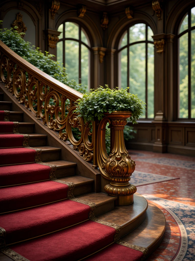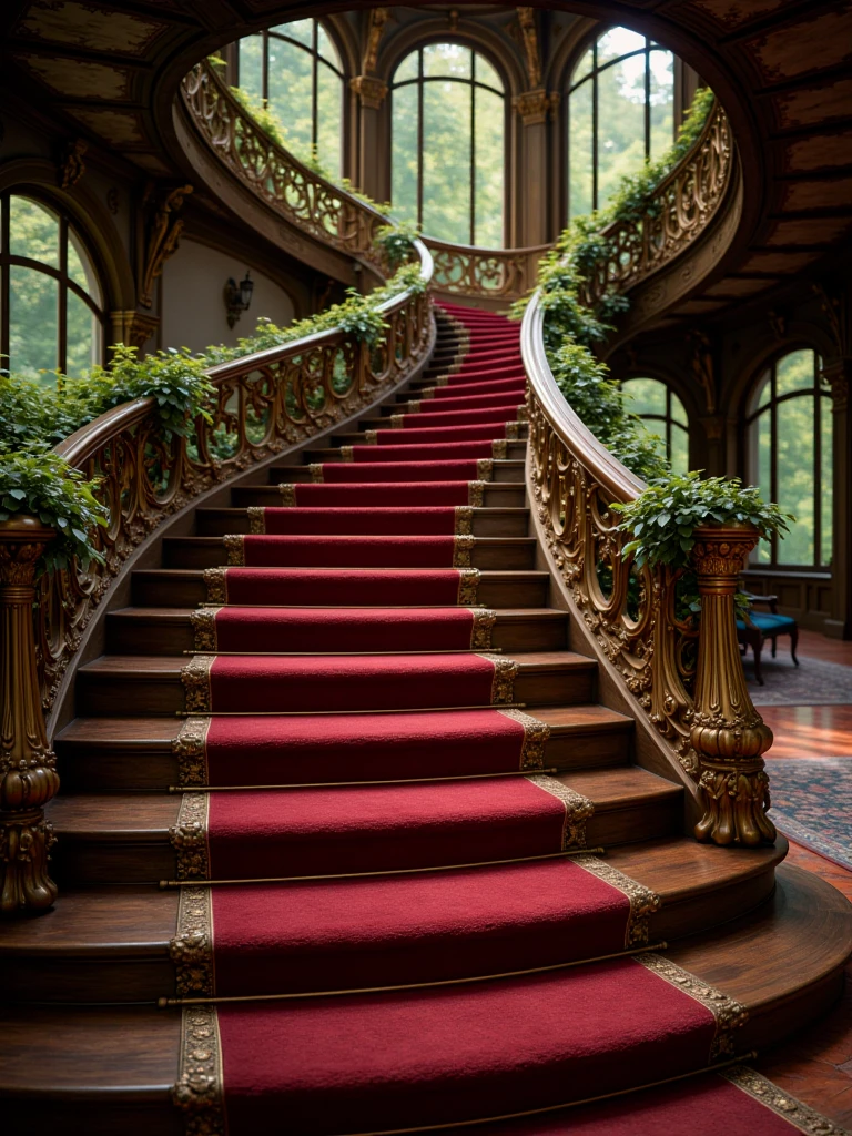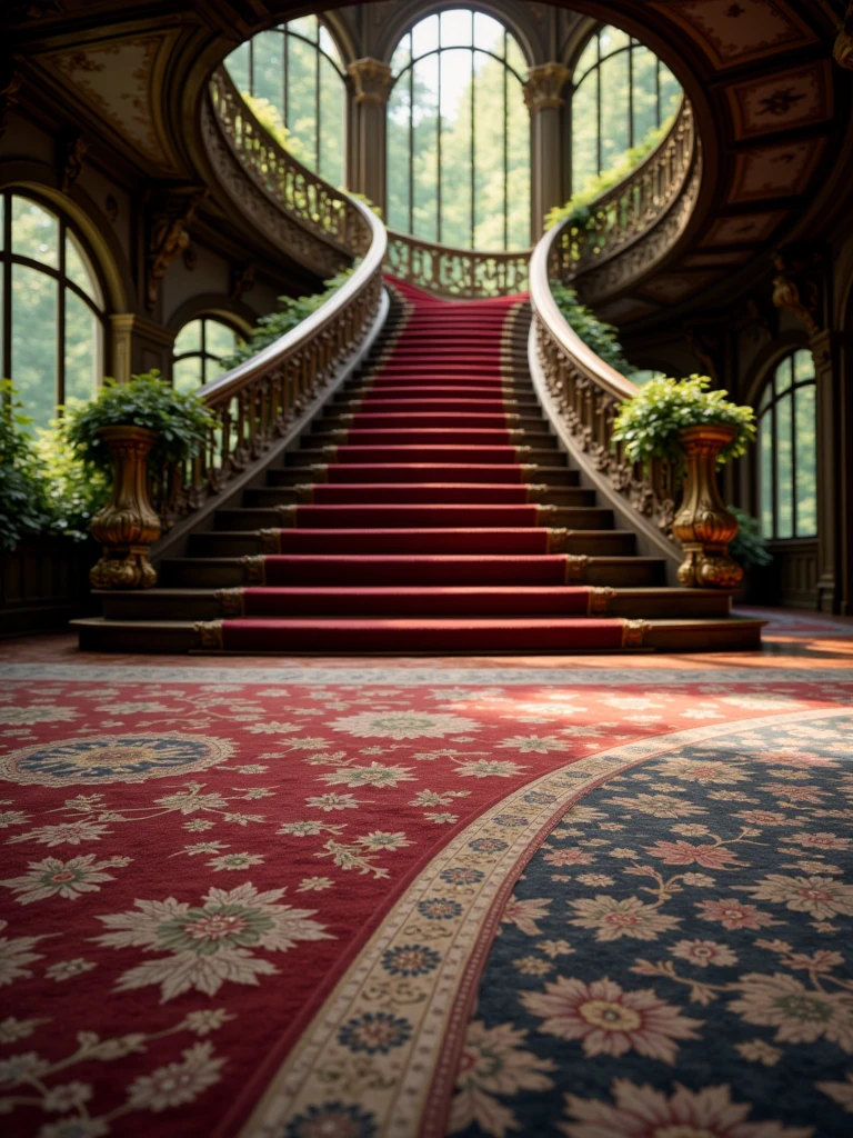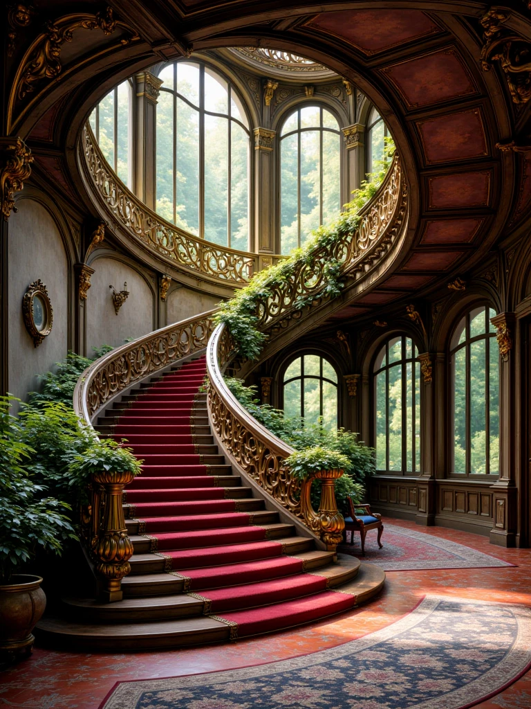 fantasy interior with a grand staircase, sunlit mansion interior featuring an ornate curved staircase with red carpeted steps and gilded balustrades, lush greenery and ornamental indoor plants integrated into the architecture, tall arched windows illuminating the space with natural light, reflections on a polished marble floor and an elegant patterned rug, antique wooden furniture including upholstered chairs and decorative tables, richly detailed walls and architectural elements creating a luxurious, old-world atmosphere