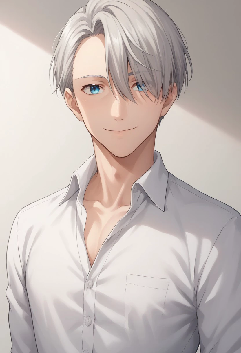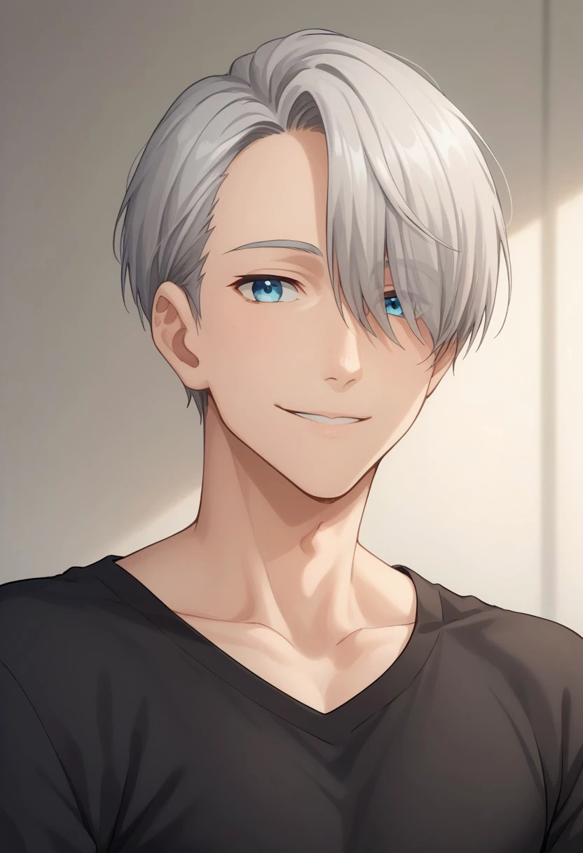 viktornikiforov, 1boy, male focus, blue eyes, grey hair, hair over one eye, shirt, black shirt, long sleeves, collarbone, belt, pants