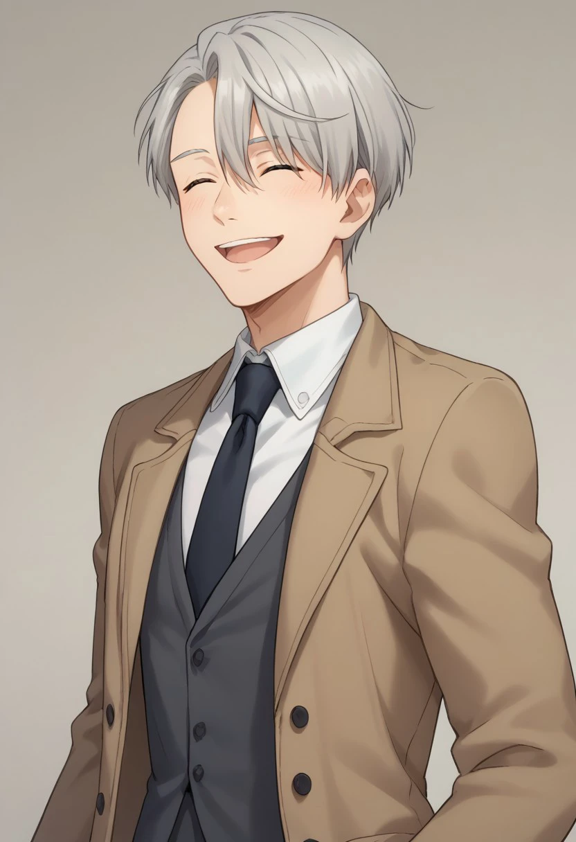 viktornikiforov, 1boy, male focus, closed eyes, necktie, open mouth, smile, grey hair, ^ ^, coat, vest, shirt, white shirt, belt, pants