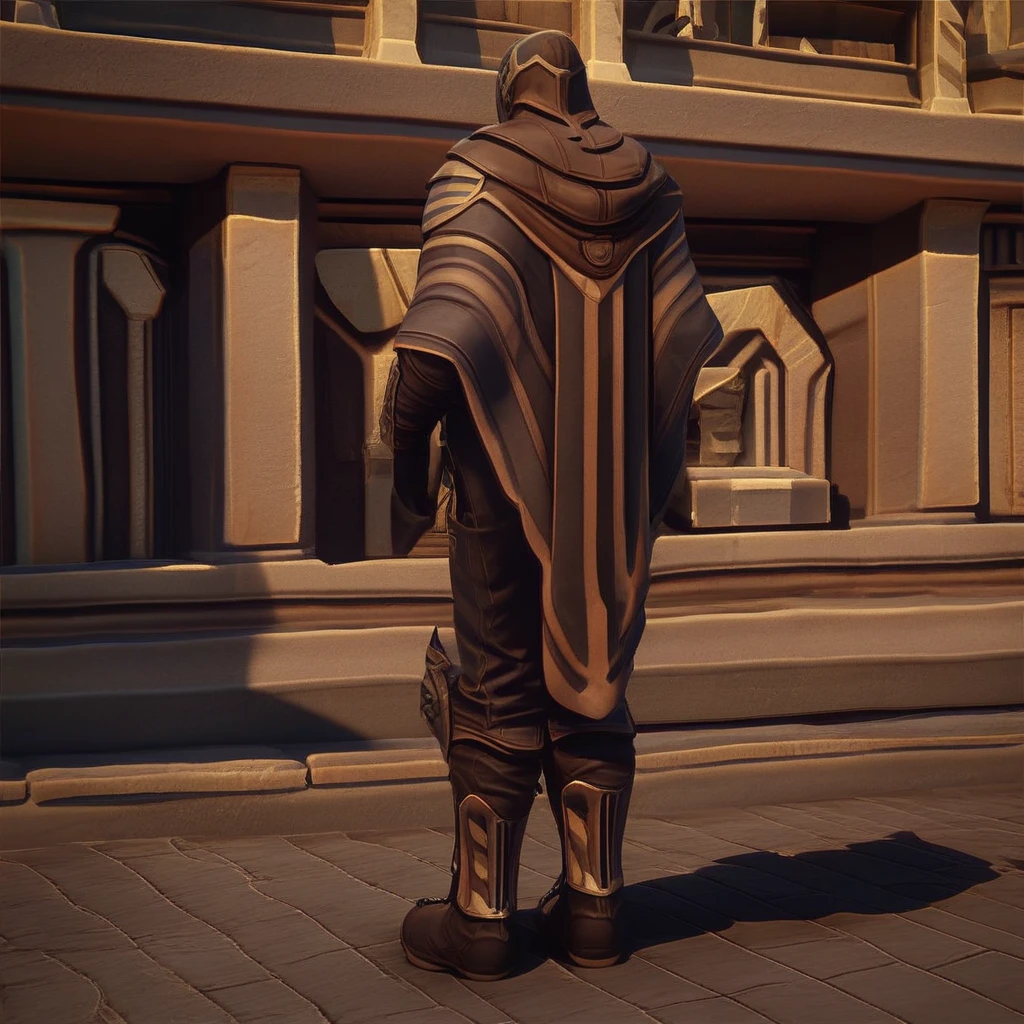 Onderon Guardian Armor, solo, 1boy, gloves, standing, full body, male focus, boots, hood, cape, armor, helmet, full armor