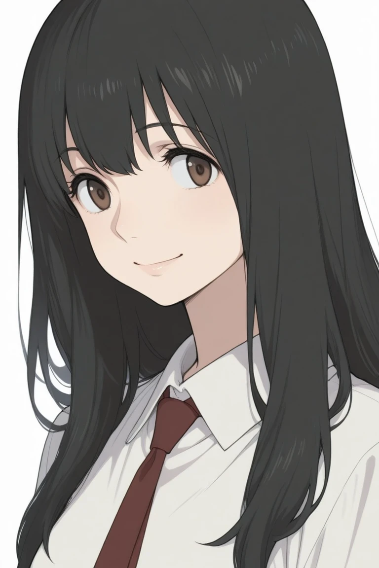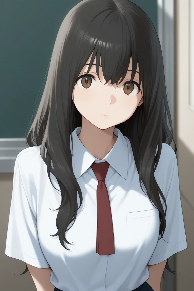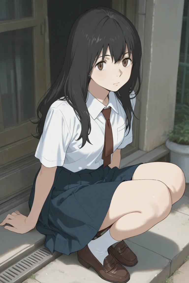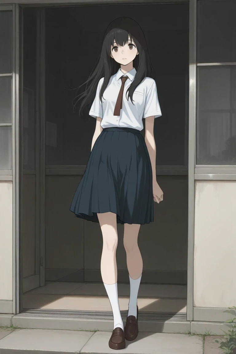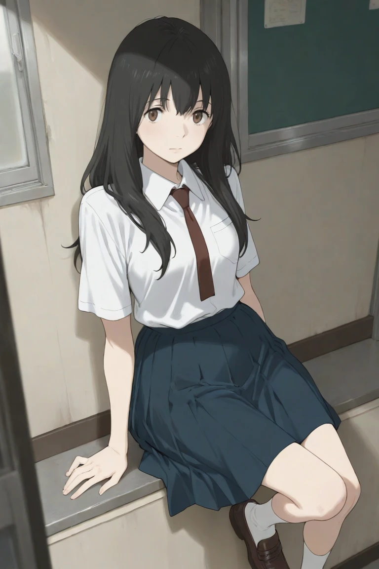 ruka_belle,black long hair,brown eyes,black long hair,brown eyes,necktie,shirt,skirt,white socks,loafers,anime coloring