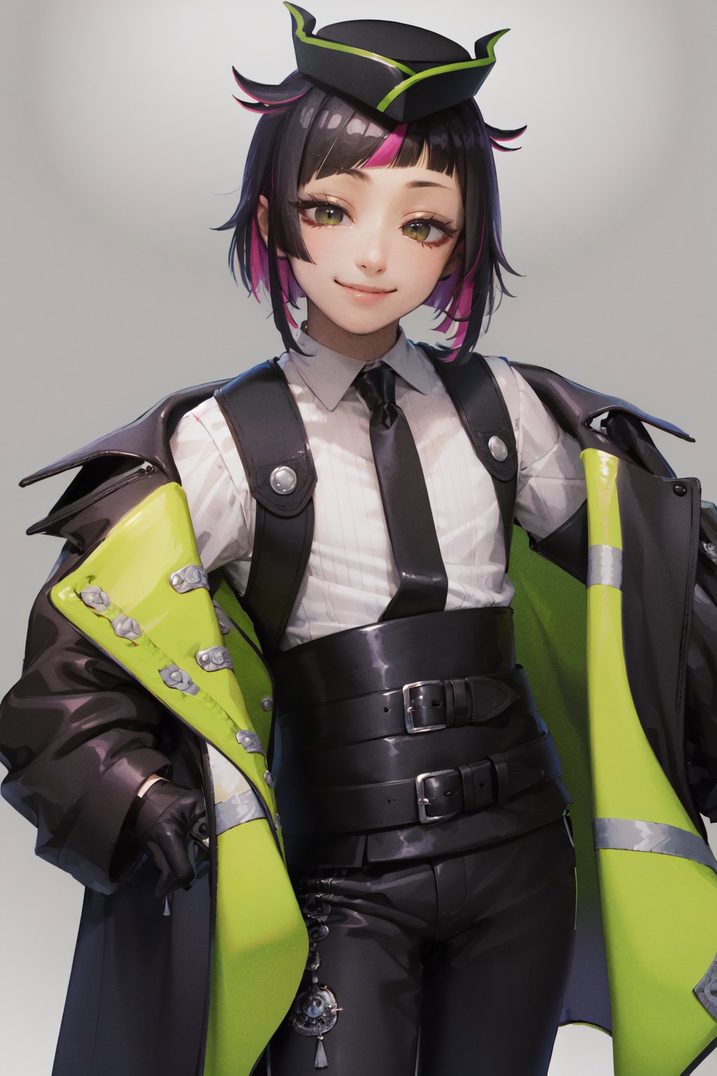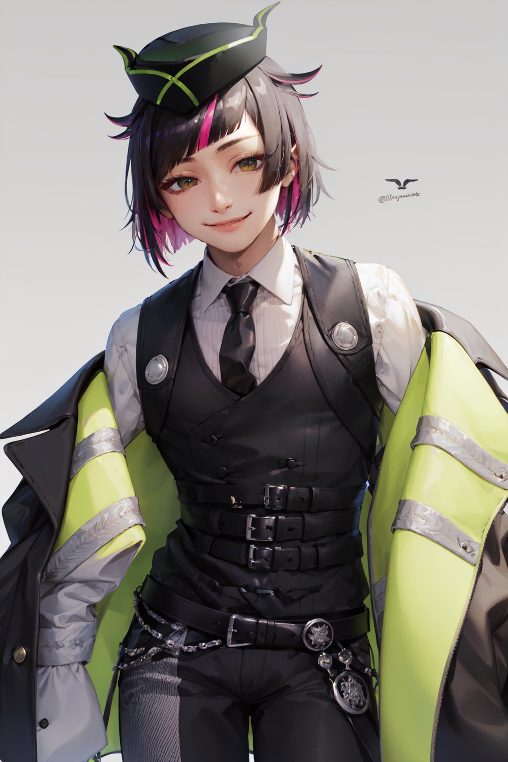 Default Outfit: hat, off shoulder, jacket, white shirt, black necktie, long sleeves, black pants, black gloves