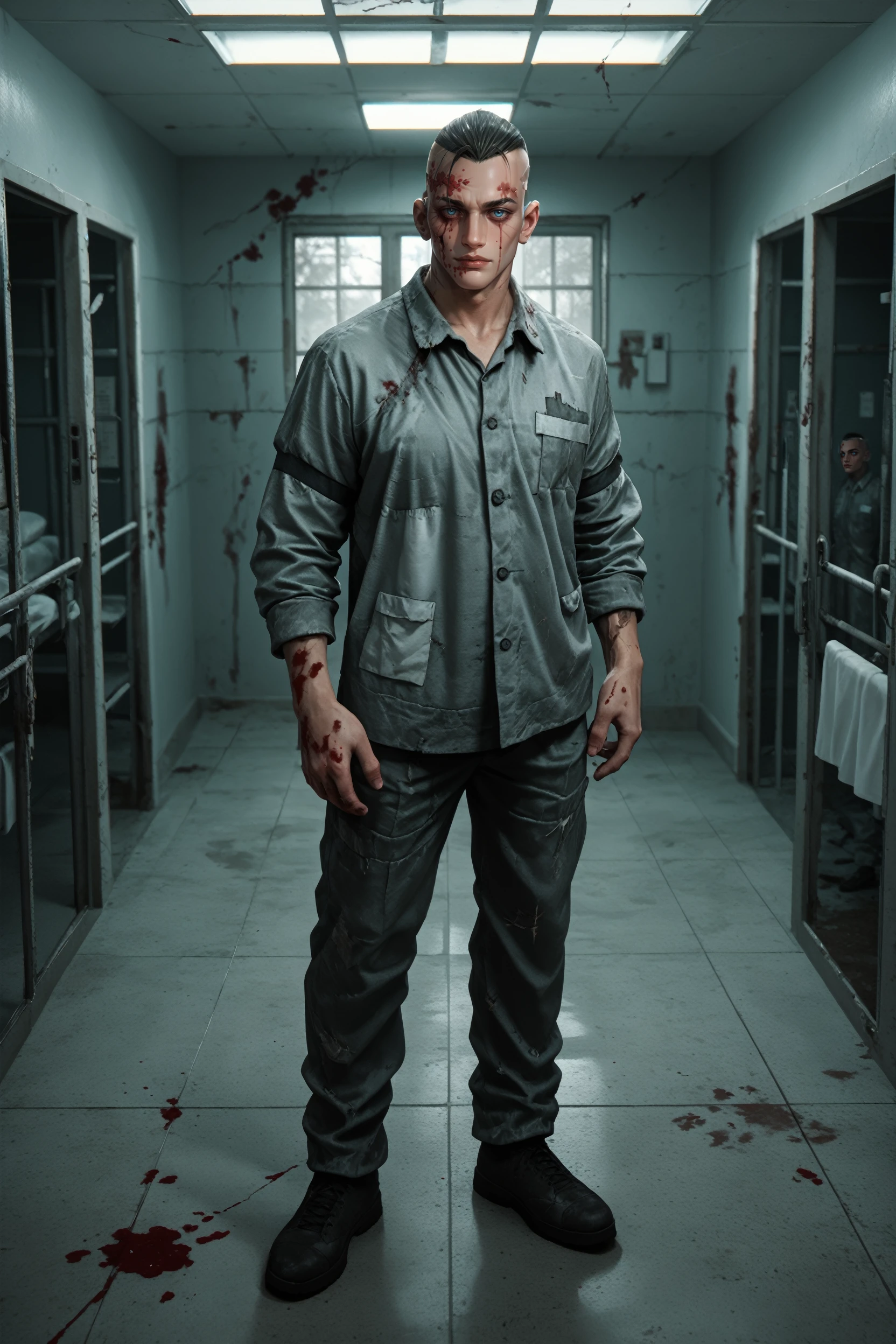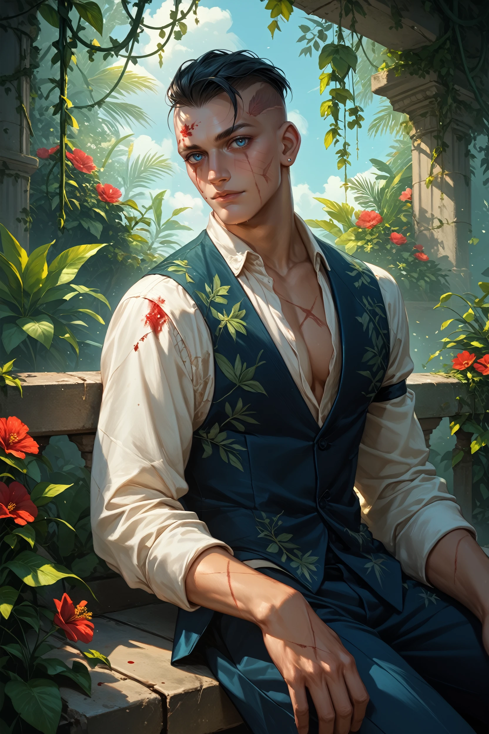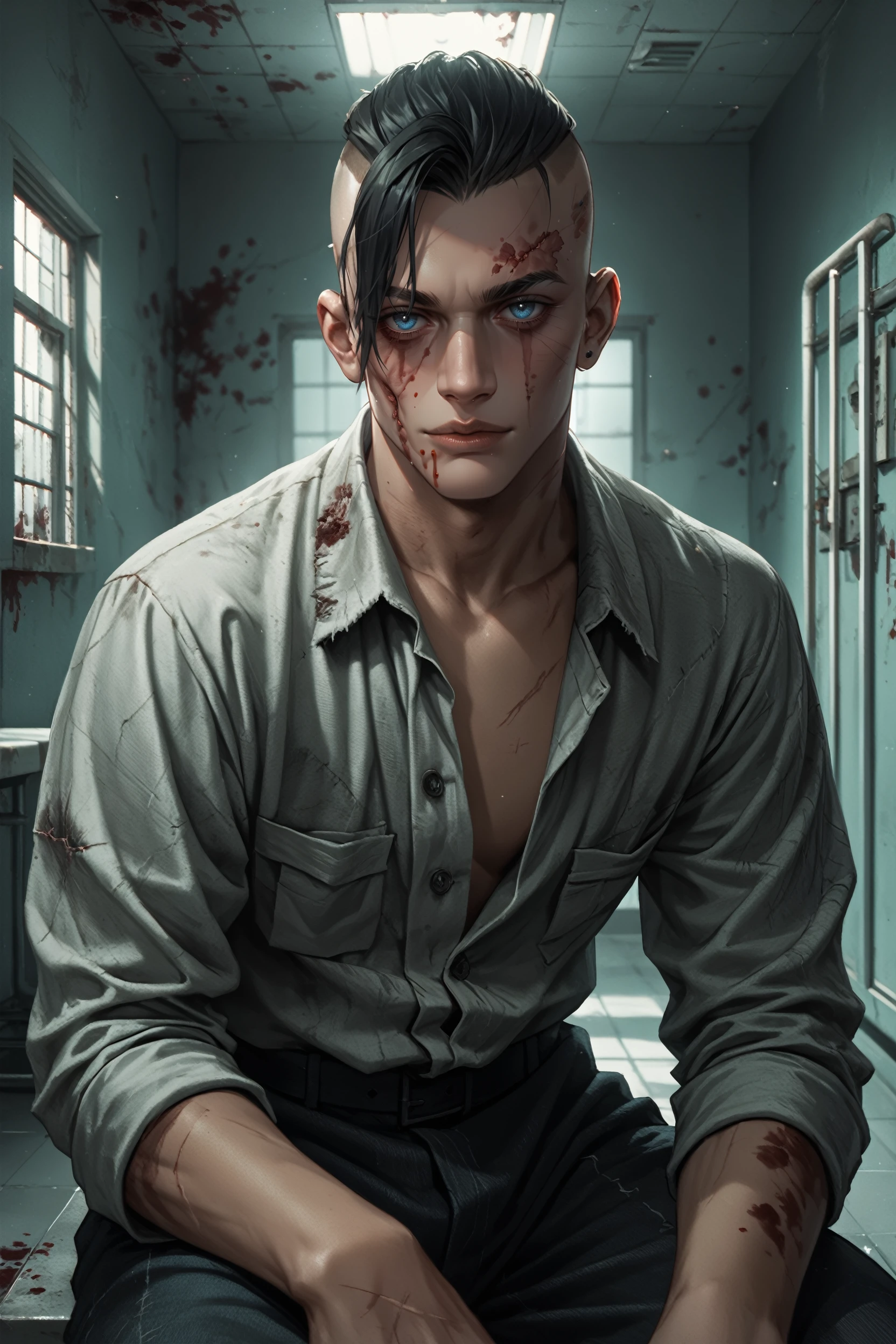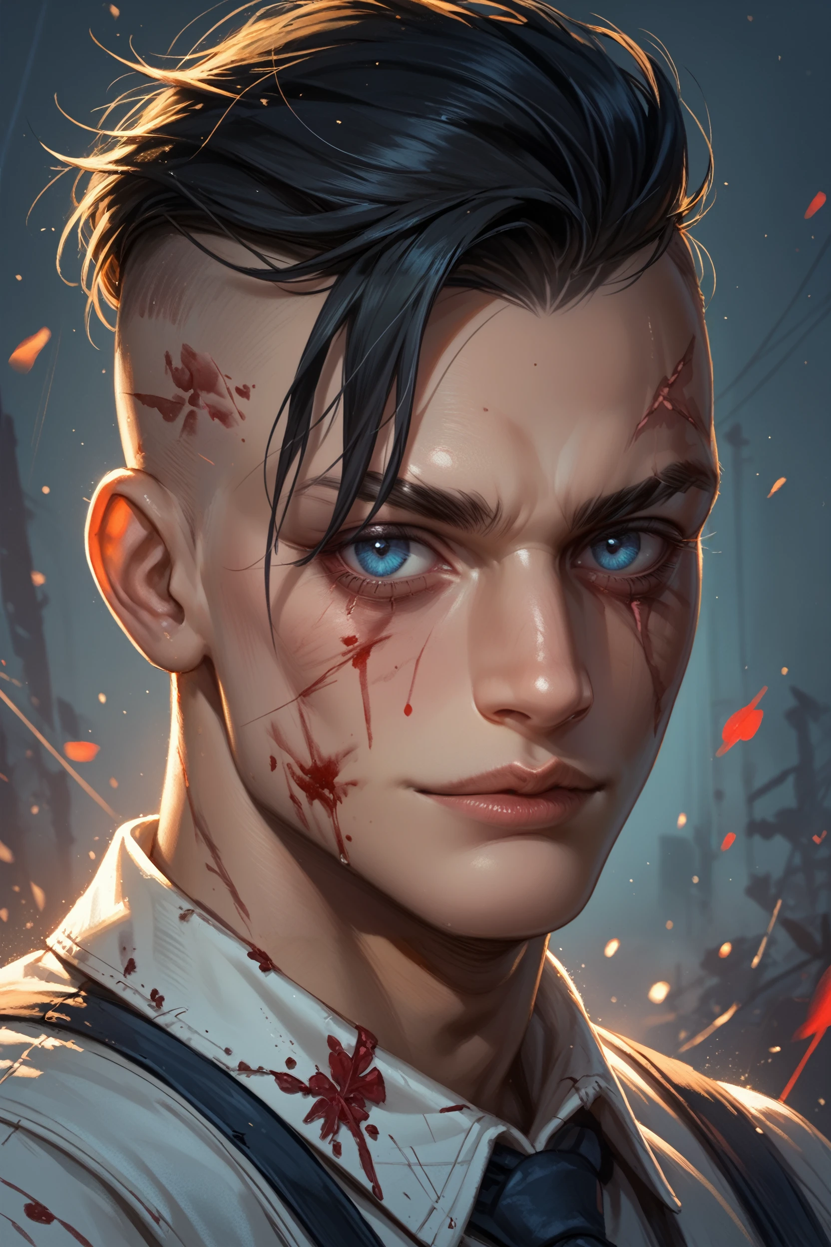 OEddieG, 1boy, black hair, undercut, blue eyes, blood, scars
