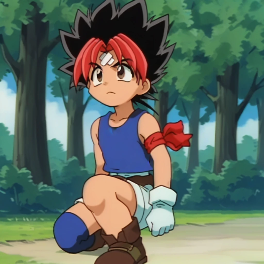 Prompts: male, multicolored hair, two-tone hair, black hair, red hair, spiked hair, dyed bangs, bandaid on forehead, brown eyes, tank top, single armband, gloves, belt, belt pouch, shorts, single legband, boots, outdoors (forest/blue sky/tree), outdoors (field/mountains/bush), outdoors (beach/sky/cloud/sand/ocean/rock formations), outdoors (desert), outdoors (battlefield/dead tree), cockpit/window