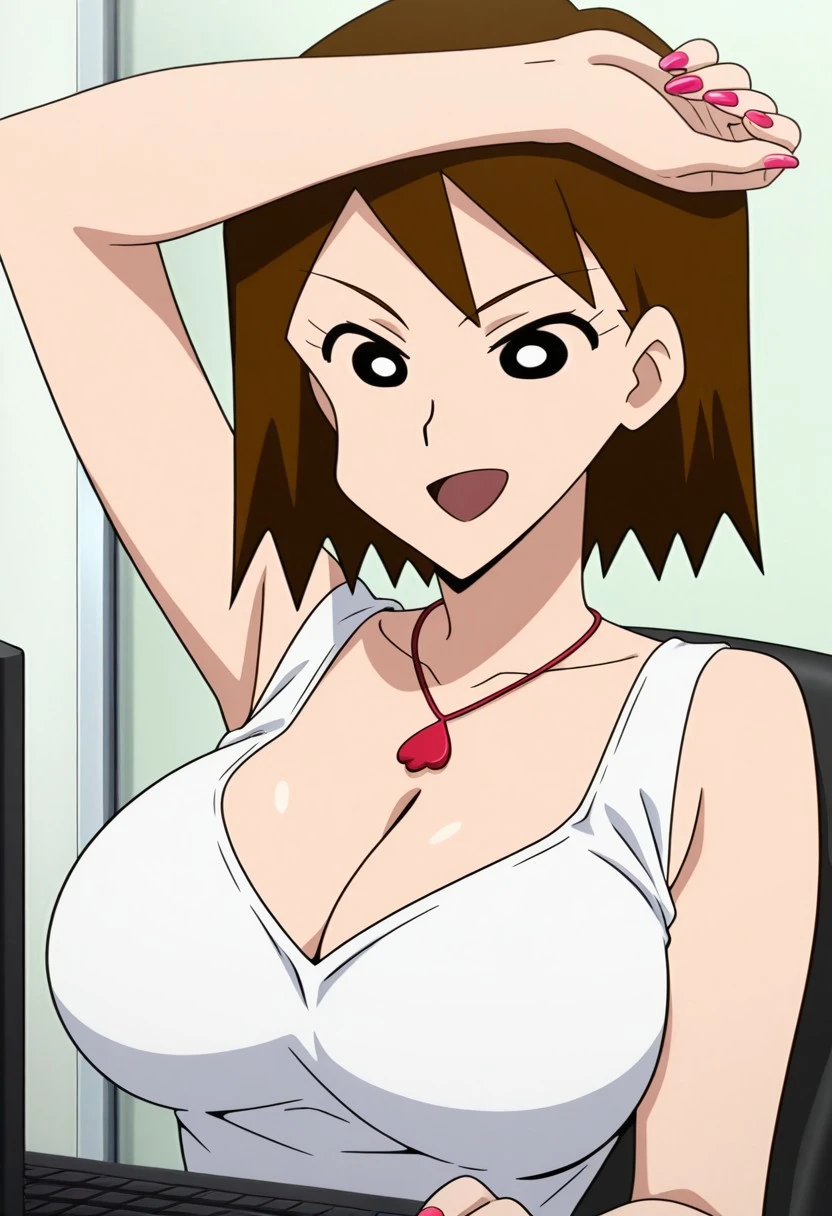 urara, brown hair, short hair, black eyes, cleavage, breasts, large breasts,