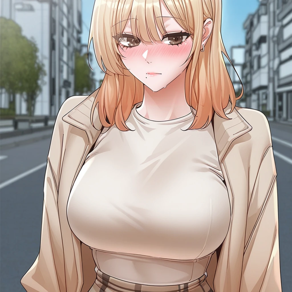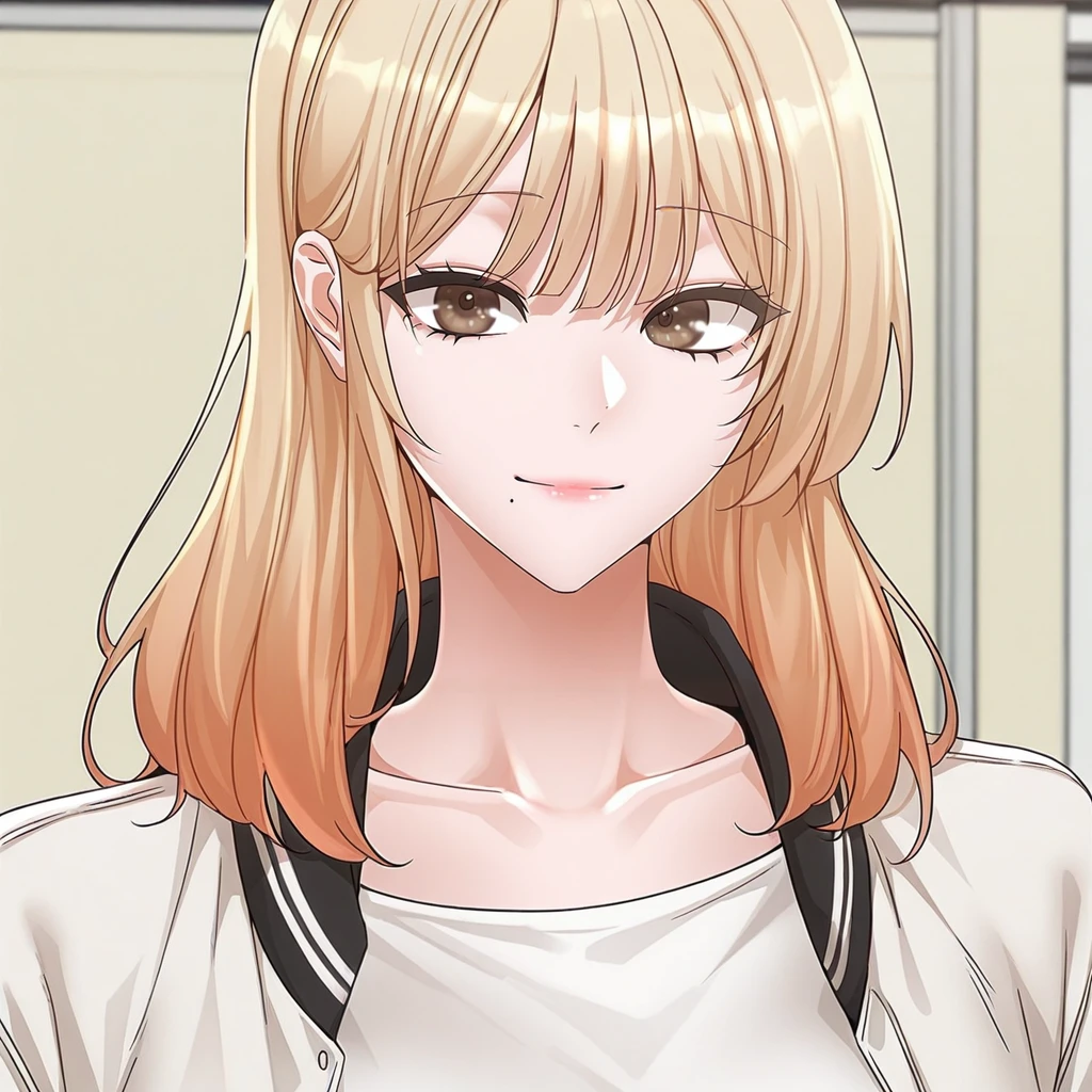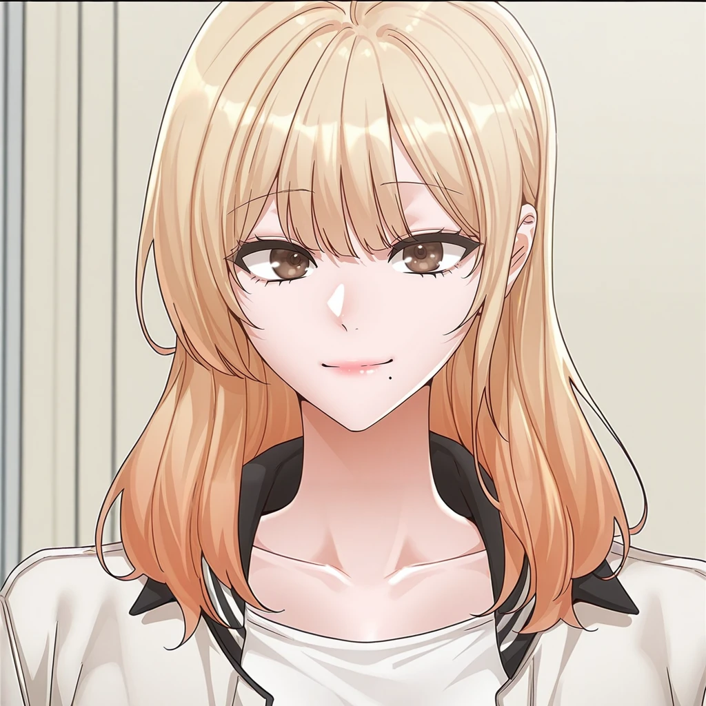 da-young_park-circles, 1girl, blonde hair, single mole under mouth, bangs, long hair, brown eyes,