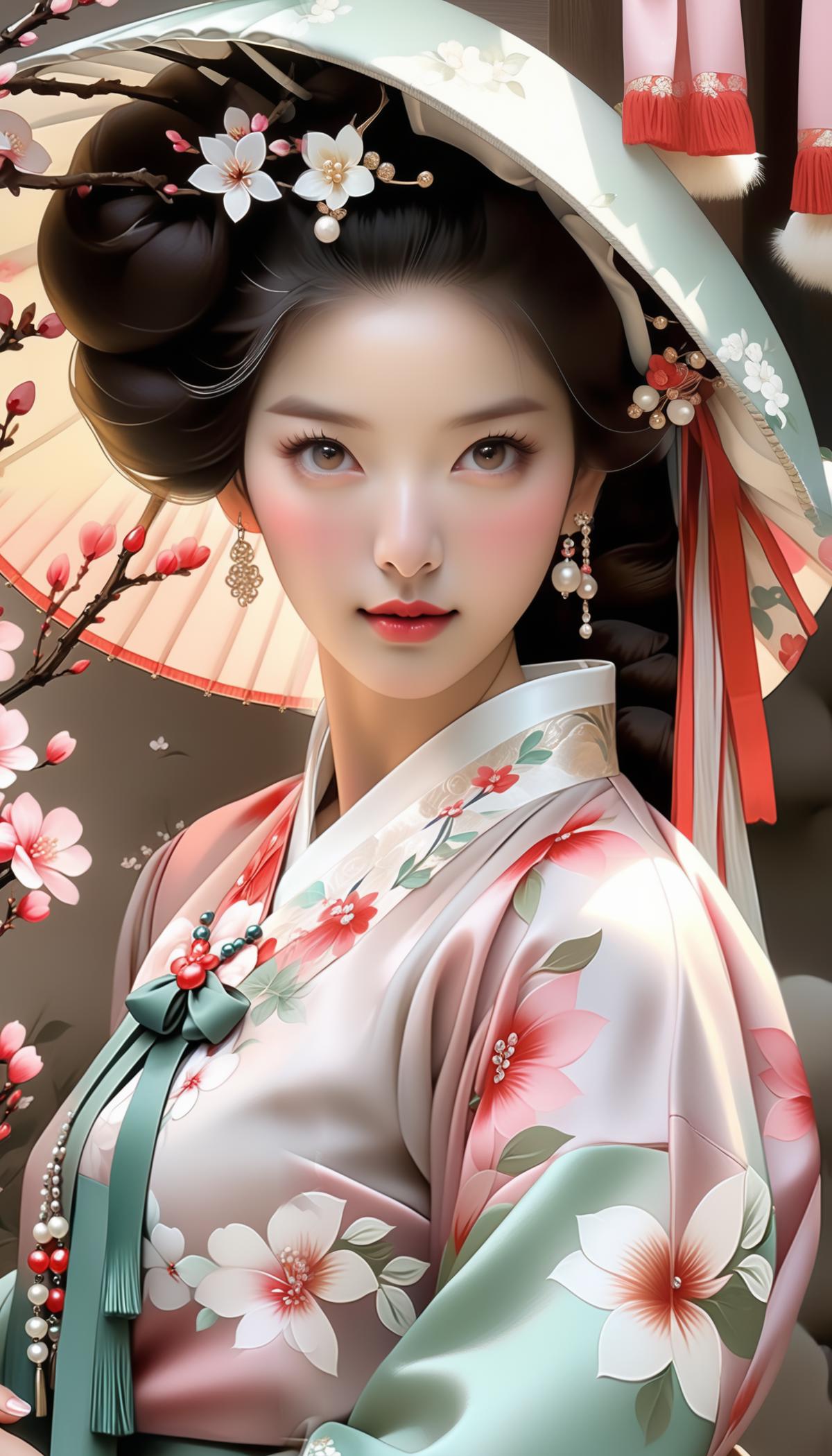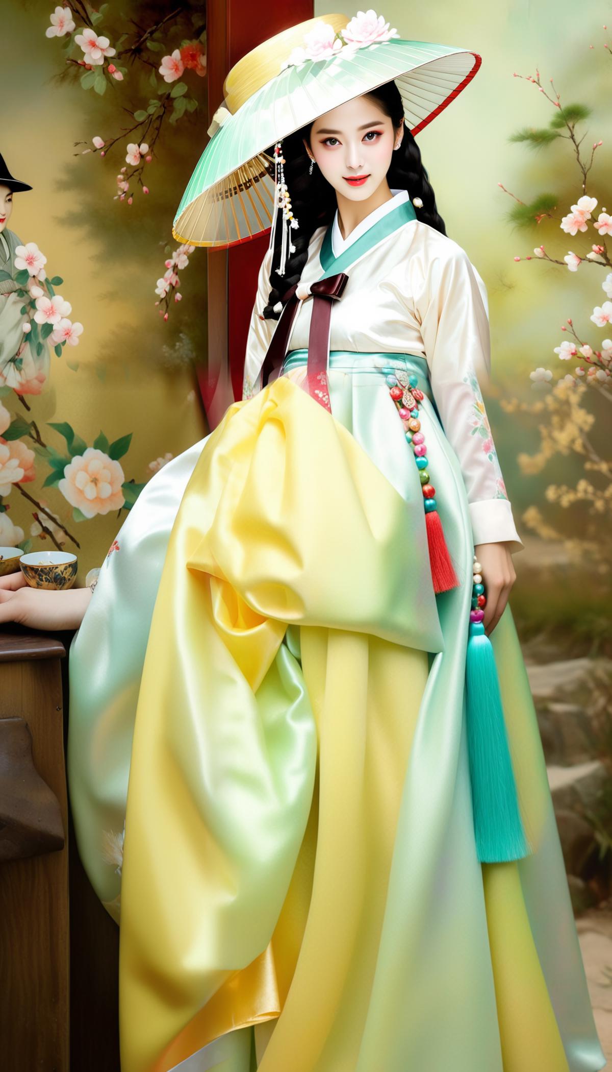 What is different from the existing hanbok LoRA is that it trained a special class called gisaeng to wear hanbok. A hanbok image with a more colorful design than the existing hanbok LoRA is created, and hat, hat(jeaonmo)