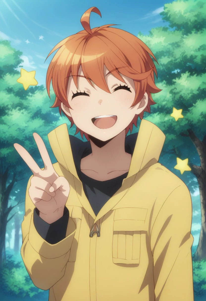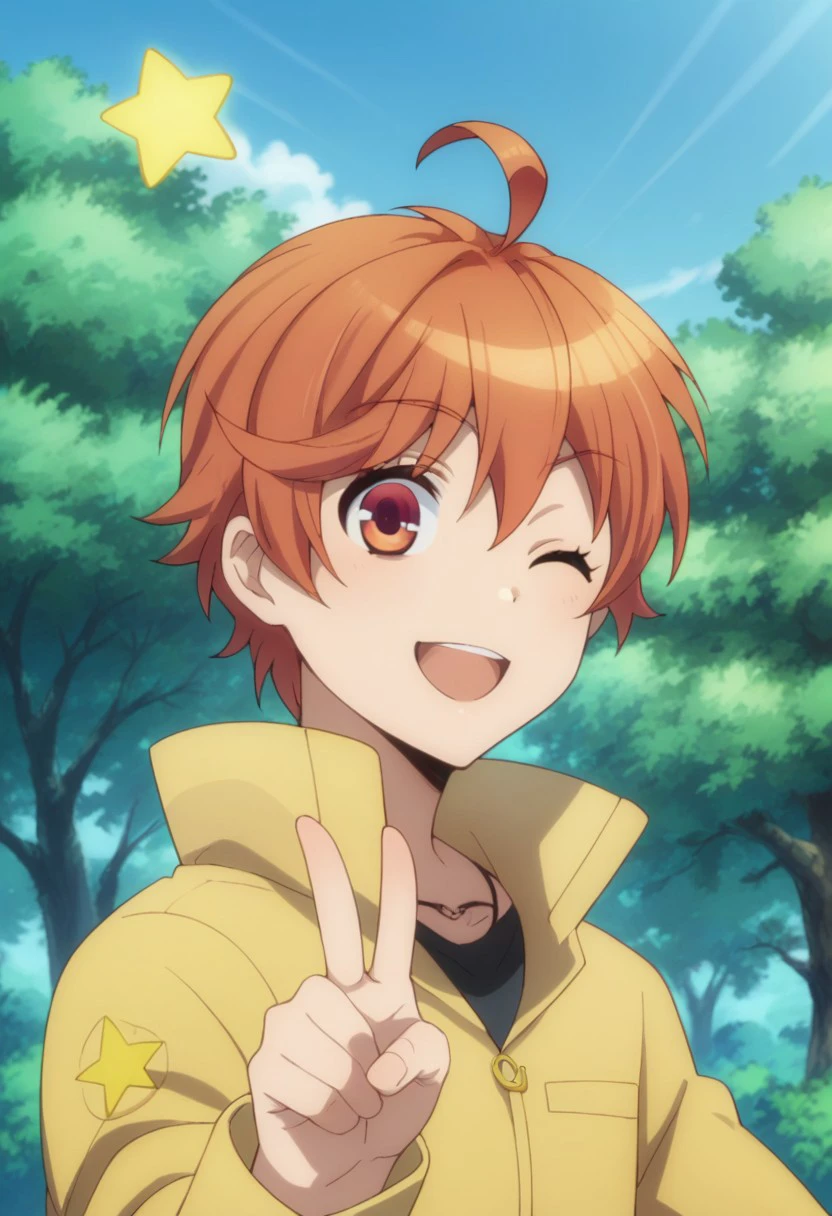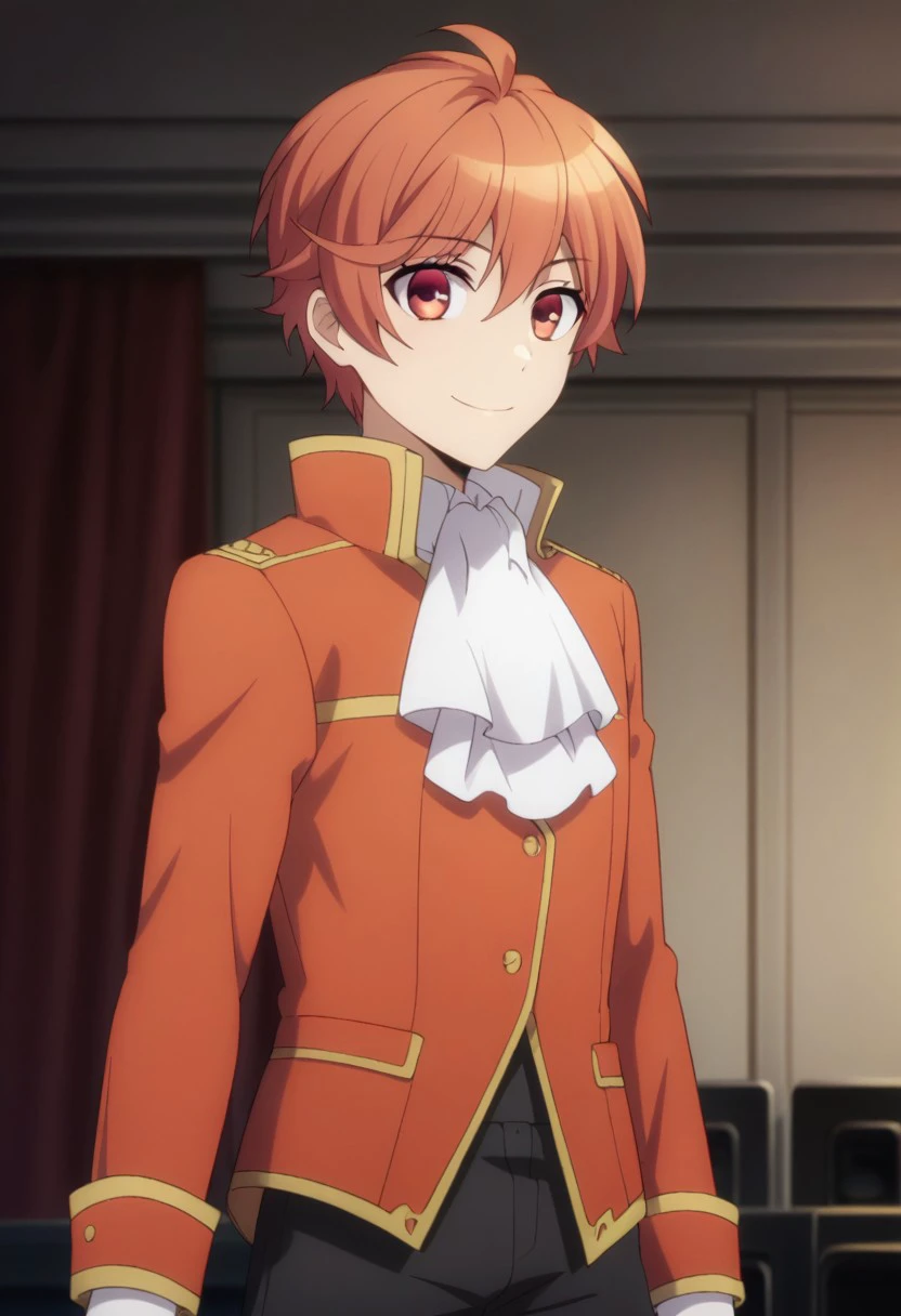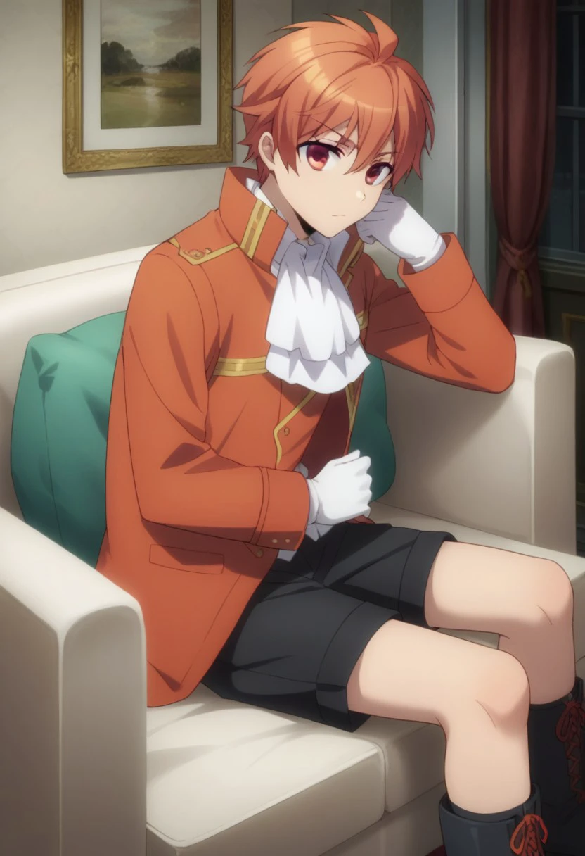 Idol - ryuji, 1boy, male focus, orange hair, ahoge, red eyes, gloves, white gloves, ascot, long sleeves, jacket, orange jacket, long sleeves, shorts, black shorts, socks, boots