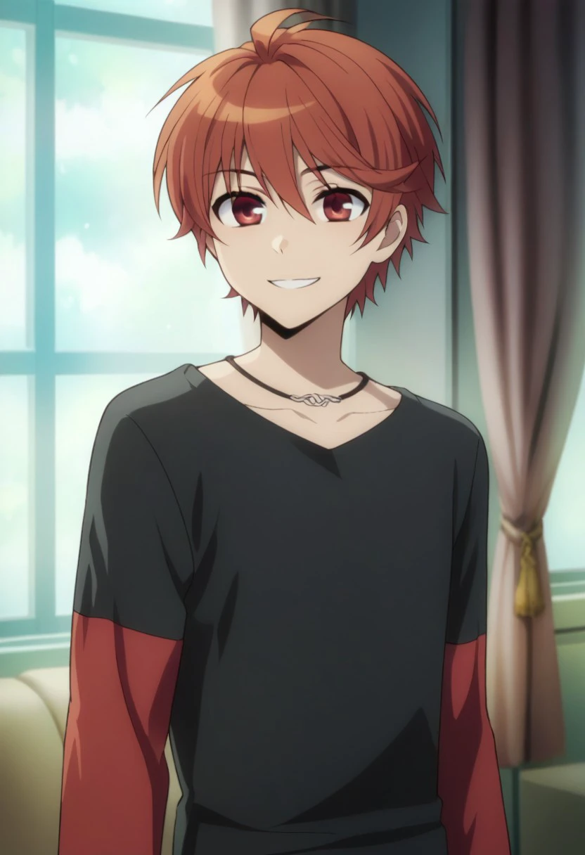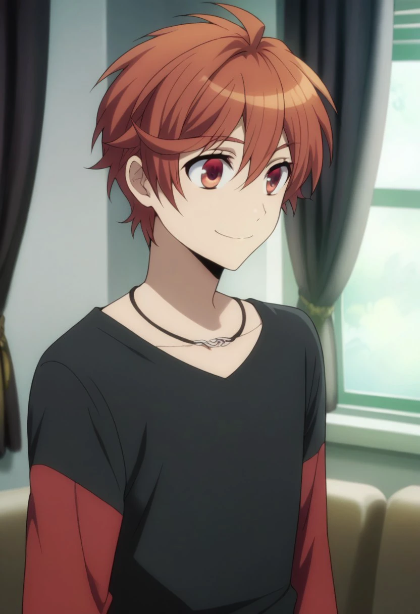 Casual #2 - ryuji, 1boy, male focus, jewelry, necklace, shirt, orange hair, ahoge, red eyes, black shirt, red sleeves, long sleeves, denim,