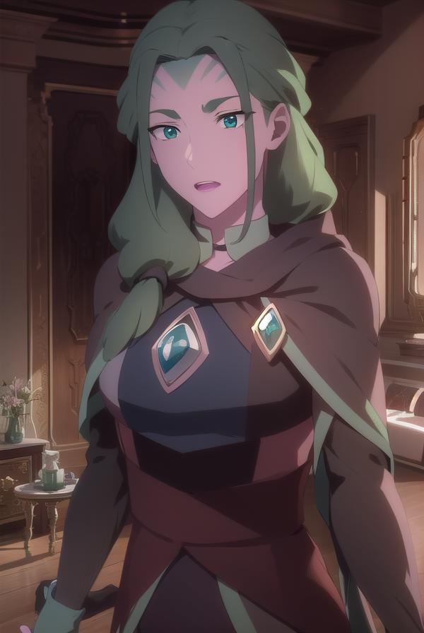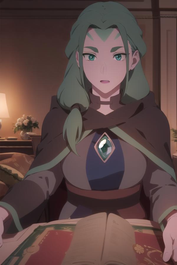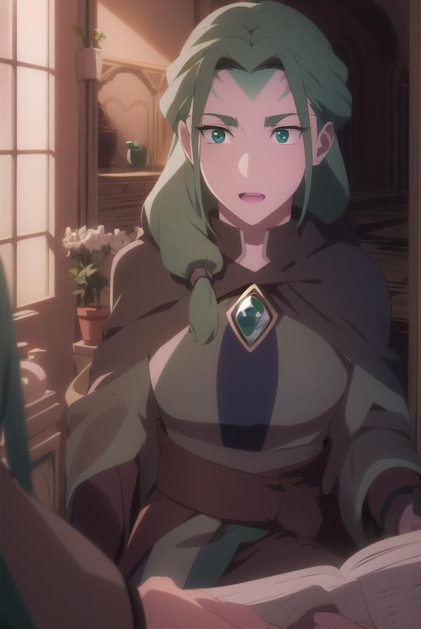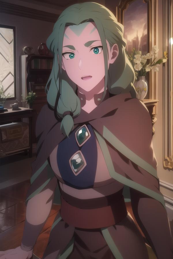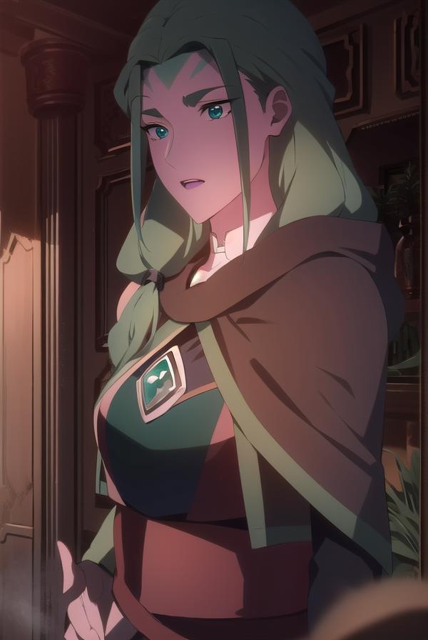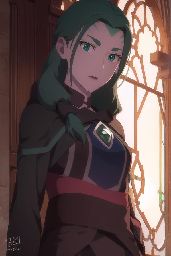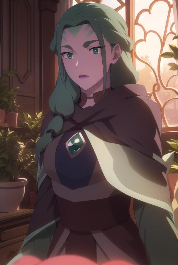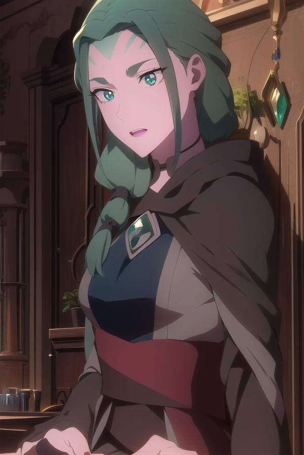 auroth, long hair, facial mark, (green eyes:1.5), braid,