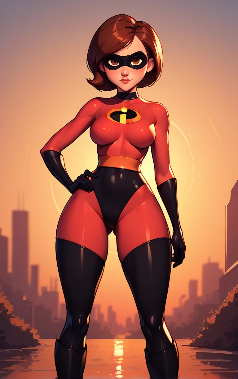 1girl, black mask, breasts, brown eyes, brown hair, domino mask, short hair, swept bangs, narrow waist, wide hips,