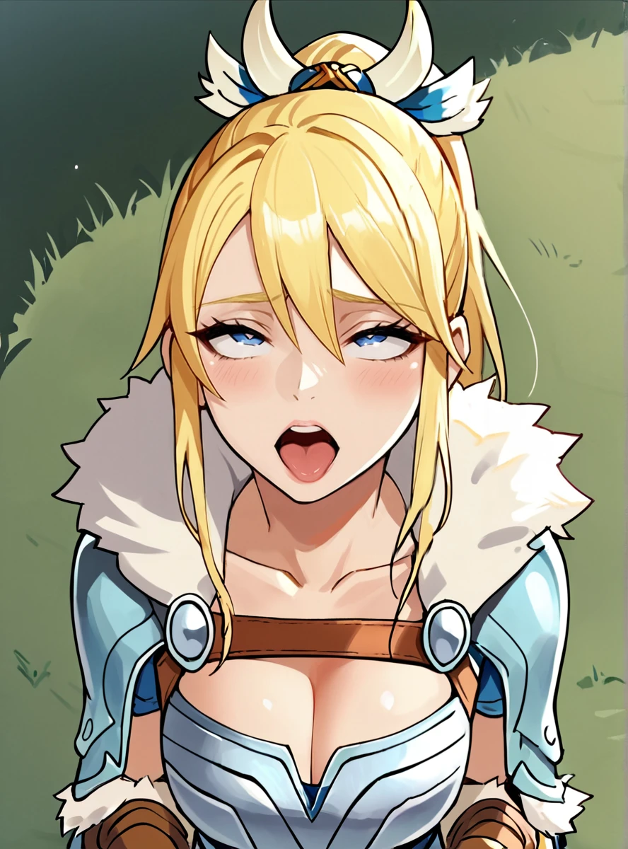 Prompts: 1girl, blonde hair, blue eyes, long hair, ponytail, armor, gloves, thighhighs, cleavage, fur trim, brown gloves,large breasts,