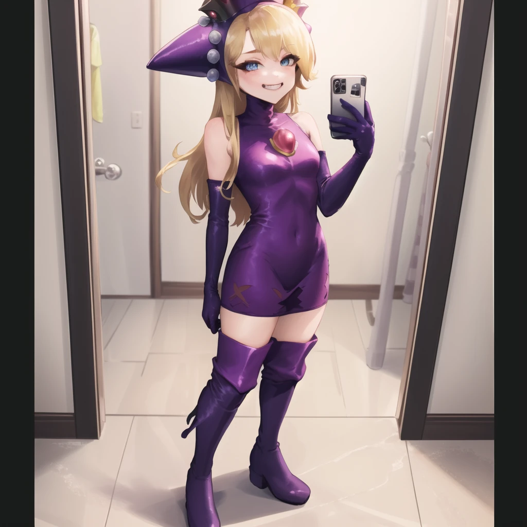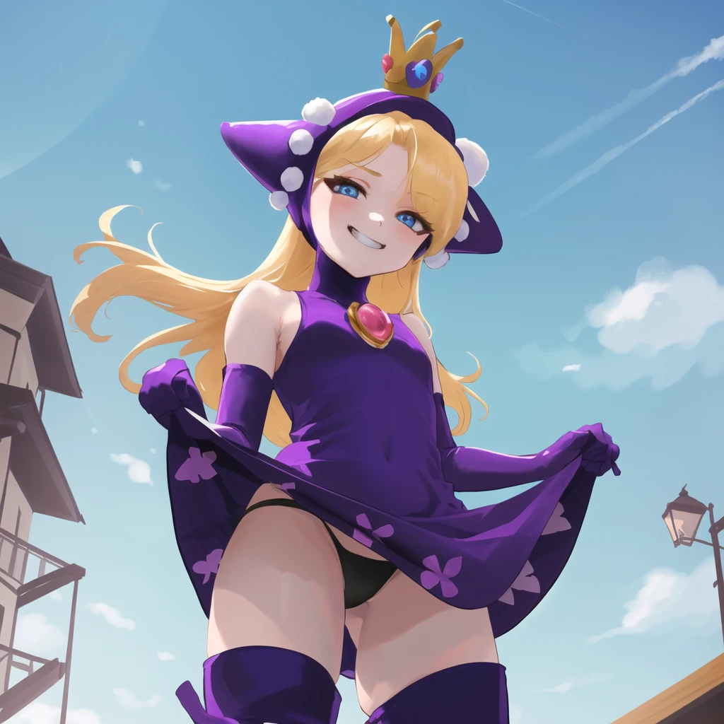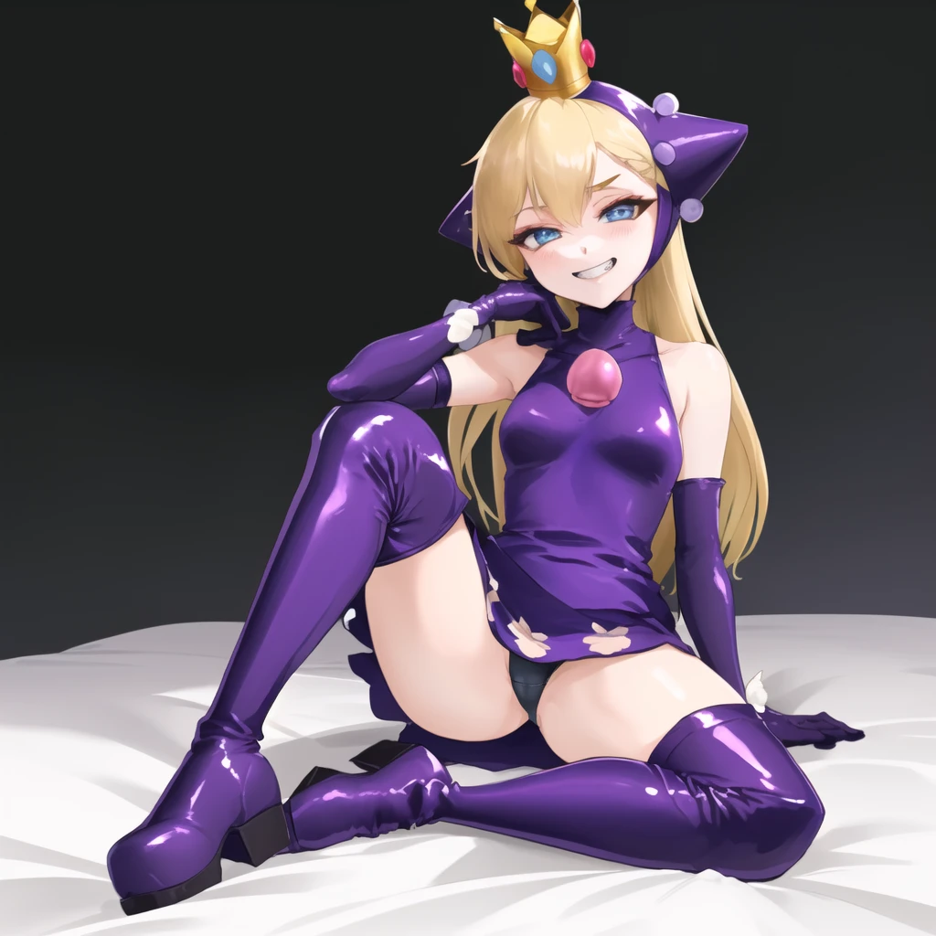 Additional triggers/tags: purple dress, purple headwear, purple elbow gloves, knee boots, crown, blonde hair, blue eyes, smirk