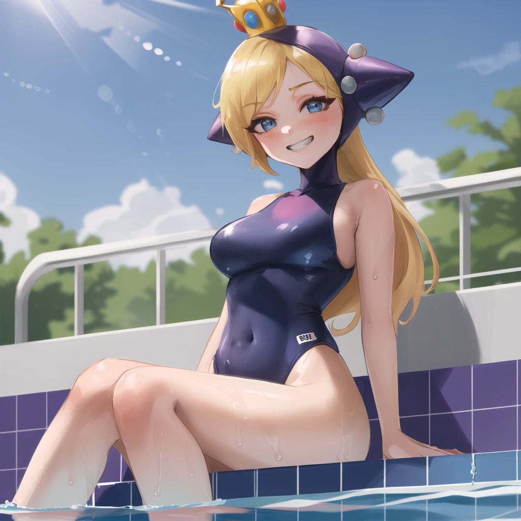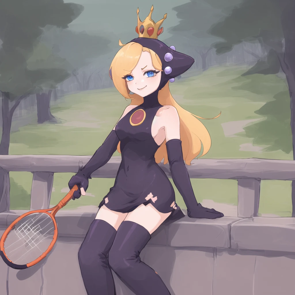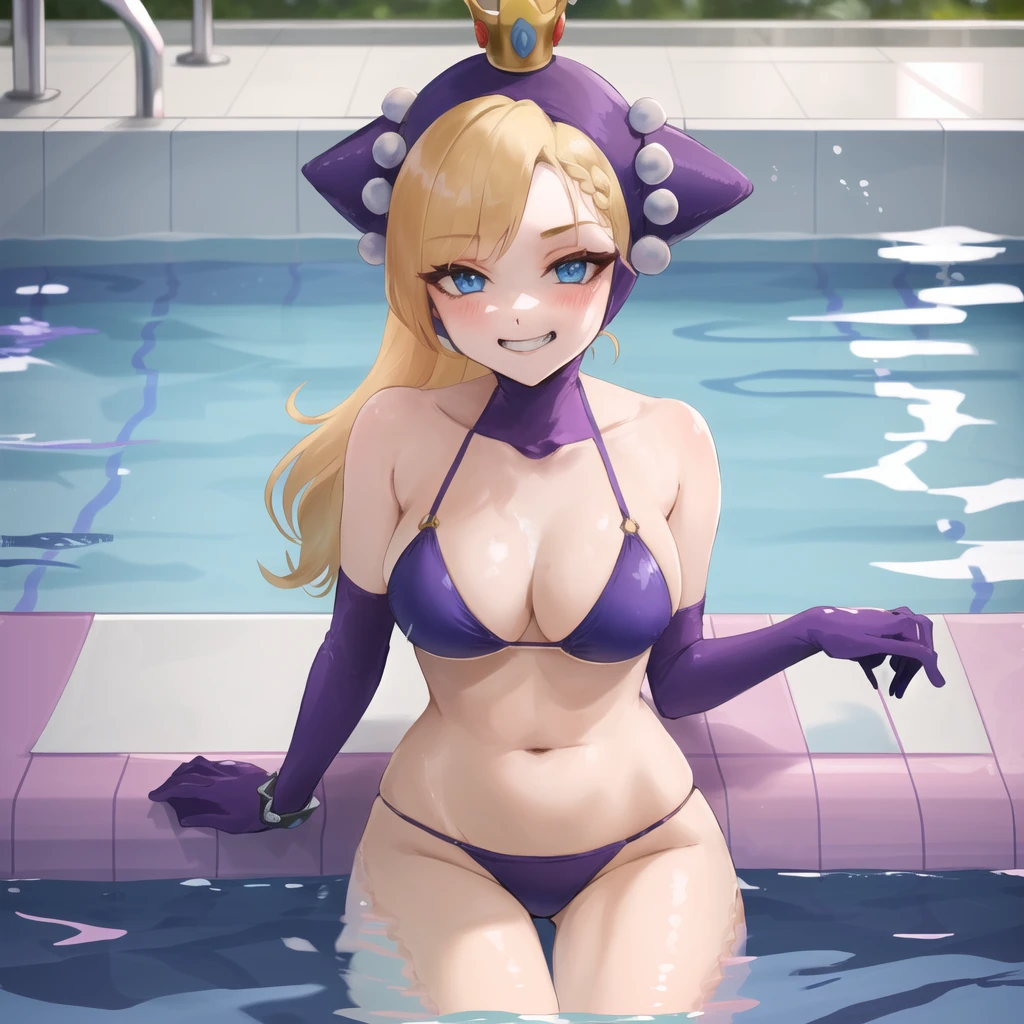Additional triggers/tags: purple dress, purple headwear, purple elbow gloves, knee boots, crown, blonde hair, blue eyes, smirk