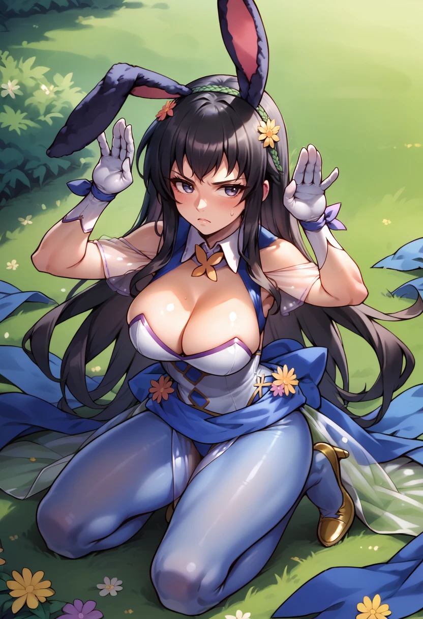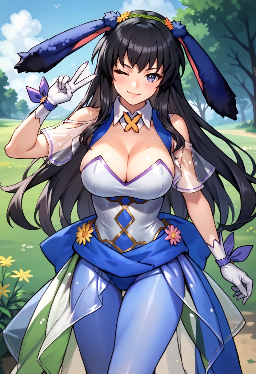 Spring Reveries (FEH): sprKarla, long hair, playboy bunny, detached collar, large breasts, cleavage, short sleeves, shoulder cutout, see-through sleeves, white gloves, see-through skirt, blue pantyhose, high heels, gold footwear