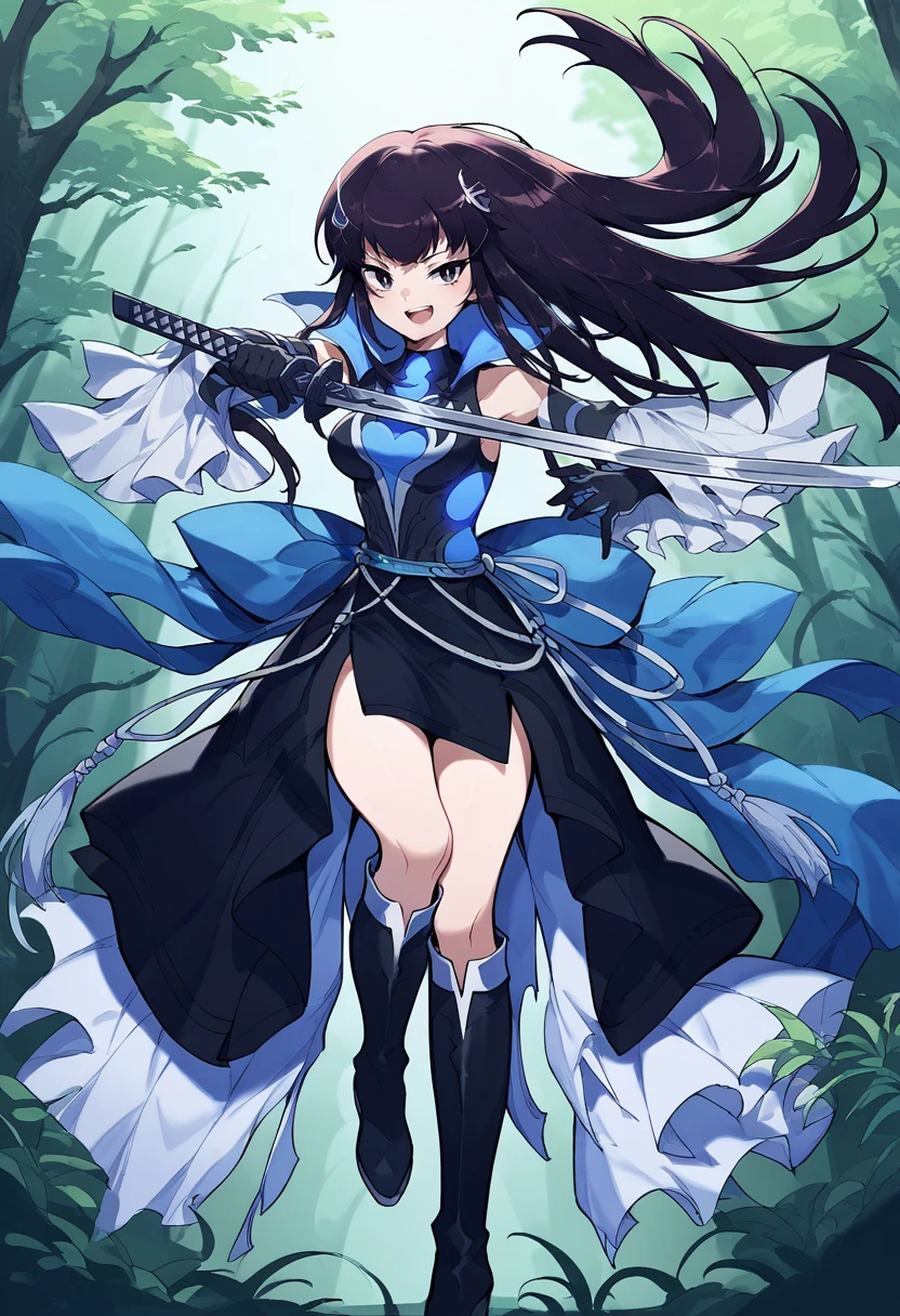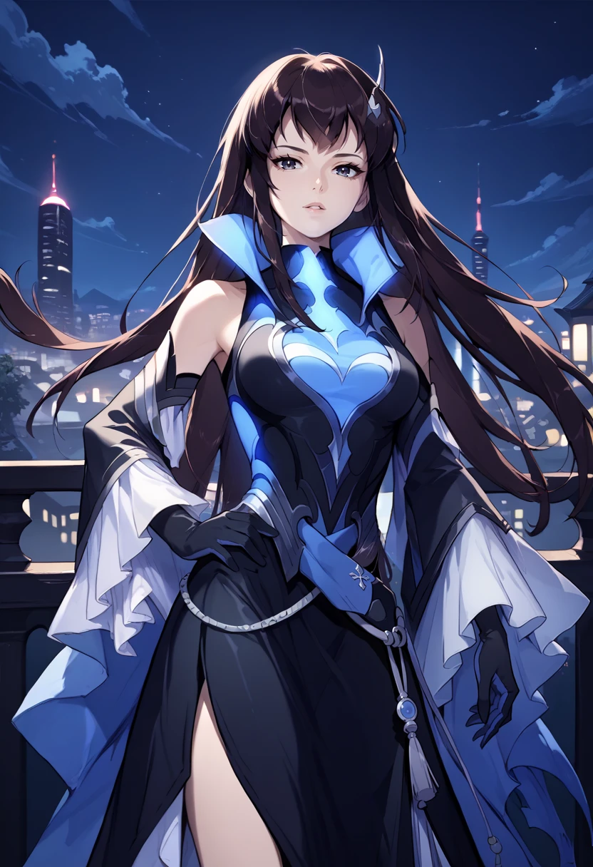 Resplendent (FEH): resKarla, long hair, hairclip, black dress, high collar, detached sleeves, wide sleeves, black gloves, knee boots, black footwear